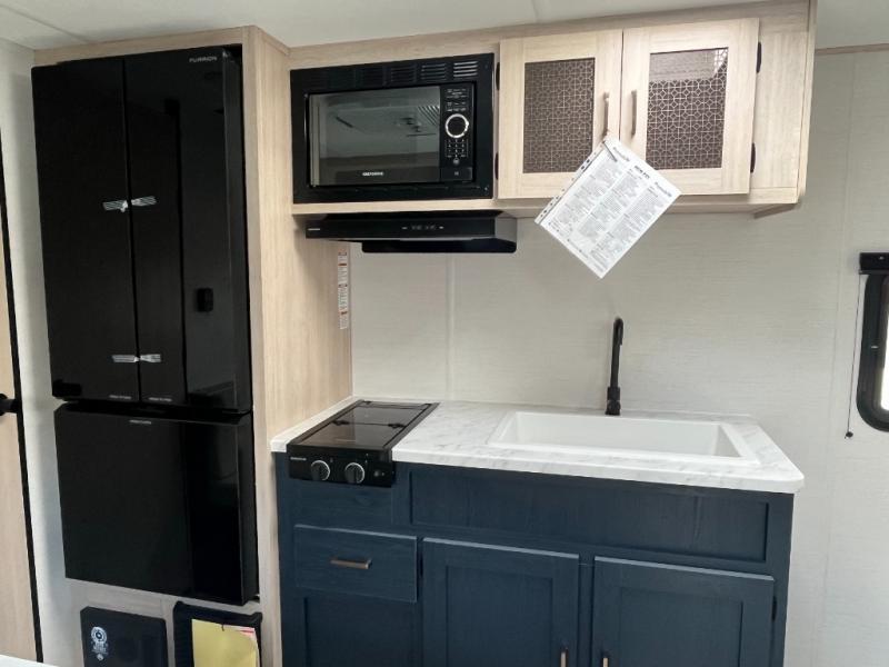 You'll love spending time outdoors with the LED-lit power awning. When you get tired from your day of hiking, relax on the front bed with dual wardrobes and overhead cabinets to hold your clothing and such. And you'll appreciate the extra lighting from the kitchen skylight as you cook with the two-burner cooktop or microwave.