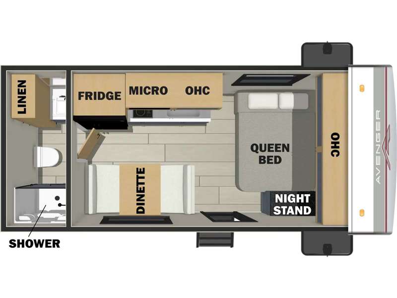 With any Avenger LT travel trailer by Prime Time, the exterior includes an aerodynamic smooth front metal, a front diamond plate for protection on the road, and two stabilizer jacks. There is also exclusive Everlast construction, a PVC roof membrane, and solar prep for the option to go off-grid. The interior offers seamless Carefree Congoleum flooring for easy cleanup and durability, pleated night shades throughout for privacy, a bottle opener, and residential extended ball bearing drawer guides.