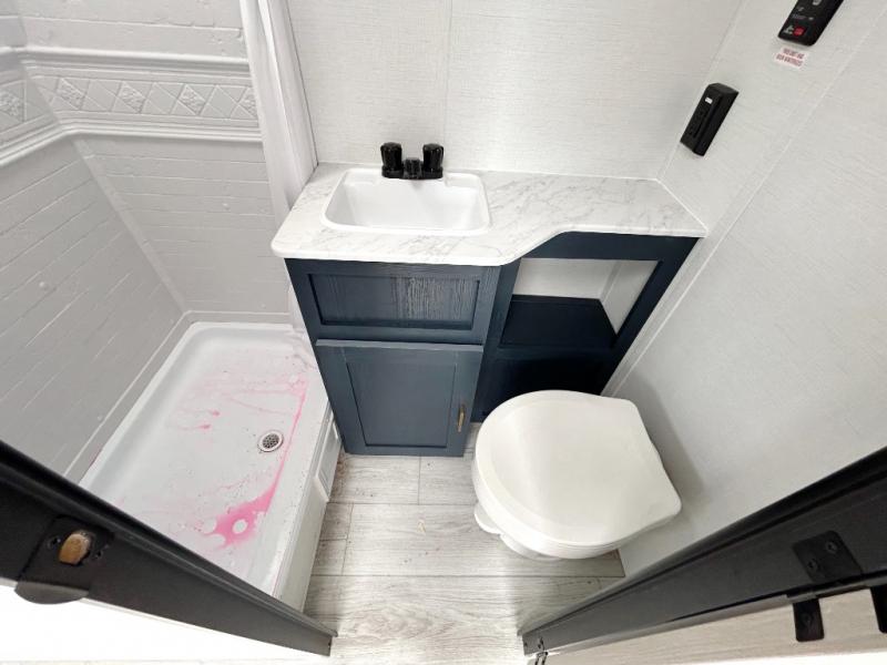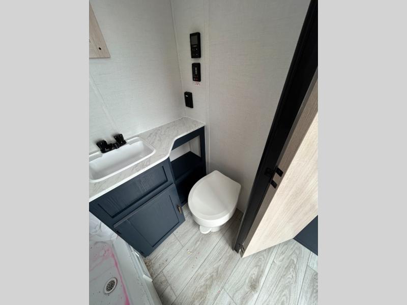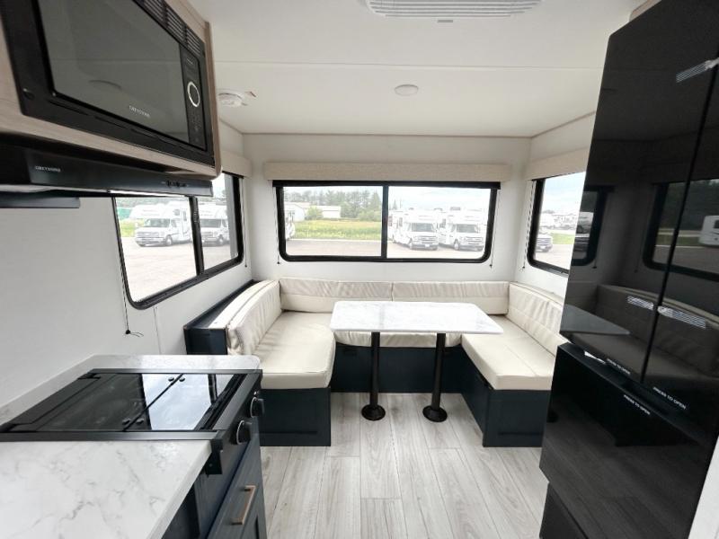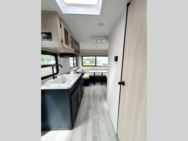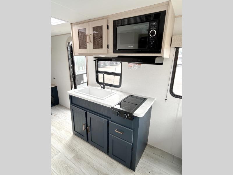 Camping with your friends or family doesn't have to be hard! This easy-to-tow, store and clean up RV allows two to four people to sleep comfortably on the U-shaped dinette along the rear wall with a large window and the front bed with nightstand. The kitchen includes a 10.7 cu. ft. 12V refrigerator, a microwave, plus a two-burner cooktop for preparing meals just like you do at home.