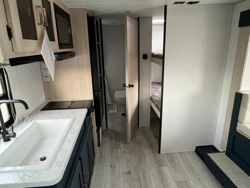 Go hiking, biking or exploring for new places when you have this trailer at the campgrounds! You will find sleeping for five between the rear corner bunk beds, and the front bed with a nightstand for your cellphones and such. And one more can sleep on the dinette slide. You'll be delighted with the kitchen skylight that gives natural lighting as you cook a meal. The LED-lit power awning provides a protected outdoor living area as you visit or make s'mores around the campfire.