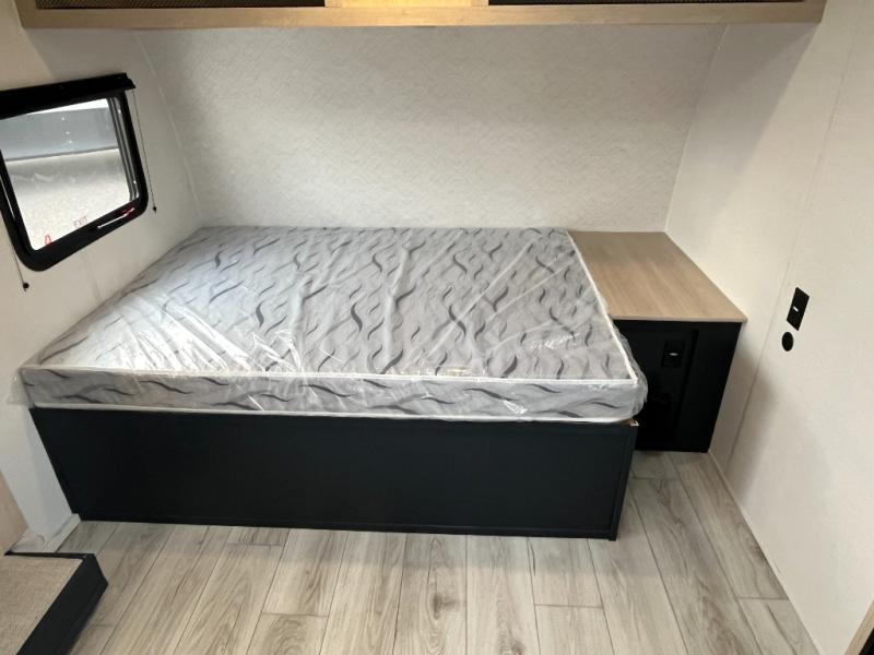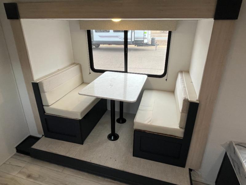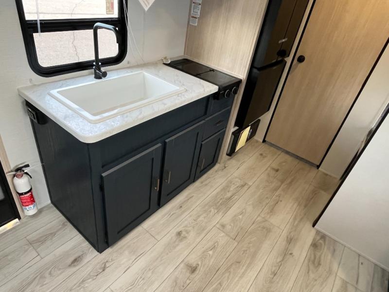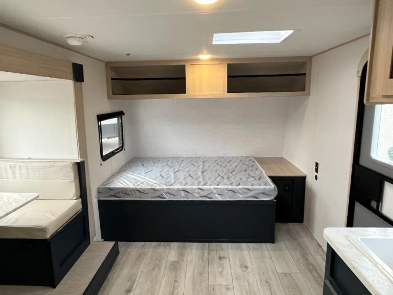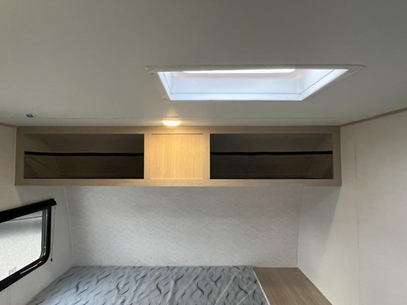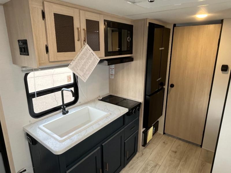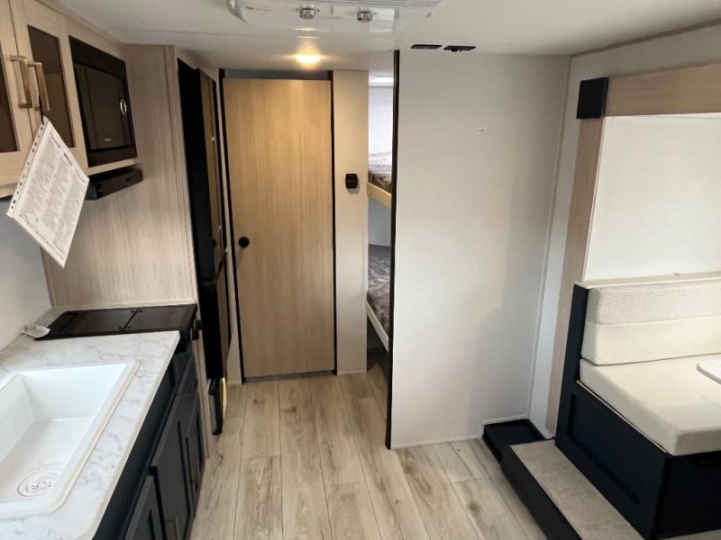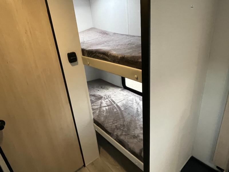 Go hiking, biking or exploring for new places when you have this trailer at the campgrounds! You will find sleeping for five between the rear corner bunk beds, and the front bed with a nightstand for your cellphones and such. And one more can sleep on the dinette slide. You'll be delighted with the kitchen skylight that gives natural lighting as you cook a meal. The LED-lit power awning provides a protected outdoor living area as you visit or make s'mores around the campfire.