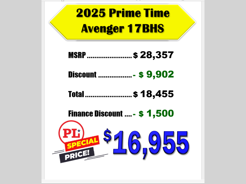New 2025 Prime Time RV Avenger LT 17BHS Travel Trailer