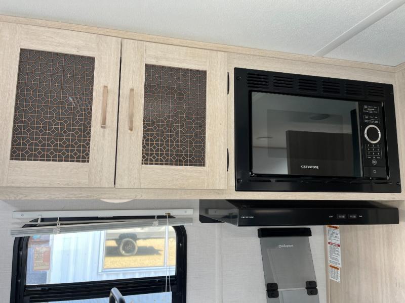 Go hiking, biking or exploring for new places when you have this trailer at the campgrounds! You will find sleeping for five between the rear corner bunk beds, and the front bed with a nightstand for your cellphones and such. And one more can sleep on the dinette slide. You'll be delighted with the kitchen skylight that gives natural lighting as you cook a meal. The LED-lit power awning provides a protected outdoor living area as you visit or make s'mores around the campfire.
