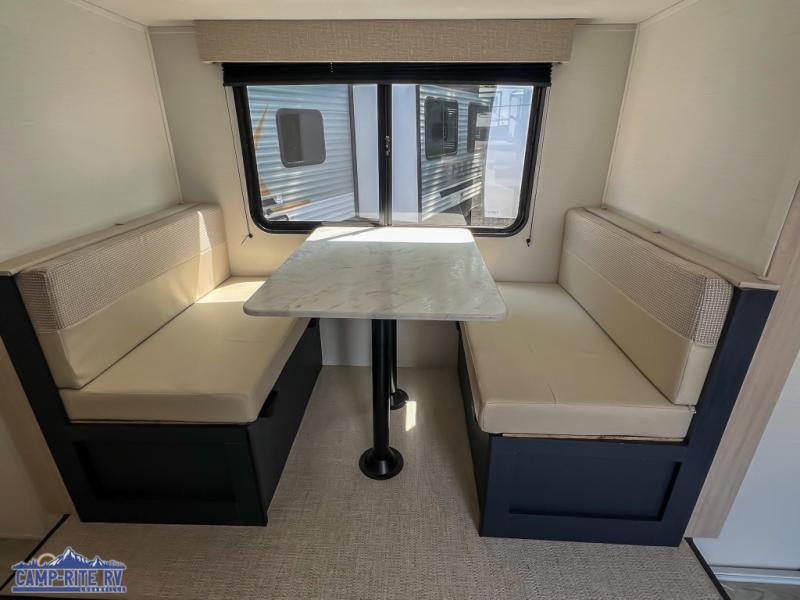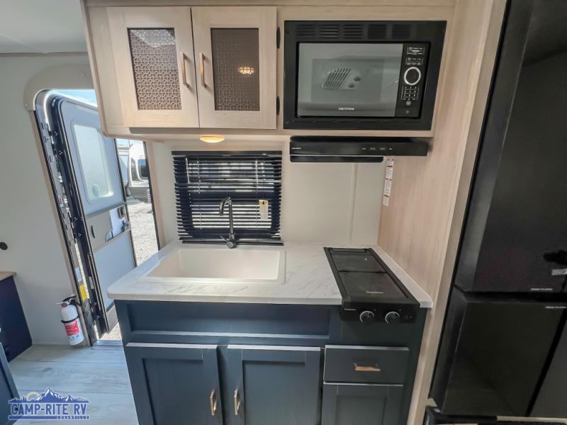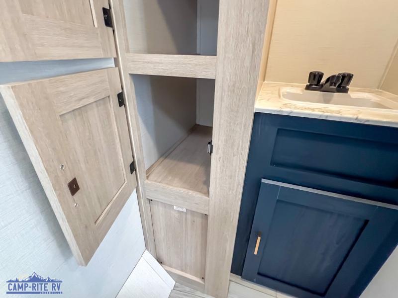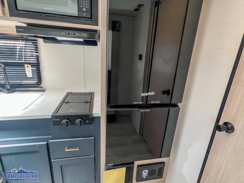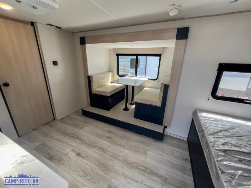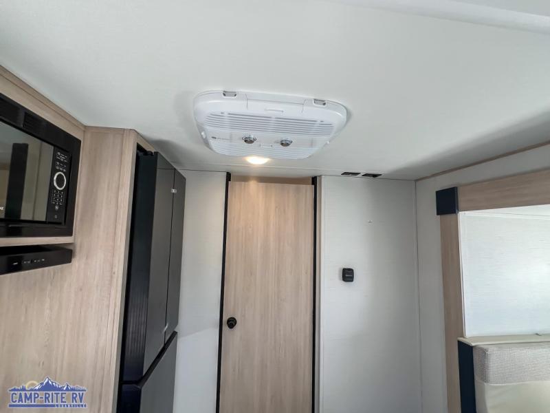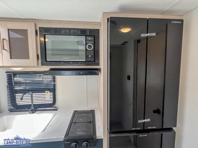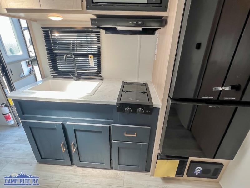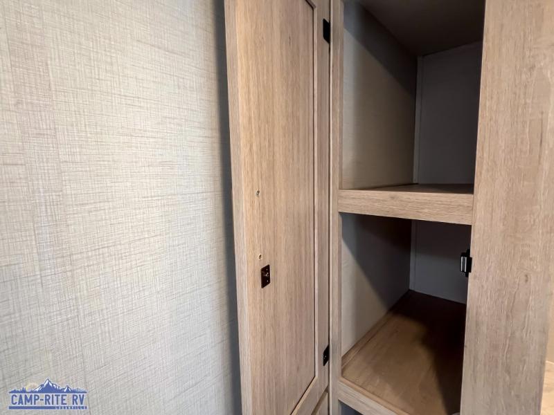 Enjoy a little more floor space in this trailer thanks to the dinette slide that can be utilized as a dining, gaming and/or sleeping space. The front walk-around queen bed offers overhead storage and dual wardrobes to keep this area tidy. The galley kitchen includes everything you need to make warm meals, and store leftovers in the 10.7 cu. ft. 12V refrigerator, plus there is a pantry for dry good storage. The rear bathroom offers privacy and convenience when changing and getting cleaned up, and there is also linen storage which is handy.