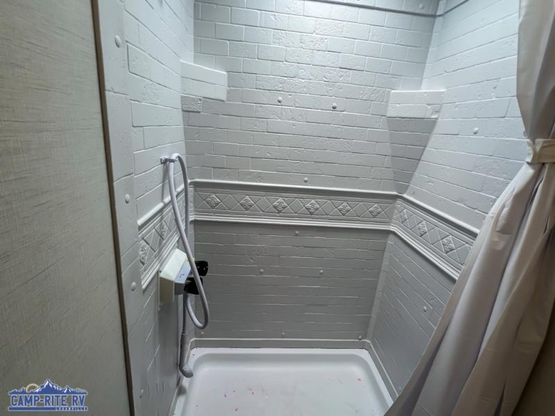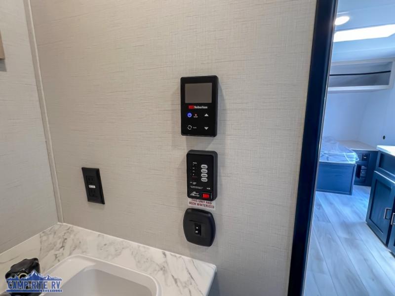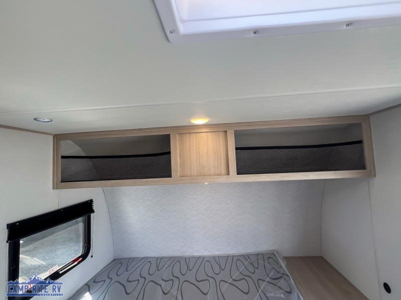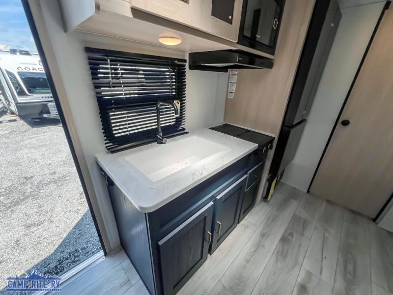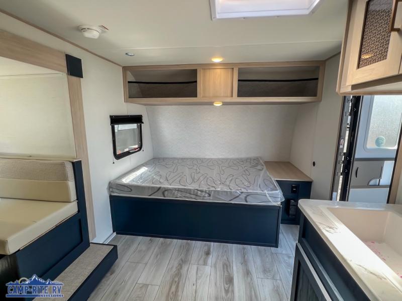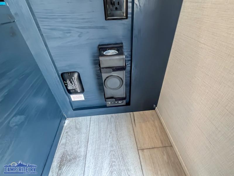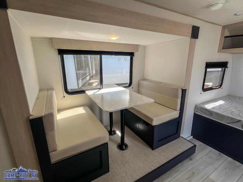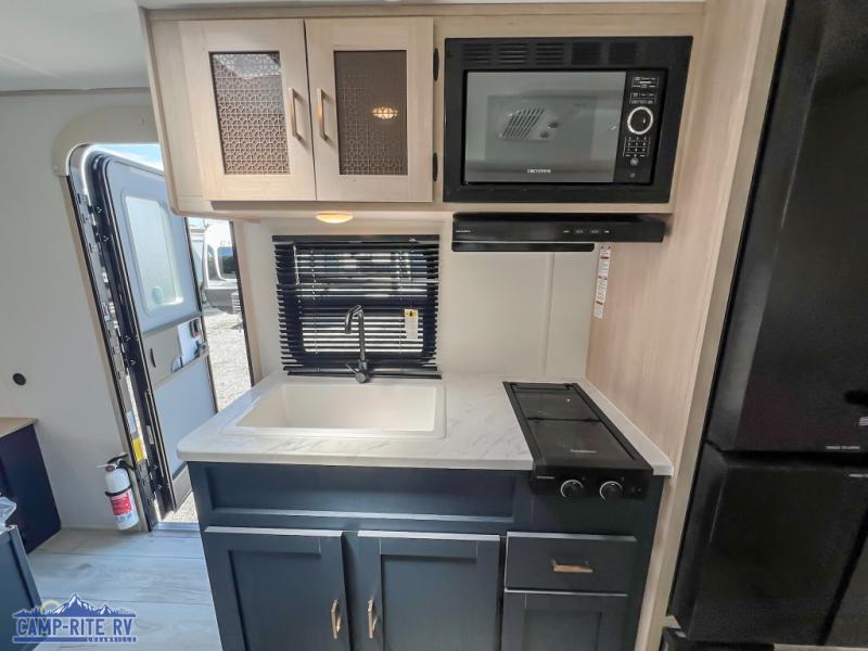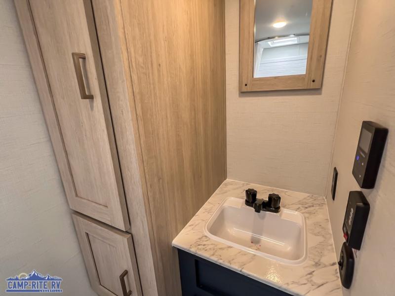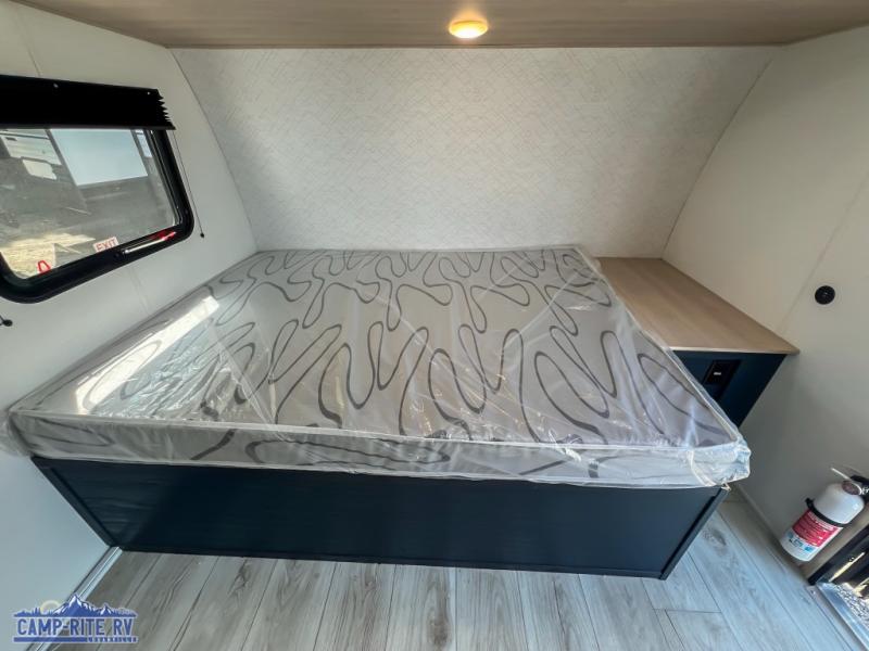 Enjoy a little more floor space in this trailer thanks to the dinette slide that can be utilized as a dining, gaming and/or sleeping space. The front walk-around queen bed offers overhead storage and dual wardrobes to keep this area tidy. The galley kitchen includes everything you need to make warm meals, and store leftovers in the 10.7 cu. ft. 12V refrigerator, plus there is a pantry for dry good storage. The rear bathroom offers privacy and convenience when changing and getting cleaned up, and there is also linen storage which is handy.
