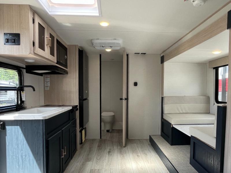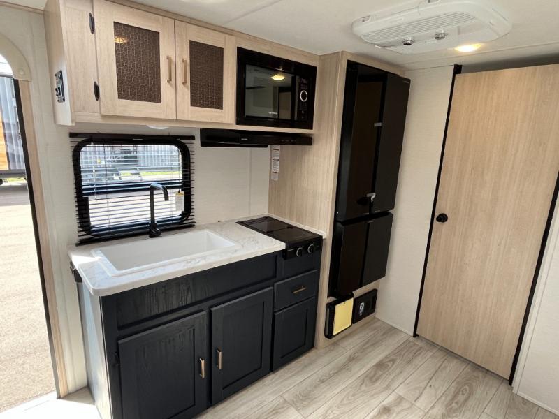Enjoy a little more floor space in this trailer thanks to the dinette slide that can be utilized as a dining, gaming and/or sleeping space. The front walk-around queen bed offers overhead storage and dual wardrobes to keep this area tidy. The galley kitchen includes everything you need to make warm meals, and store leftovers in the 10.7 cu. ft. 12V refrigerator, plus there is a pantry for dry good storage. The rear bathroom offers privacy and convenience when changing and getting cleaned up, and there is also linen storage which is handy.