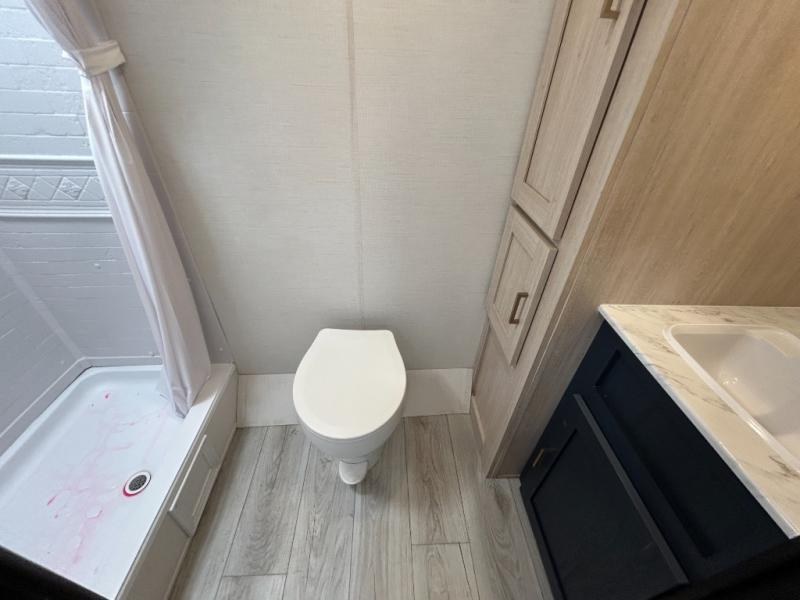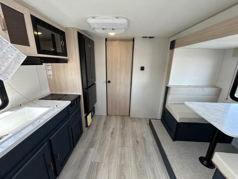 Enjoy a little more floor space in this trailer thanks to the dinette slide that can be utilized as a dining, gaming and/or sleeping space. The front walk-around queen bed offers overhead storage and dual wardrobes to keep this area tidy. The galley kitchen includes everything you need to make warm meals, and store leftovers in the 10.7 cu. ft. 12V refrigerator, plus there is a pantry for dry good storage. The rear bathroom offers privacy and convenience when changing and getting cleaned up, and there is also linen storage which is handy.