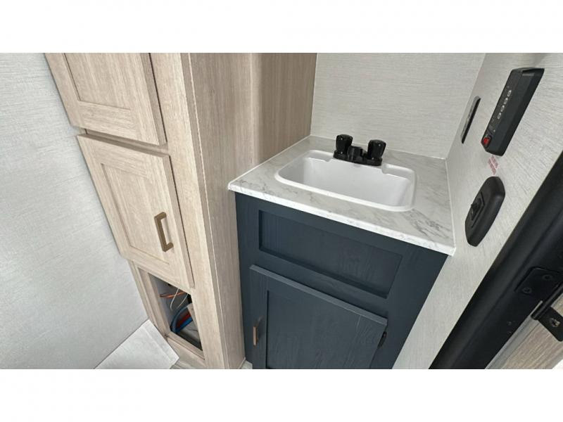 Enjoy a little more floor space in this trailer thanks to the dinette slide that can be utilized as a dining, gaming and/or sleeping space. The front walk-around queen bed offers overhead storage and dual wardrobes to keep this area tidy. The galley kitchen includes everything you need to make warm meals, and store leftovers in the 10.7 cu. ft. 12V refrigerator, plus there is a pantry for dry good storage. The rear bathroom offers privacy and convenience when changing and getting cleaned up, and there is also linen storage which is handy.