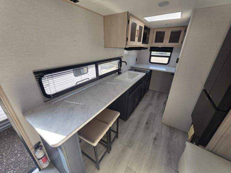 Camping in this travel trailer will be just what the doctor ordered! The rear corner kitchen includes ample counter space to prep meals, along with a desktop if you need to get some work done. The bartop with two stools will provide a place to dine together, and the sofa lets you relax in the evenings. Cook all of your meals on the two burner cooktop or in the electric microwave, and store your food in the 10.7 cu. ft. 12V refrigerator. A full bath lets you freshen up before bed, and the nightstand at the foot of the queen bed will keep your belongings tucked away!