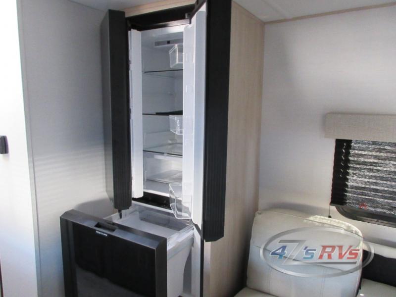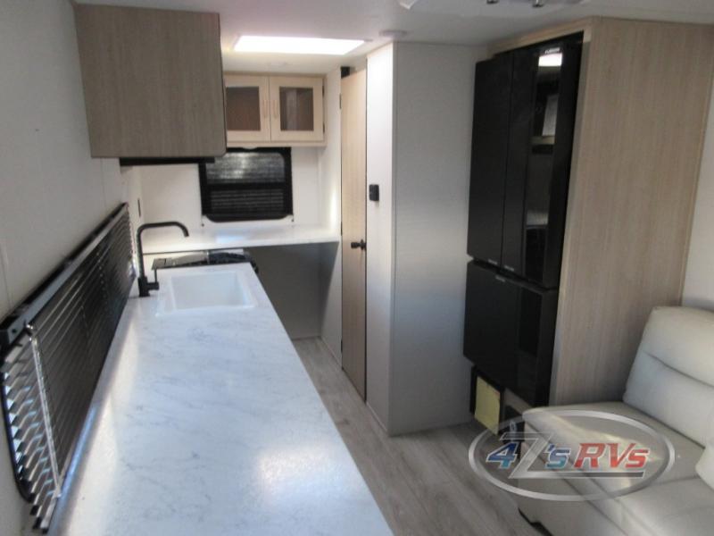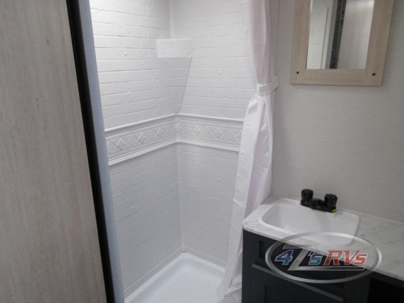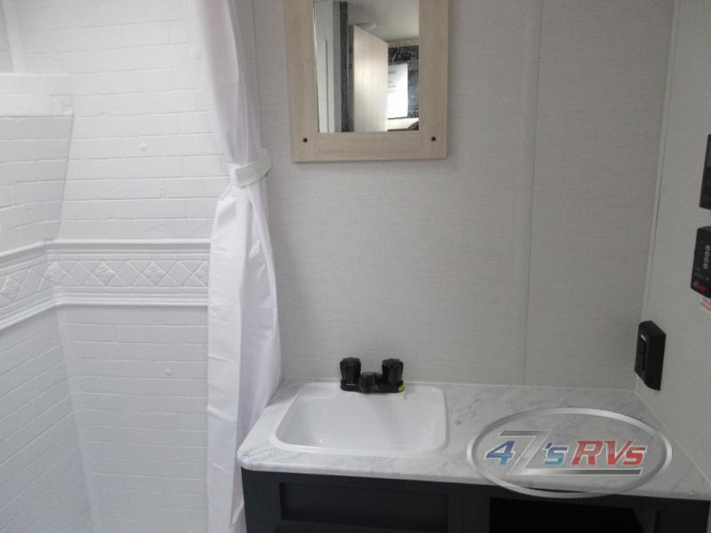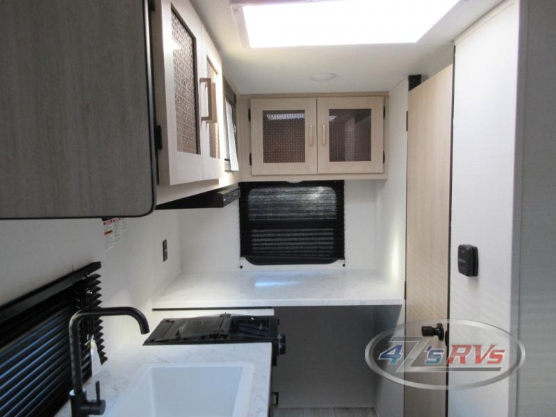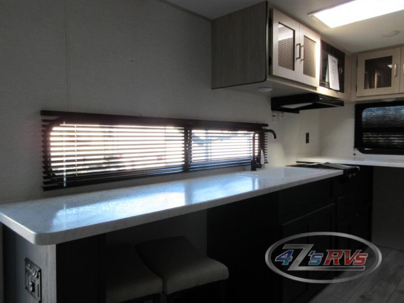 Camping in this travel trailer will be just what the doctor ordered! The rear corner kitchen includes ample counter space to prep meals, along with a desktop if you need to get some work done. The bartop with two stools will provide a place to dine together, and the sofa lets you relax in the evenings. Cook all of your meals on the two burner cooktop or in the electric microwave, and store your food in the 10.7 cu. ft. 12V refrigerator. A full bath lets you freshen up before bed, and the nightstand at the foot of the queen bed will keep your belongings tucked away!