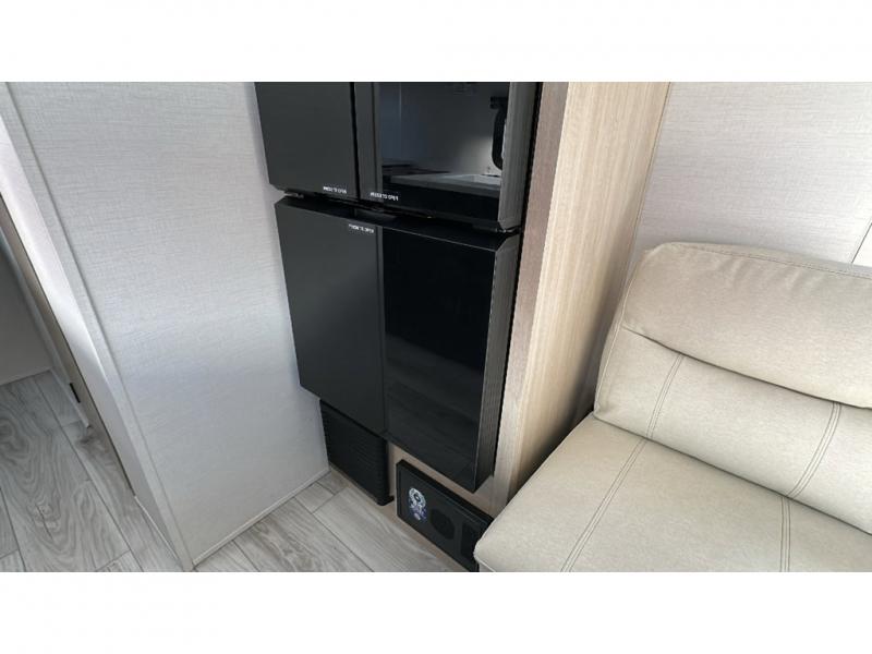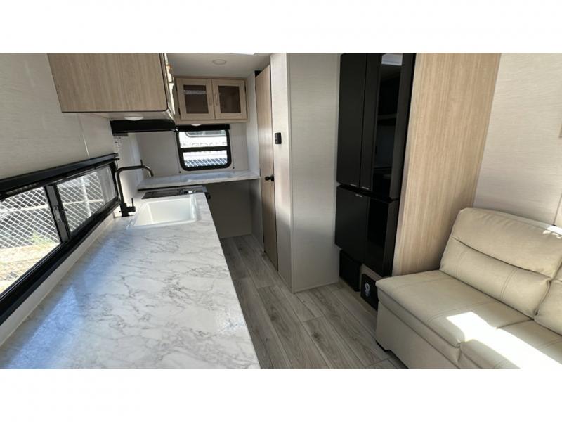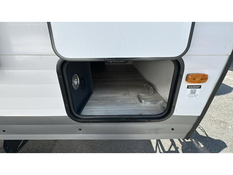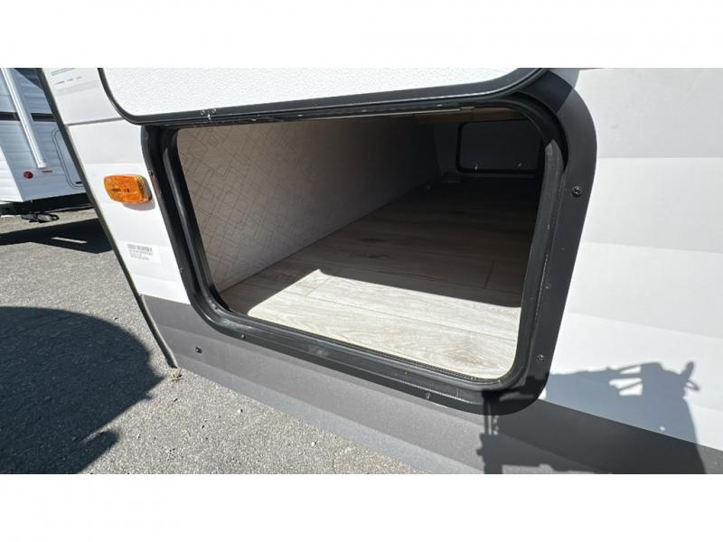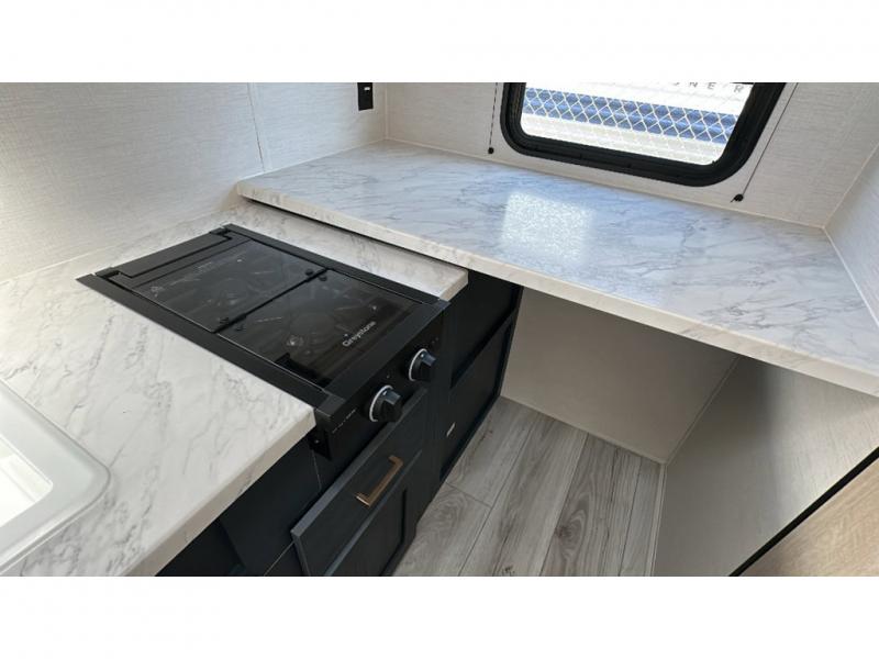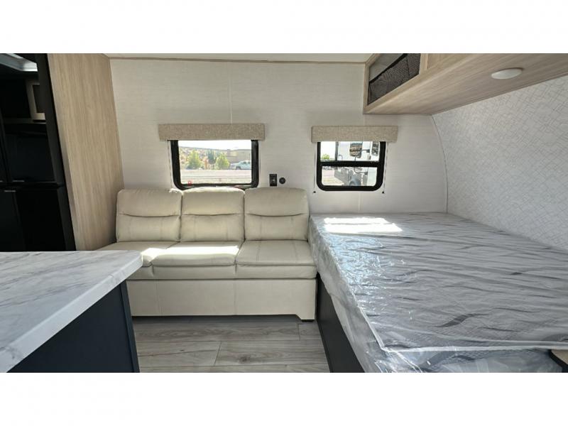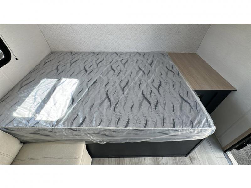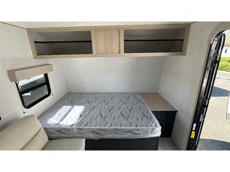 Camping in this travel trailer will be just what the doctor ordered! The rear corner kitchen includes ample counter space to prep meals, along with a desktop if you need to get some work done. The bartop with two stools will provide a place to dine together, and the sofa lets you relax in the evenings. Cook all of your meals on the two burner cooktop or in the electric microwave, and store your food in the 10.7 cu. ft. 12V refrigerator. A full bath lets you freshen up before bed, and the nightstand at the foot of the queen bed will keep your belongings tucked away!