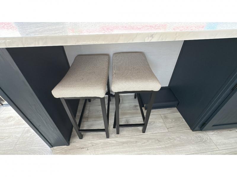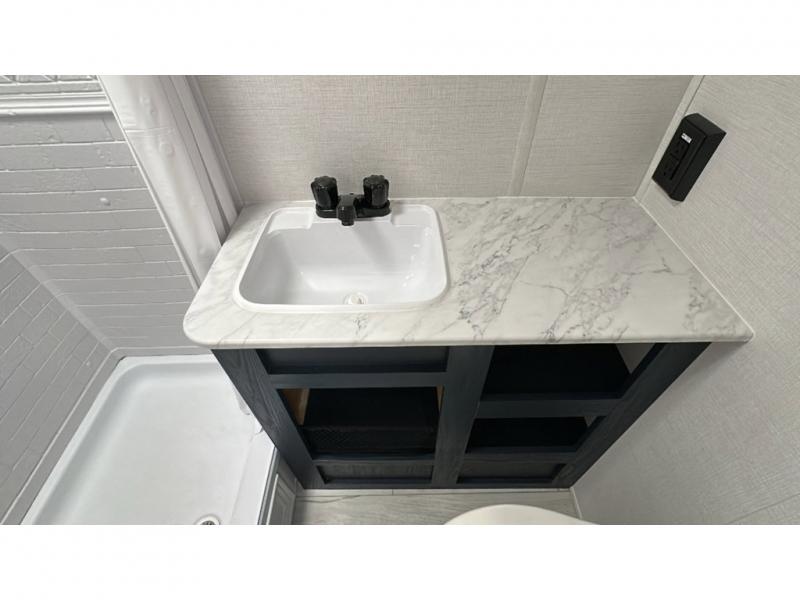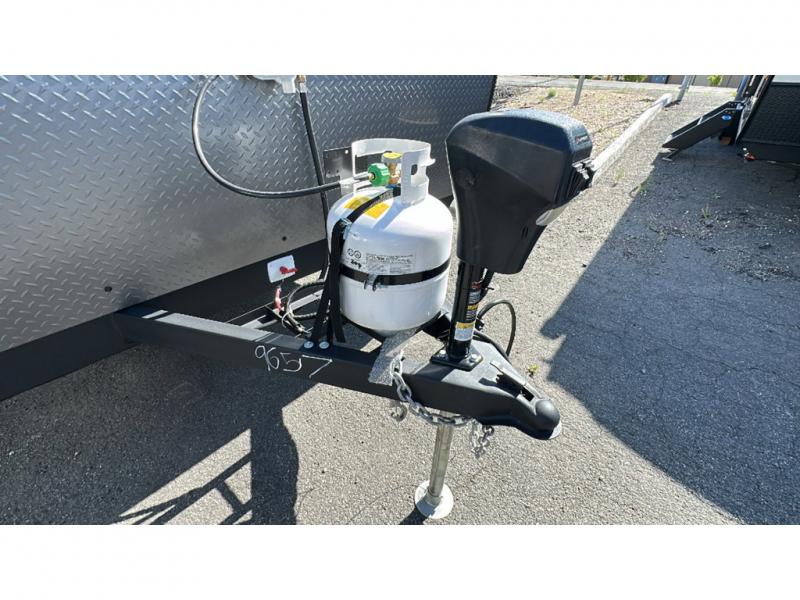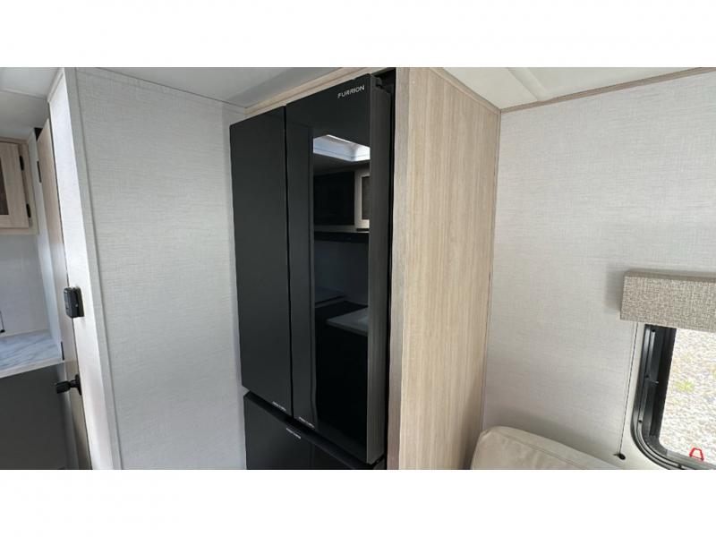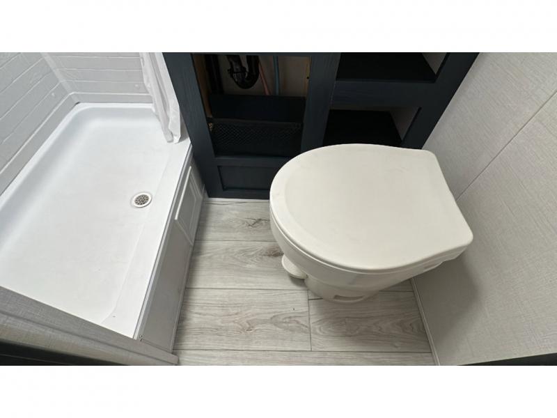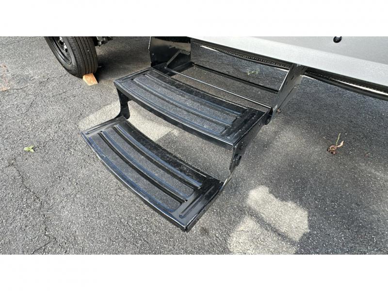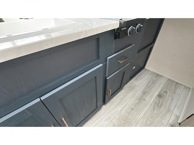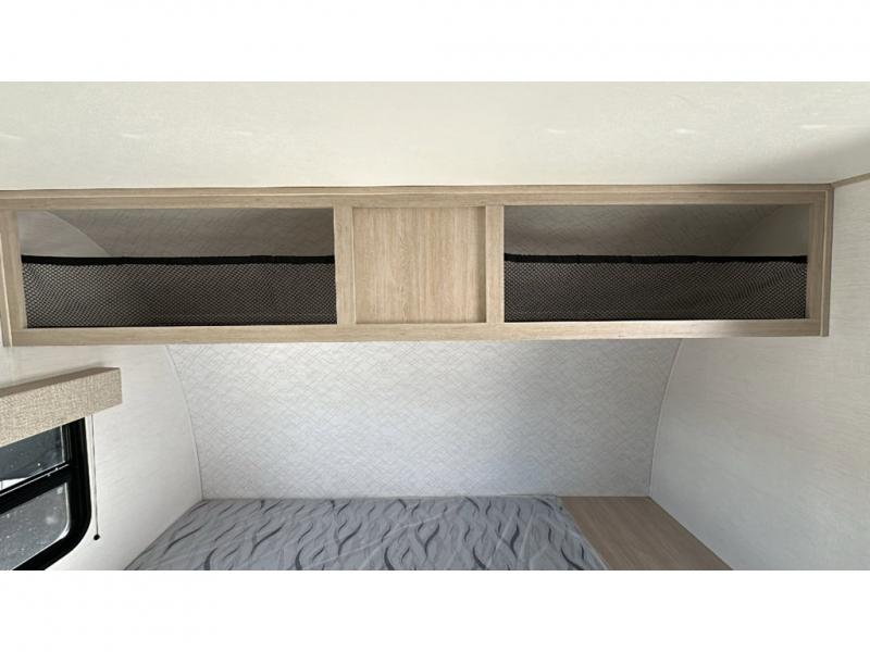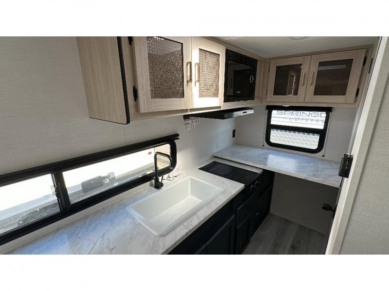 Camping in this travel trailer will be just what the doctor ordered! The rear corner kitchen includes ample counter space to prep meals, along with a desktop if you need to get some work done. The bartop with two stools will provide a place to dine together, and the sofa lets you relax in the evenings. Cook all of your meals on the two burner cooktop or in the electric microwave, and store your food in the 10.7 cu. ft. 12V refrigerator. A full bath lets you freshen up before bed, and the nightstand at the foot of the queen bed will keep your belongings tucked away!