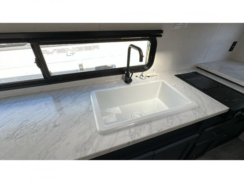 With any Avenger LT travel trailer by Prime Time, the exterior includes an aerodynamic smooth front metal, a front diamond plate for protection on the road, and two stabilizer jacks. There is also exclusive Everlast construction, a PVC roof membrane, and solar prep for the option to go off-grid. The interior offers seamless Carefree Congoleum flooring for easy cleanup and durability, pleated night shades throughout for privacy, a bottle opener, and residential extended ball bearing drawer guides.