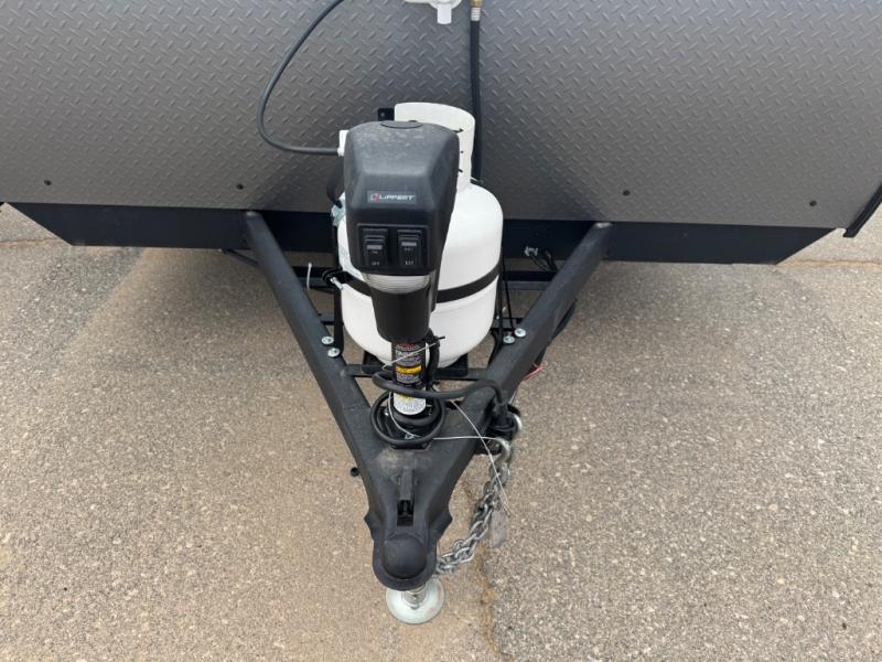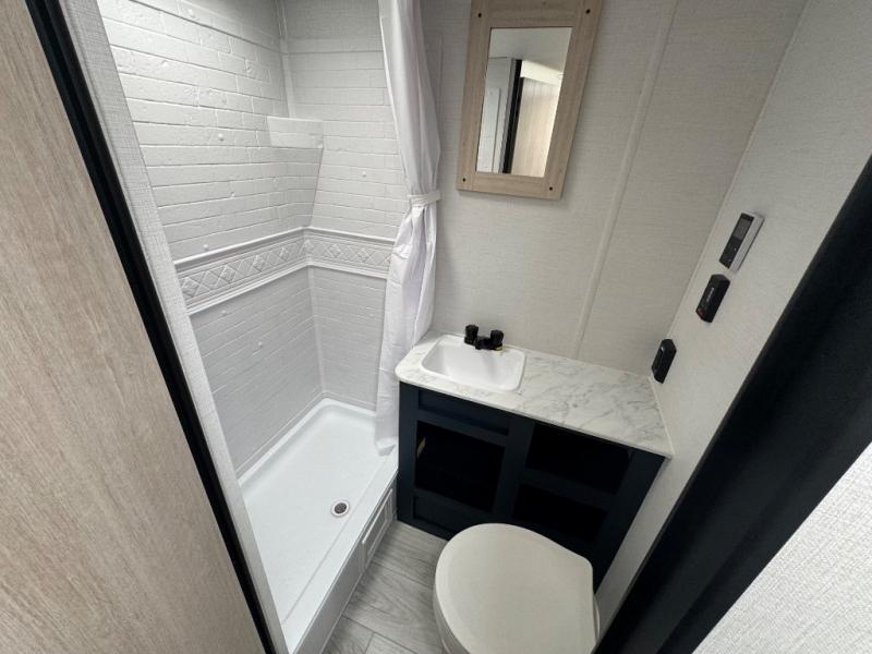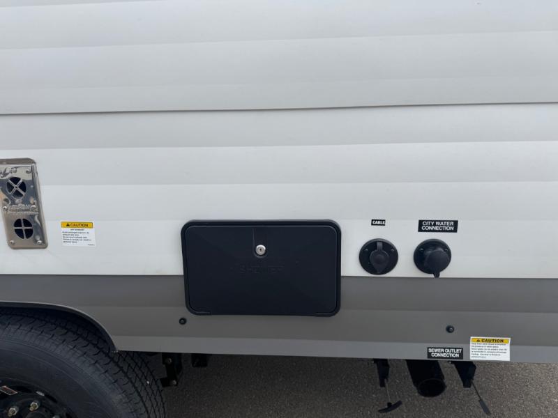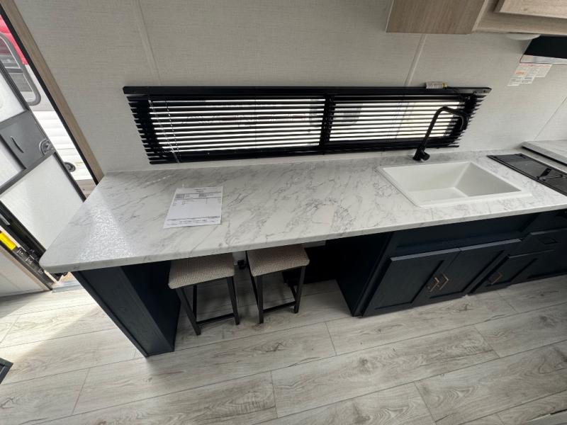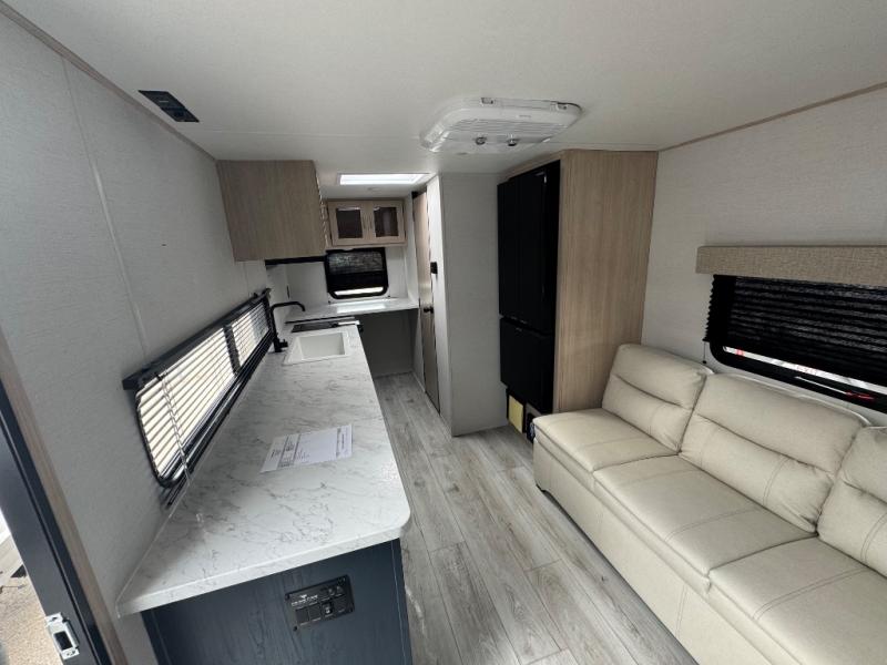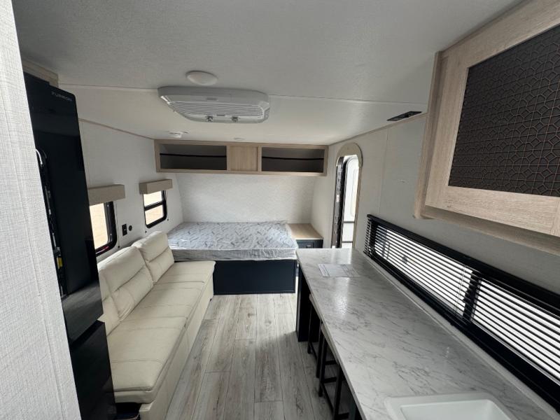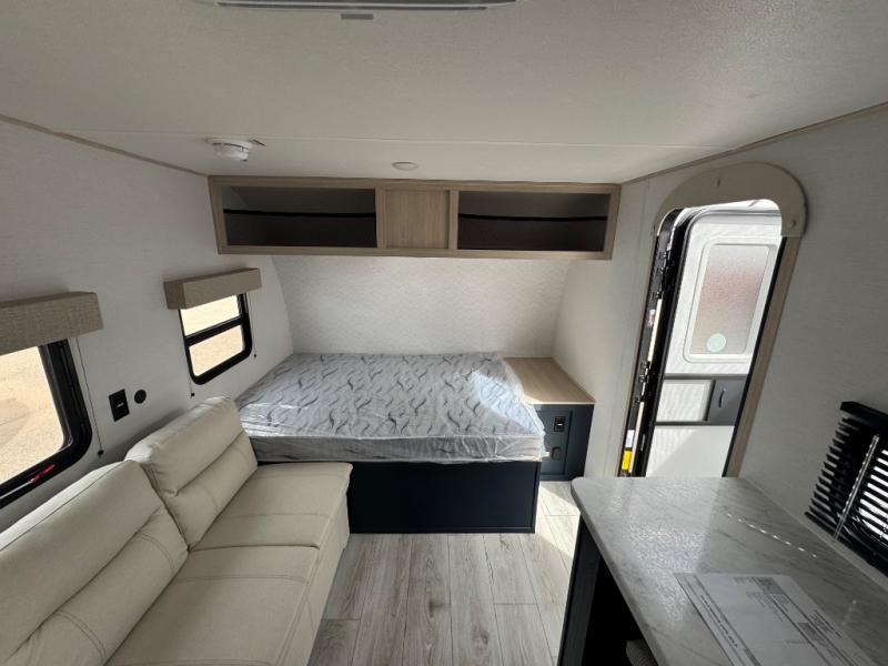 Camping in this travel trailer will be just what the doctor ordered! The rear corner kitchen includes ample counter space to prep meals, along with a desktop if you need to get some work done. The bartop with two stools will provide a place to dine together, and the sofa lets you relax in the evenings. Cook all of your meals on the two burner cooktop or in the electric microwave, and store your food in the 10.7 cu. ft. 12V refrigerator. A full bath lets you freshen up before bed, and the nightstand at the foot of the queen bed will keep your belongings tucked away!
