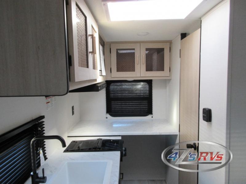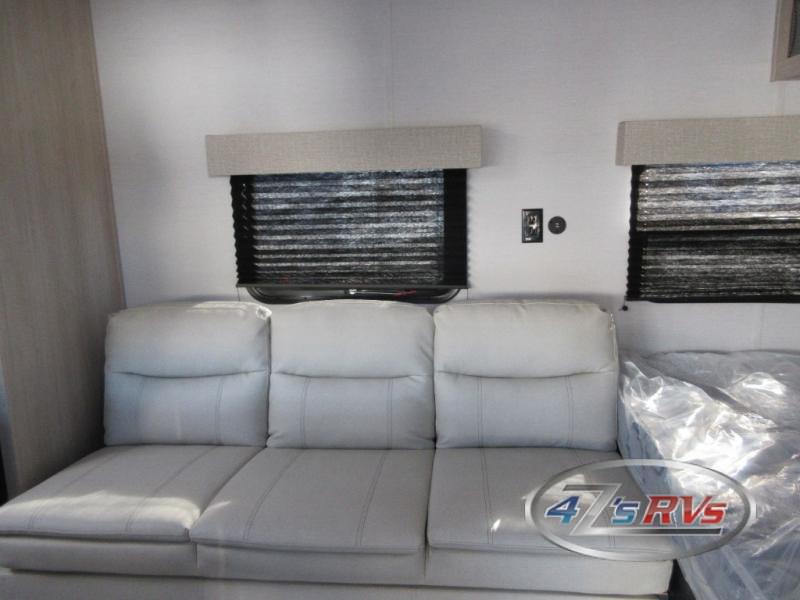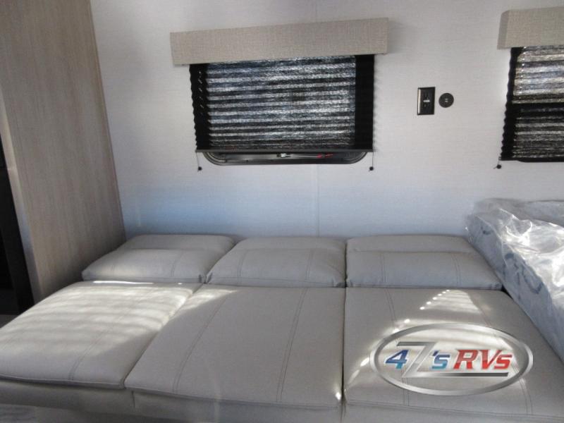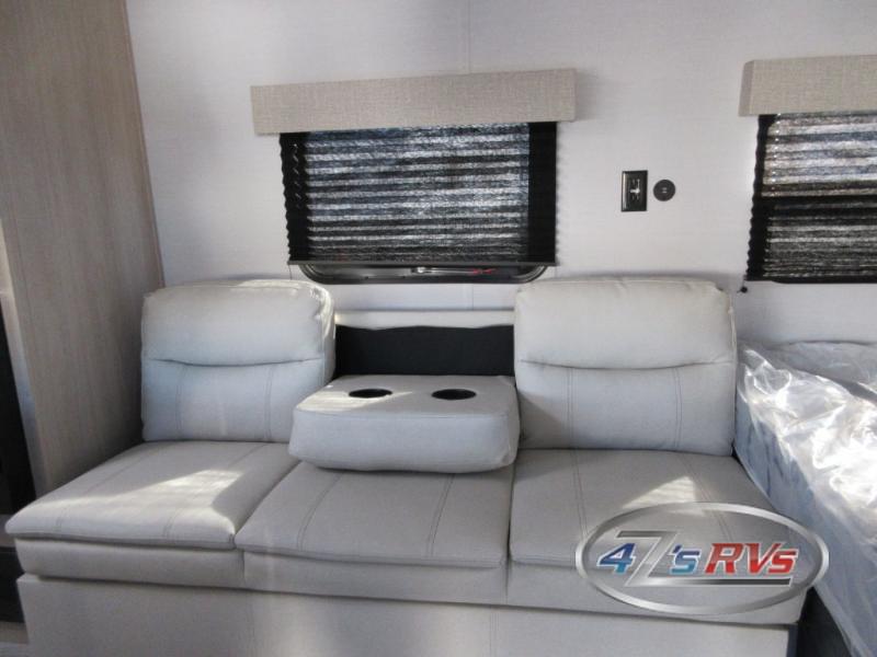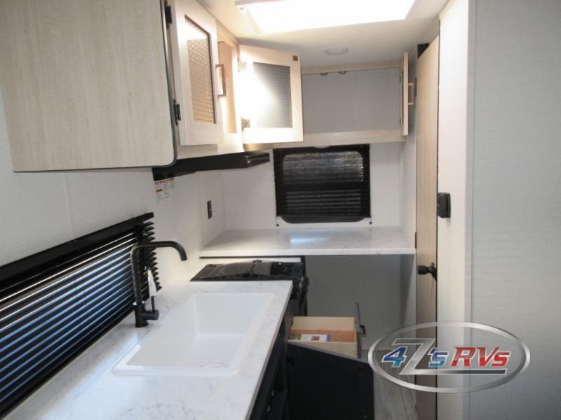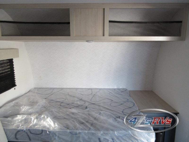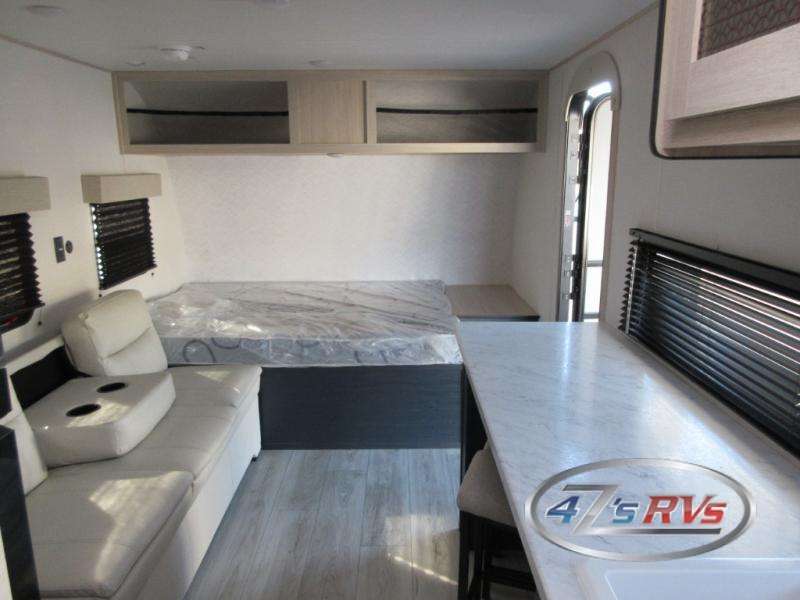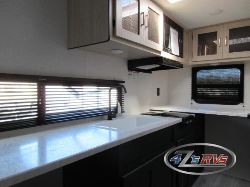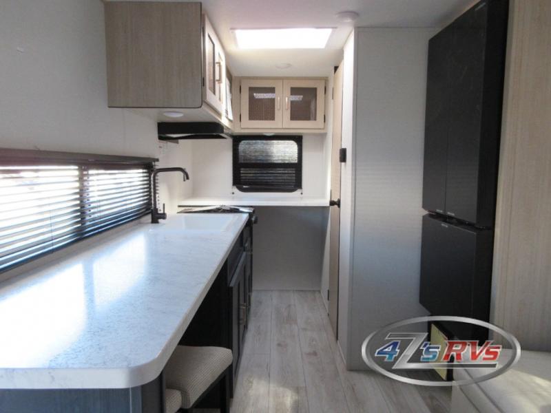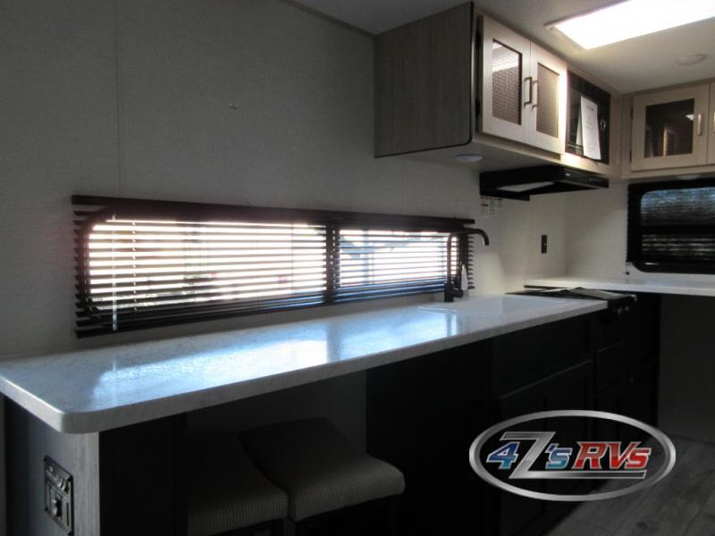 Camping in this travel trailer will be just what the doctor ordered! The rear corner kitchen includes ample counter space to prep meals, along with a desktop if you need to get some work done. The bartop with two stools will provide a place to dine together, and the sofa lets you relax in the evenings. Cook all of your meals on the two burner cooktop or in the electric microwave, and store your food in the 10.7 cu. ft. 12V refrigerator. A full bath lets you freshen up before bed, and the nightstand at the foot of the queen bed will keep your belongings tucked away!