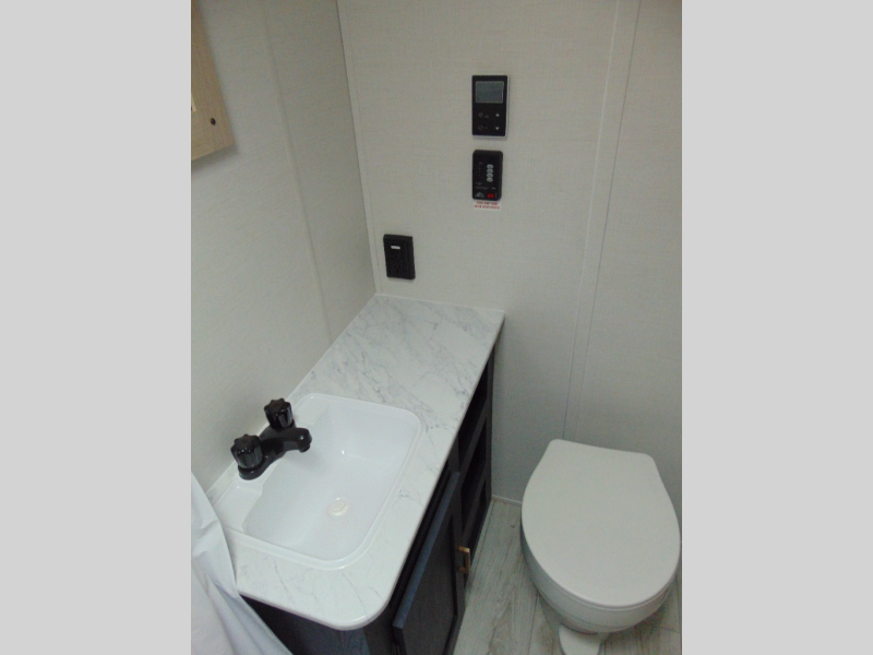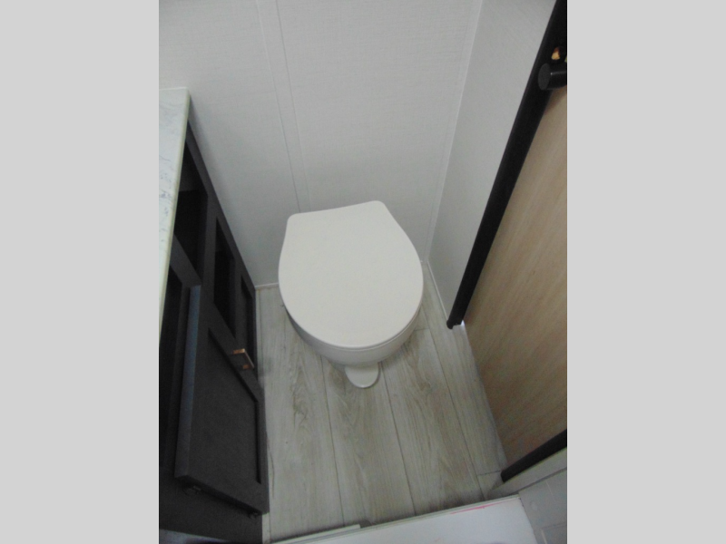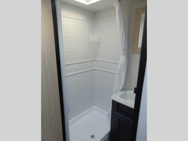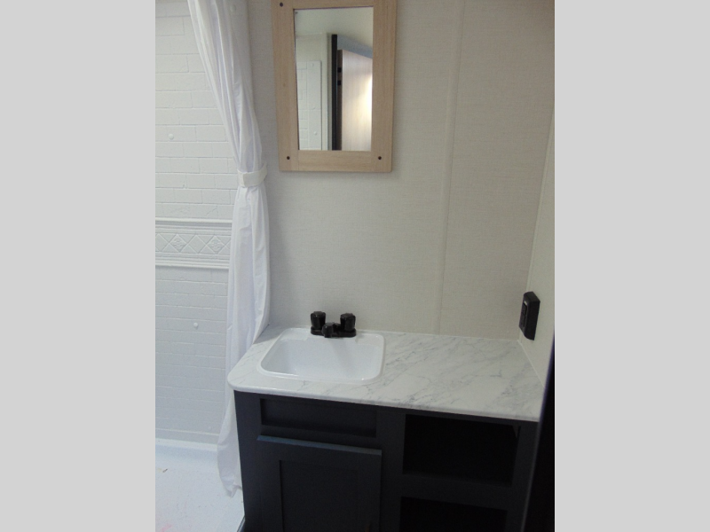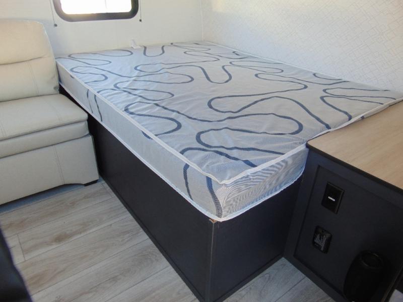 Camping in this travel trailer will be just what the doctor ordered! The rear corner kitchen includes ample counter space to prep meals, along with a desktop if you need to get some work done. The bartop with two stools will provide a place to dine together, and the sofa lets you relax in the evenings. Cook all of your meals on the two burner cooktop or in the electric microwave, and store your food in the 10.7 cu. ft. 12V refrigerator. A full bath lets you freshen up before bed, and the nightstand at the foot of the queen bed will keep your belongings tucked away!