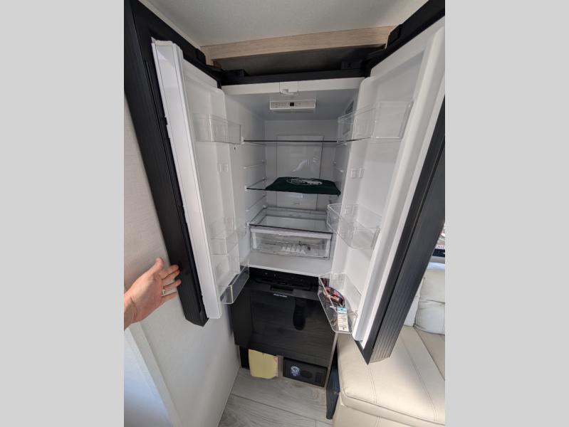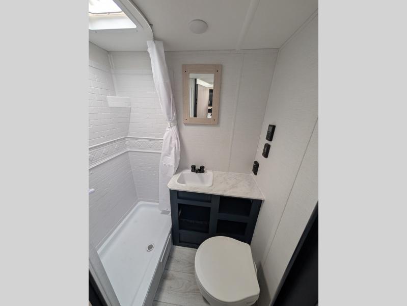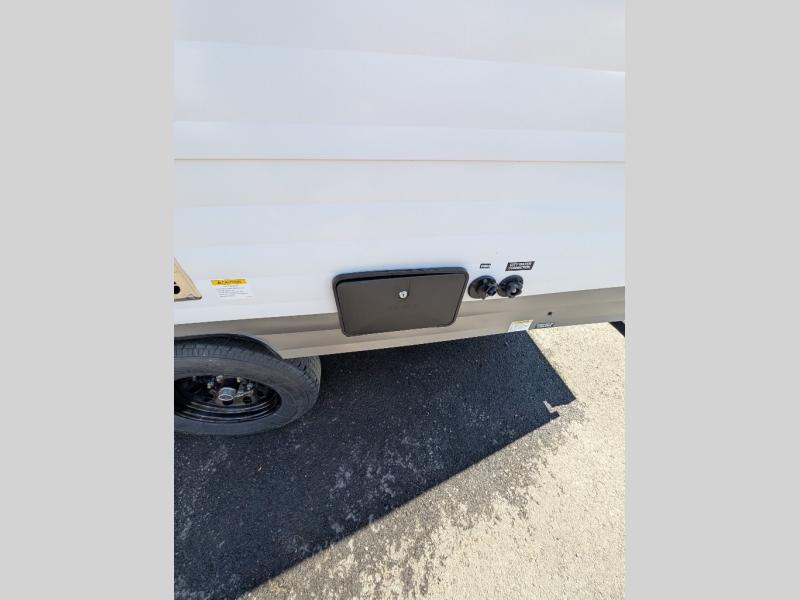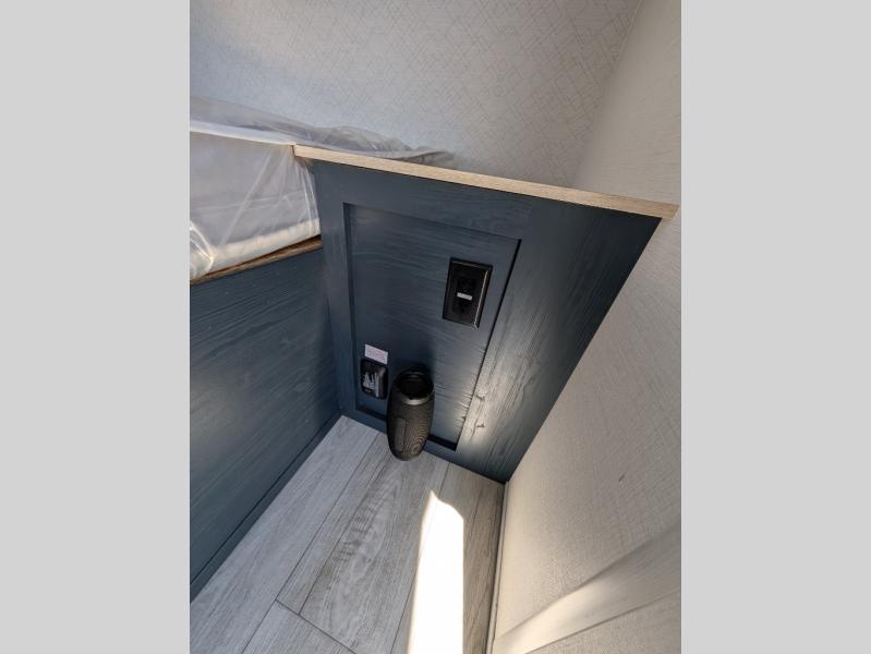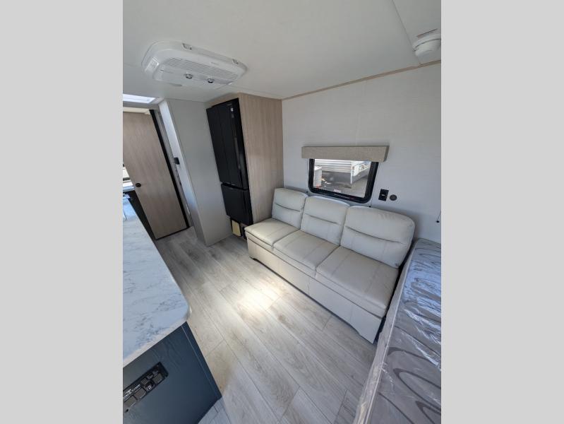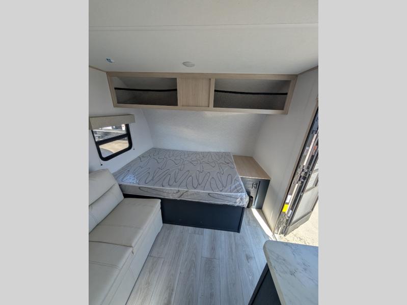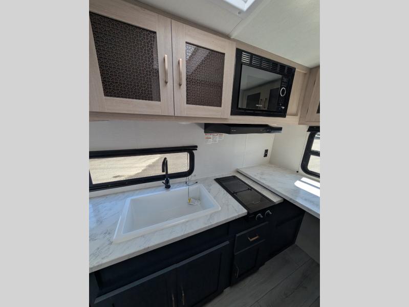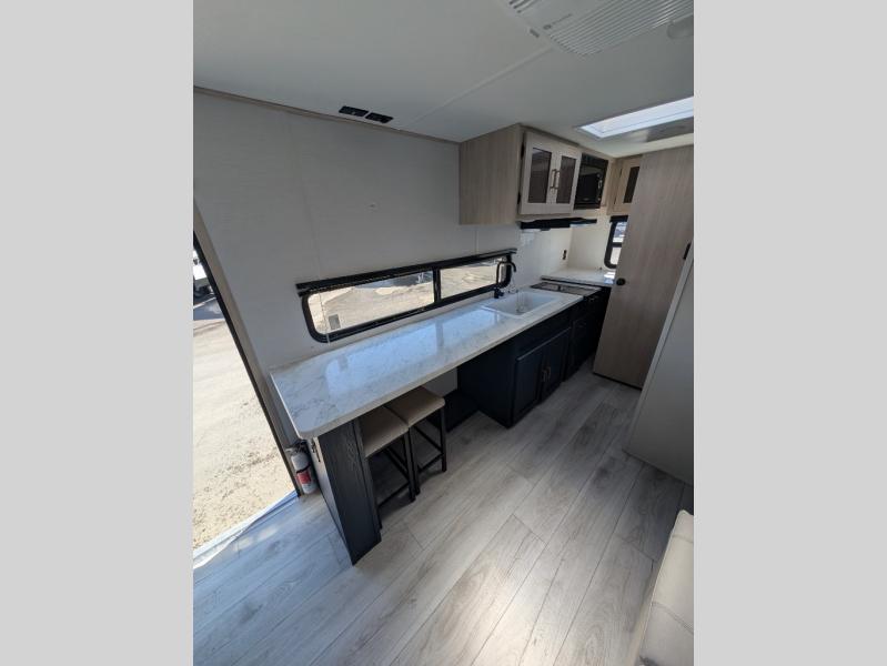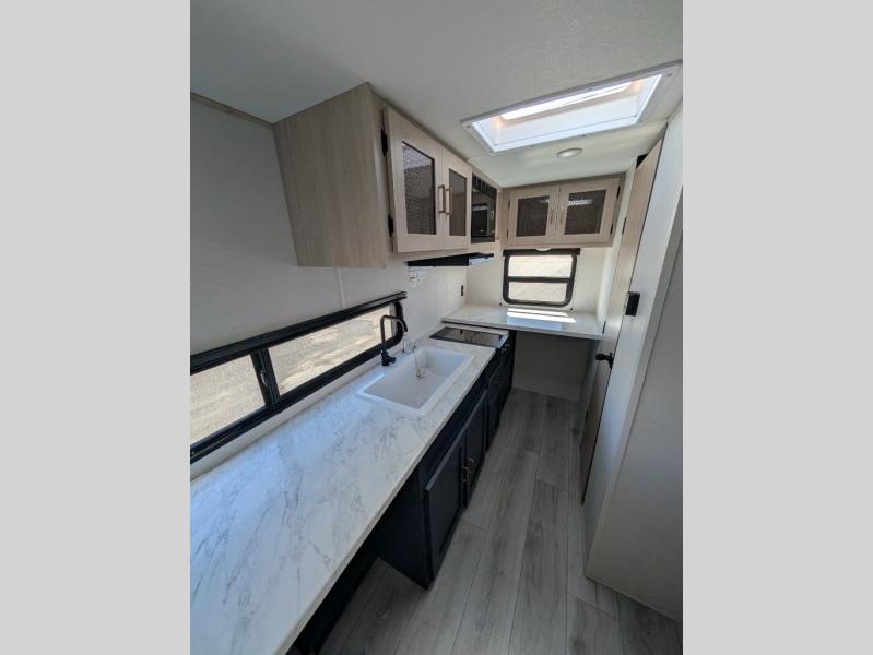 Camping in this travel trailer will be just what the doctor ordered! The rear corner kitchen includes ample counter space to prep meals, along with a desktop if you need to get some work done. The bartop with two stools will provide a place to dine together, and the sofa lets you relax in the evenings. Cook all of your meals on the two burner cooktop or in the electric microwave, and store your food in the 10.7 cu. ft. 12V refrigerator. A full bath lets you freshen up before bed, and the nightstand at the foot of the queen bed will keep your belongings tucked away!