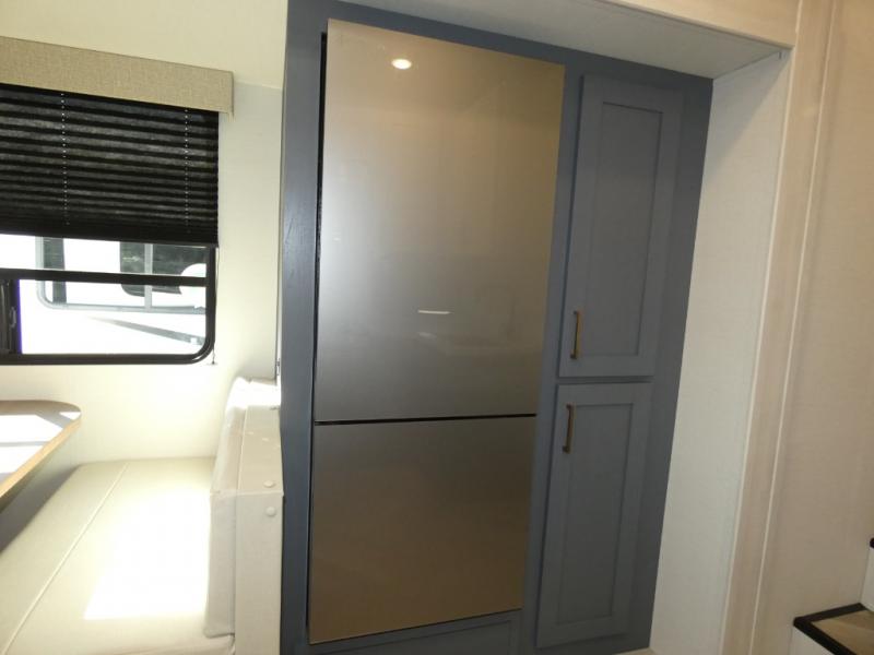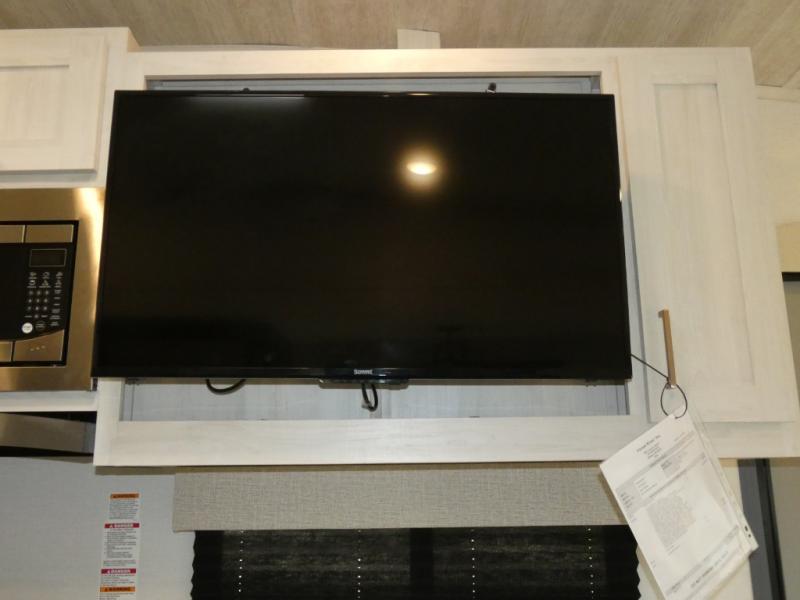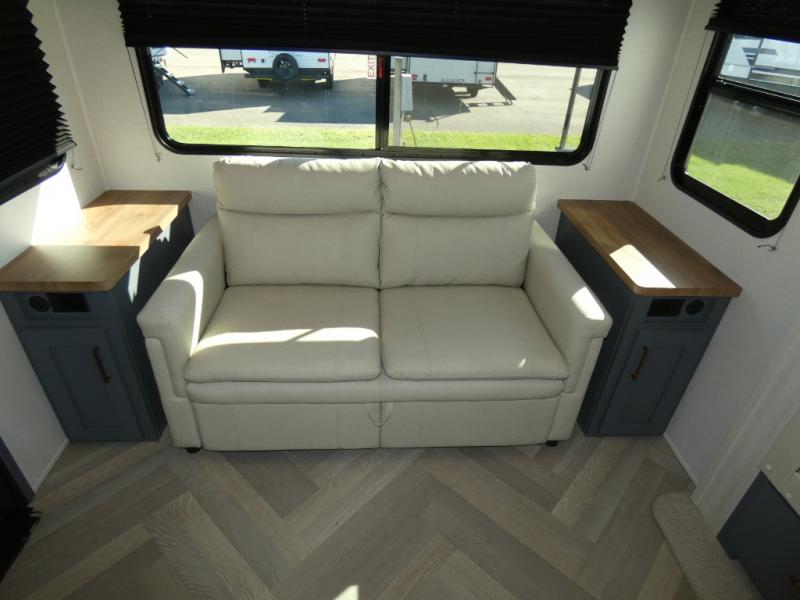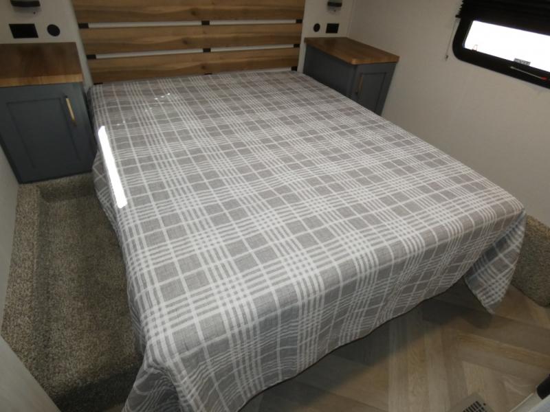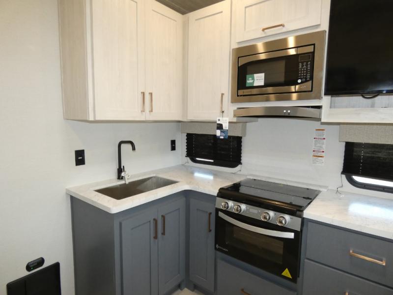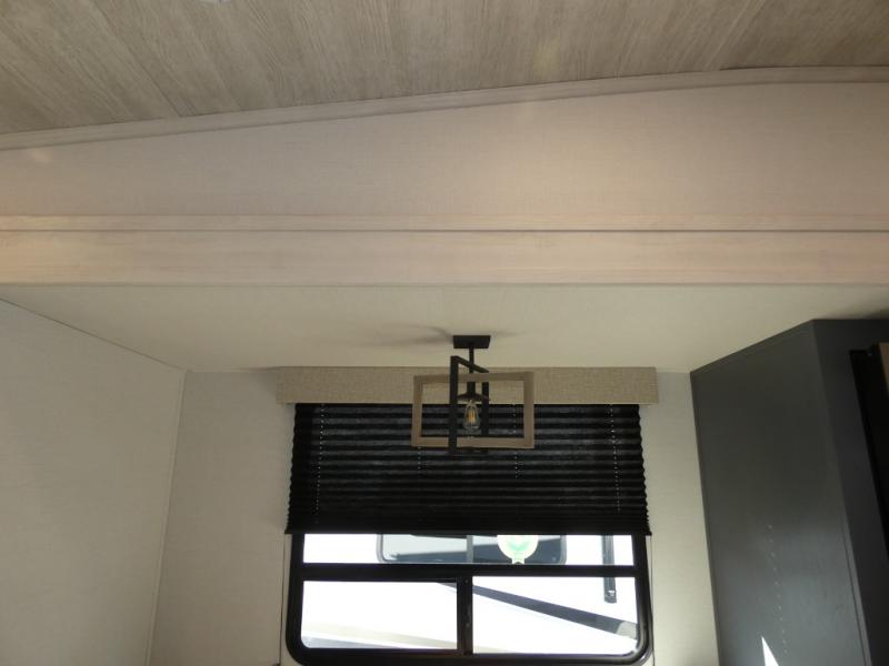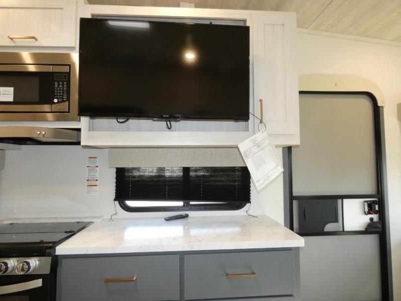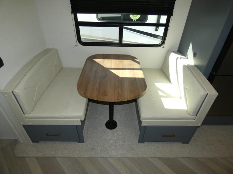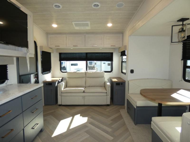When you're ready to escape the hustle and bustle of city life, hook up this fifth wheel and head out to the woods! Once you set up the awning, you can grab the fishing poles from the pass-through storage and get some fishing in before dinner. The kitchen includes a 10.7 cu. ft. 12V refrigerator, a high-rise faucet, and designer countertops you are sure to love. You can dine at the booth dinette within the slide out, or relax on the sofa, both of which are in good view of the 40" LED Smart TV! The front private bedroom in this model will feel just like home with its walk-around queen bed, wardrobe, and dual nightstands!