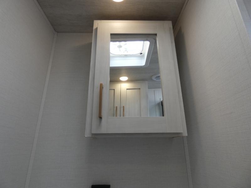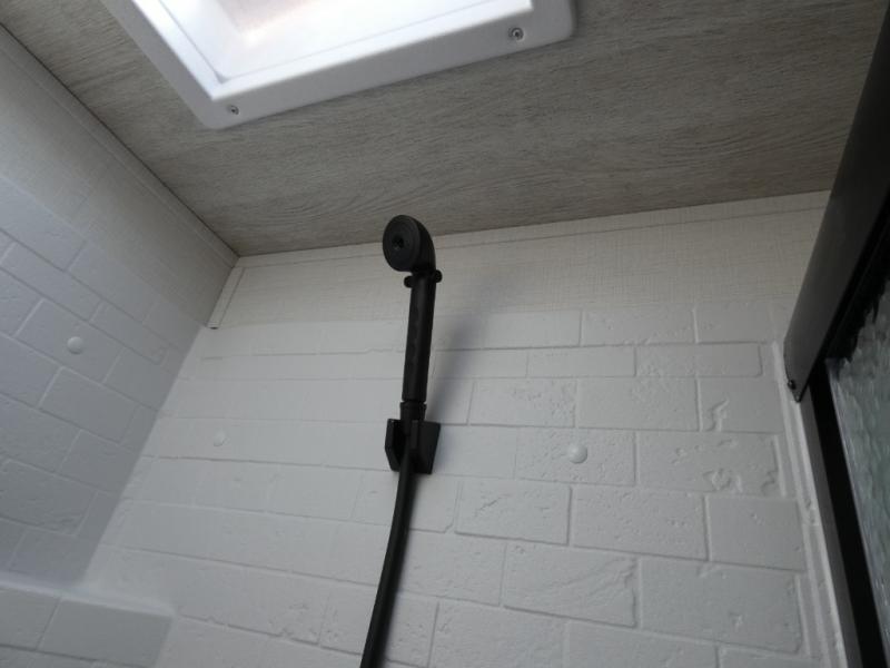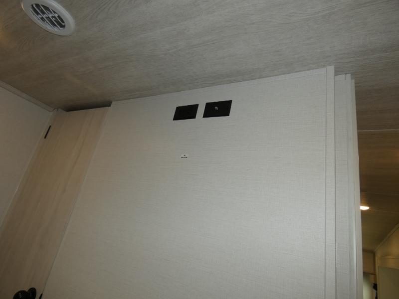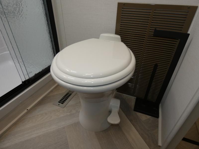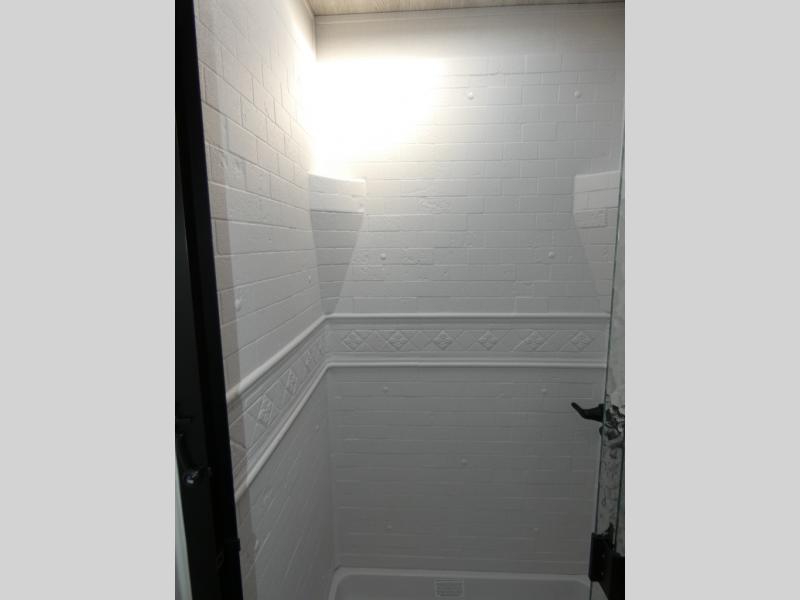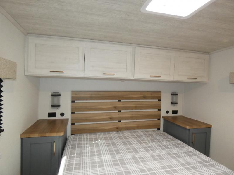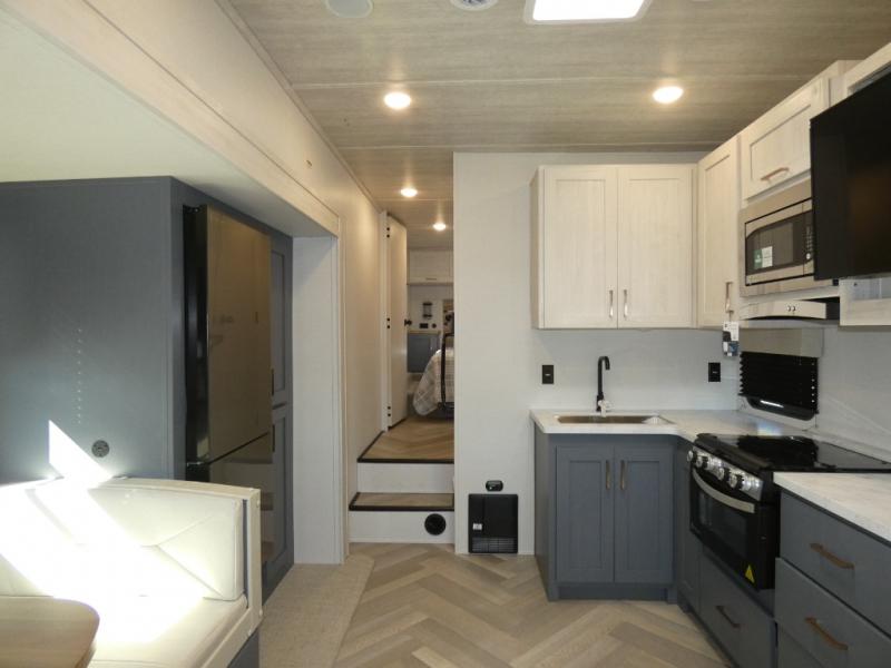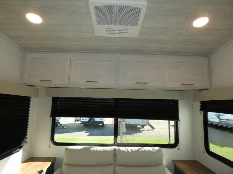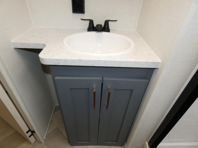 When you're ready to escape the hustle and bustle of city life, hook up this fifth wheel and head out to the woods! Once you set up the awning, you can grab the fishing poles from the pass-through storage and get some fishing in before dinner. The kitchen includes a 10.7 cu. ft. 12V refrigerator, a high-rise faucet, and designer countertops you are sure to love. You can dine at the booth dinette within the slide out, or relax on the sofa, both of which are in good view of the 40" LED Smart TV! The front private bedroom in this model will feel just like home with its walk-around queen bed, wardrobe, and dual nightstands!