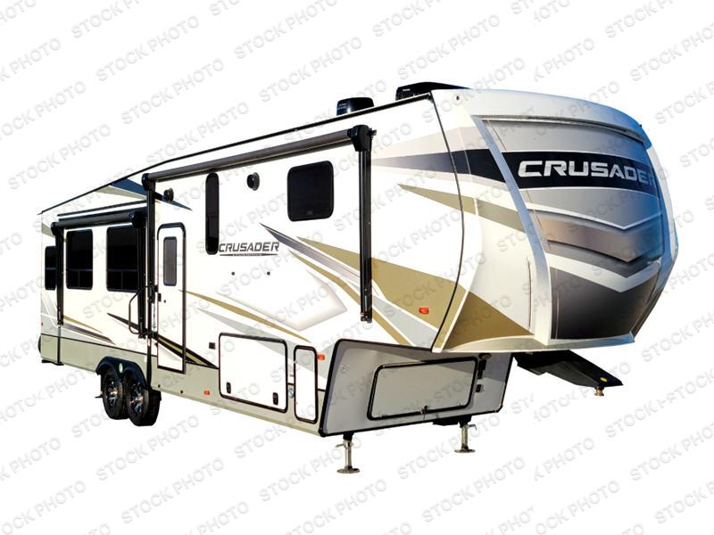 The Crusader fifth wheels by Prime Time RV are a step above the rest and it's not hard to see why. Each model has been constructed to last with its Eternabond construction, a one-piece PVC roof, and high gloss gel coat fiberglass exterior. The auto leveling system and the comprehensive universal docking center will have you set up to camp in no-time, and there is a convenient bottle opener and Doggy D-ring for your furry companions. You will fall in love with the interior that includes heat rated solid surface countertops, designer Carefree linoleum with Scotchgard technology, hardwood cabinet doors, and many more residential comforts. The Crusader also comes standard with dual 15,000 BTU A/C units, a 35,000 BTU high capacity gas furnace, a tankless on-demand water heater, and the Extreme Thermal Package Plus, making your camping season year-around!