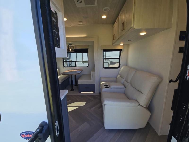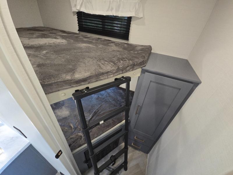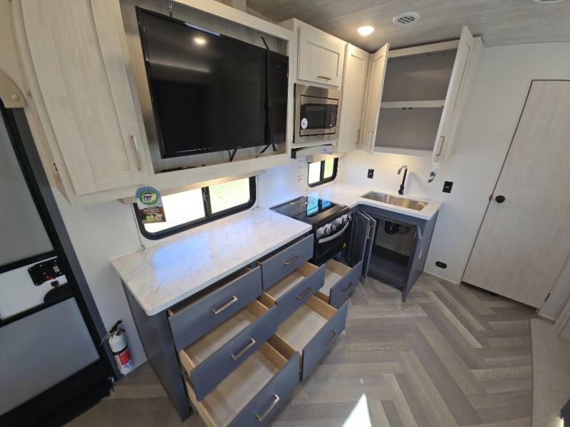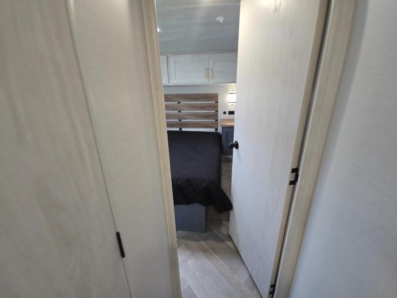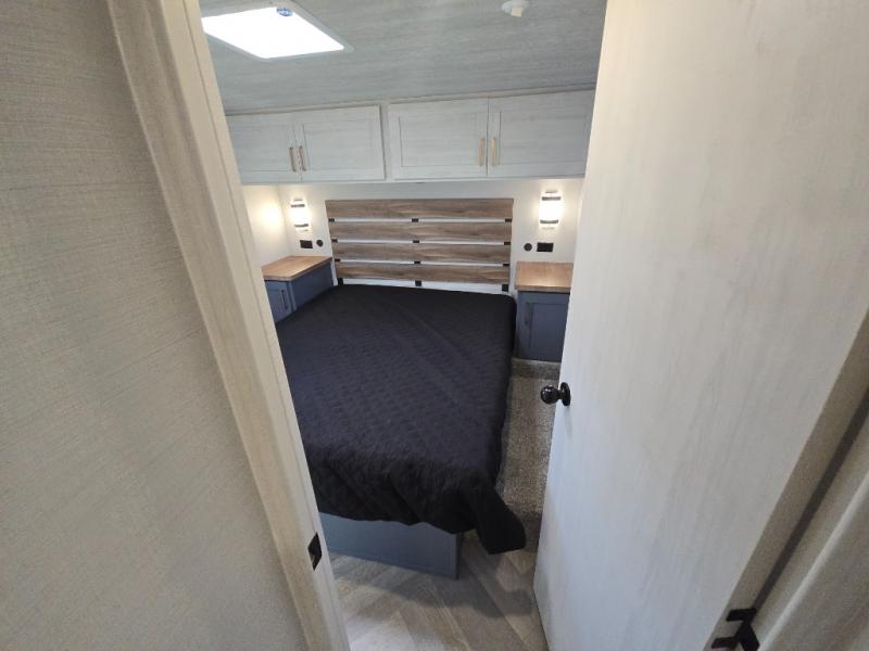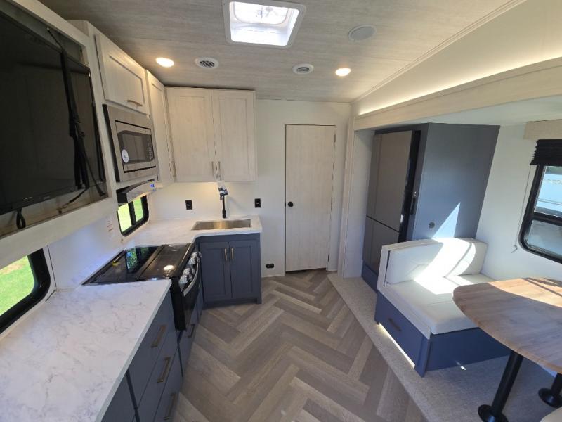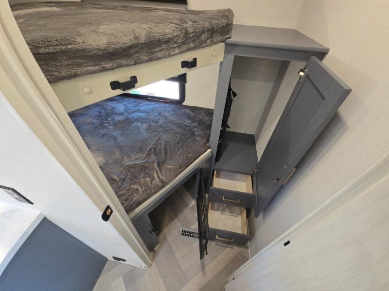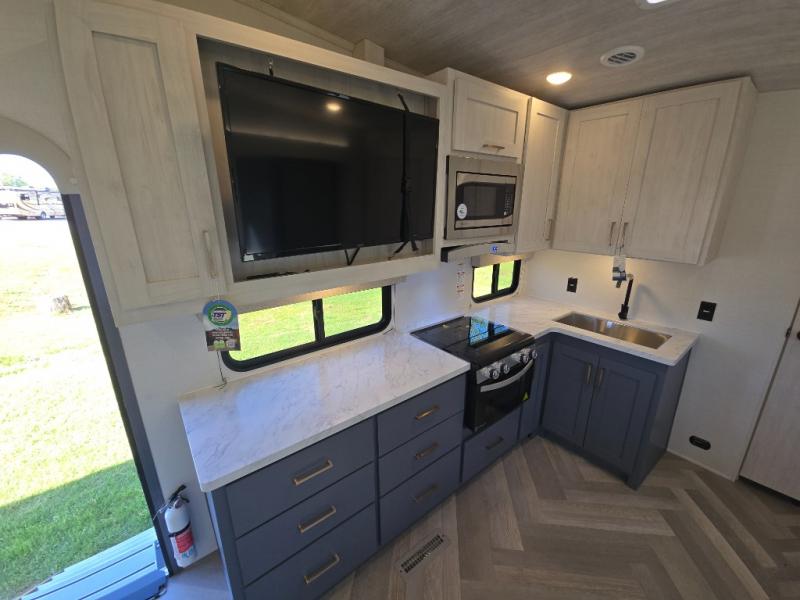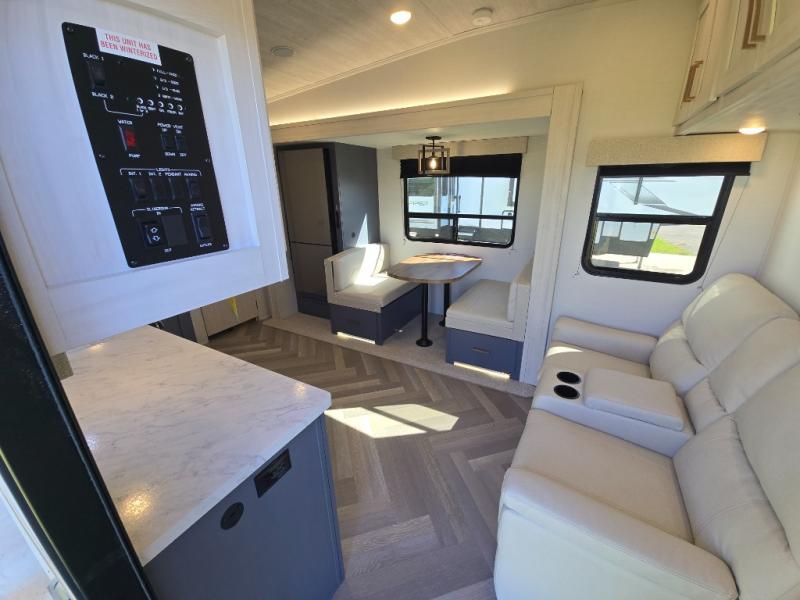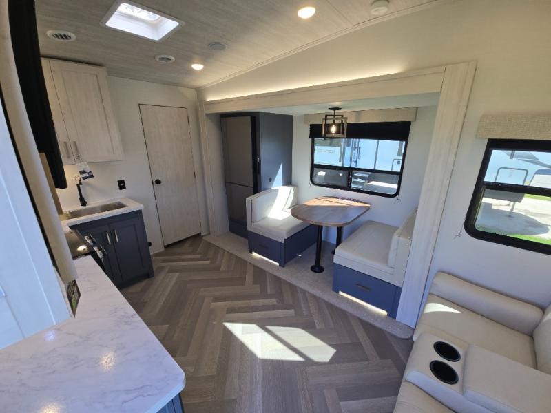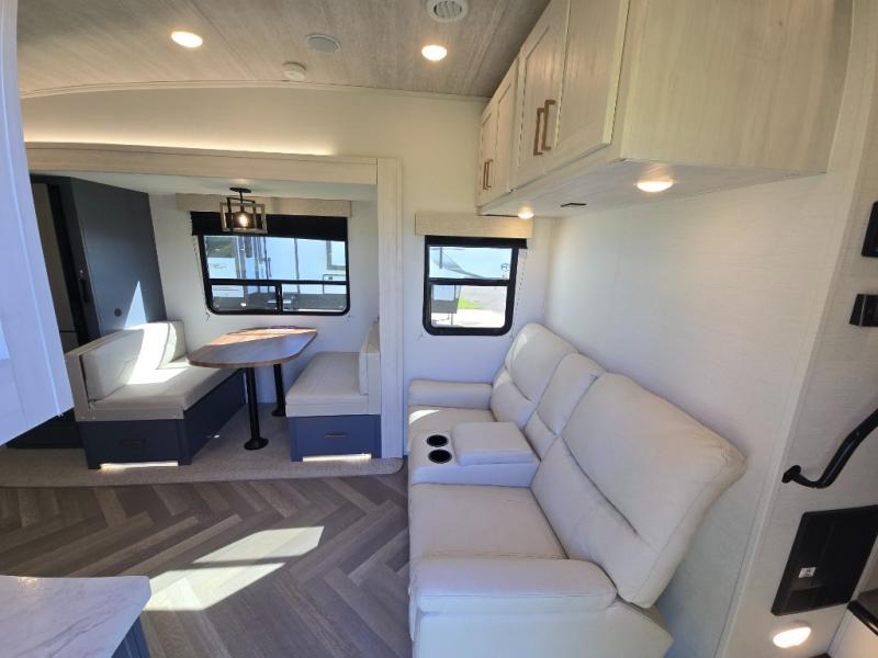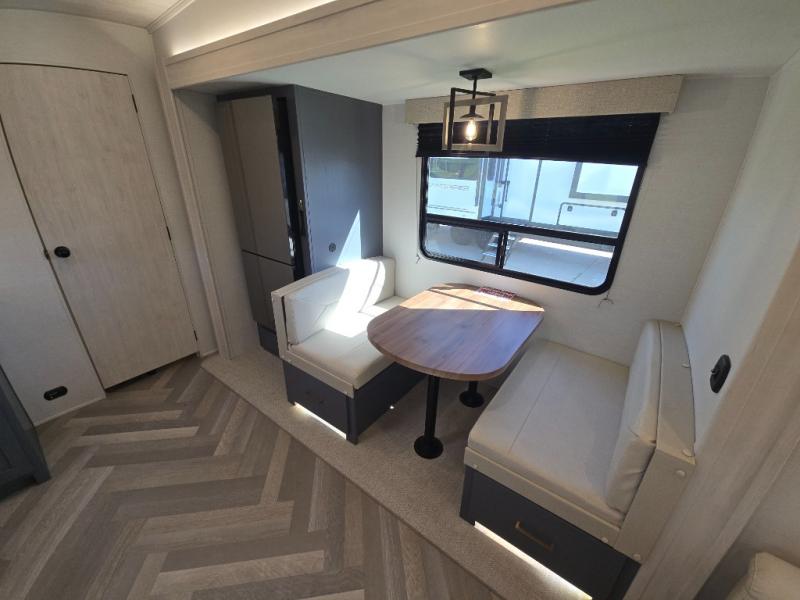 Camping with a larger group has never been easier than with this fifth wheel. There is a rear private bunkhouse that includes bunk beds with lower doggy storage to keep items organized. You will feel right at home in the front private bedroom that includes a queen bed, a wardrobe, and dual nightstands. The combined living and kitchen is cozy with its theater seating and booth dinette, plus there is a 40" LED Smart TV to make it a movie night. Everyone will also appreciate having a full bath onboard to stay clean throughout each trip!