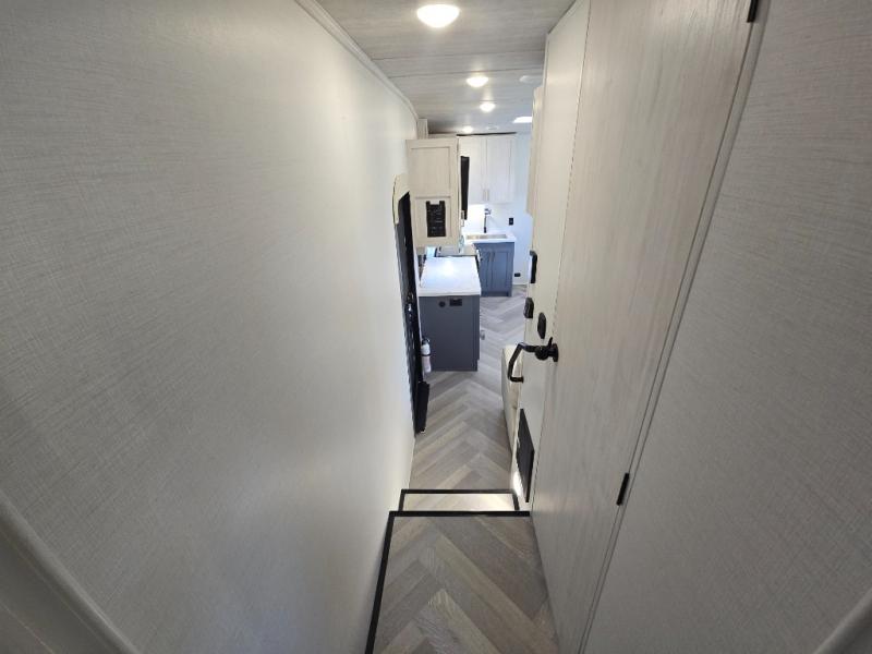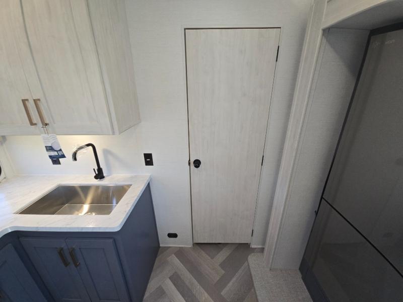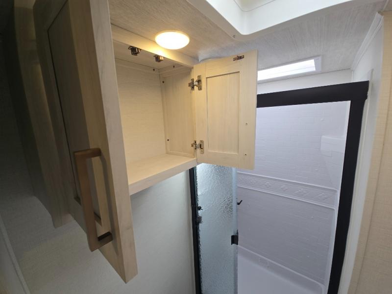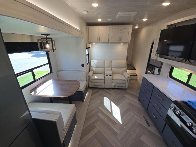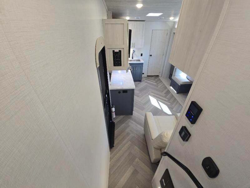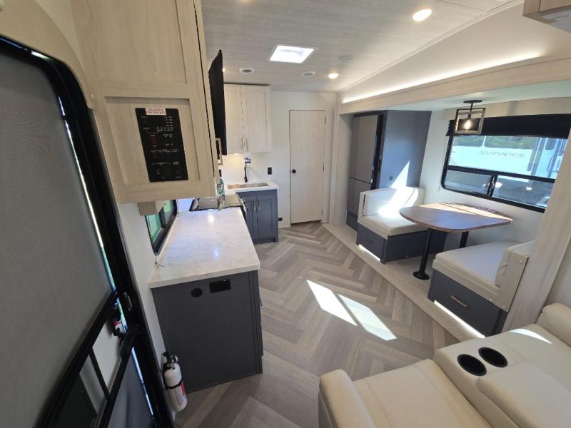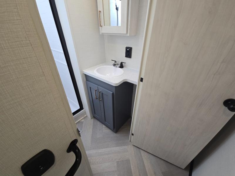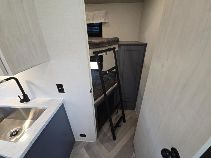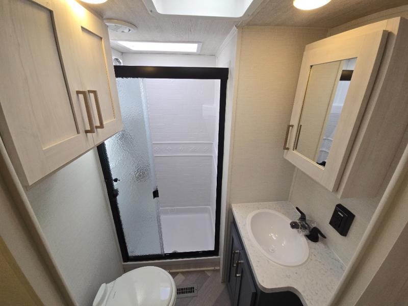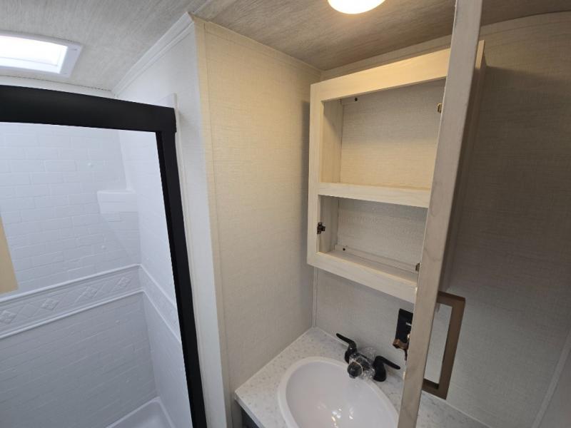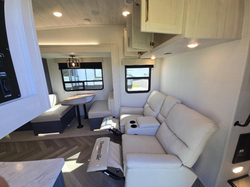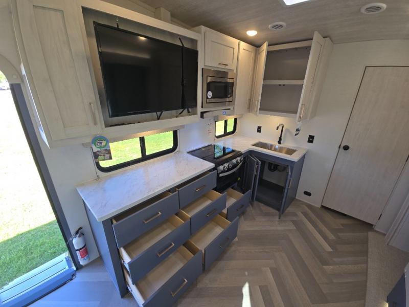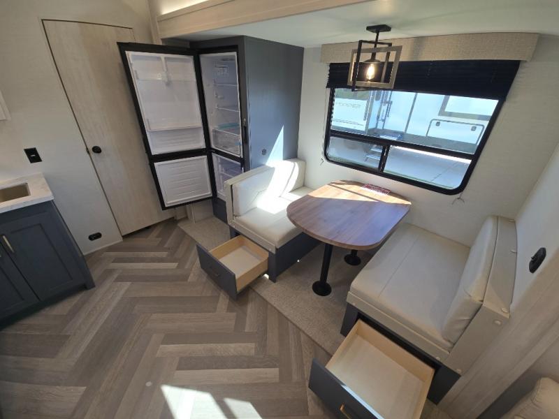 Camping with a larger group has never been easier than with this fifth wheel. There is a rear private bunkhouse that includes bunk beds with lower doggy storage to keep items organized. You will feel right at home in the front private bedroom that includes a queen bed, a wardrobe, and dual nightstands. The combined living and kitchen is cozy with its theater seating and booth dinette, plus there is a 40" LED Smart TV to make it a movie night. Everyone will also appreciate having a full bath onboard to stay clean throughout each trip!