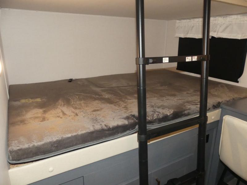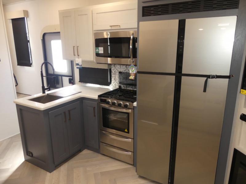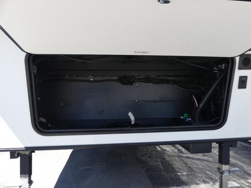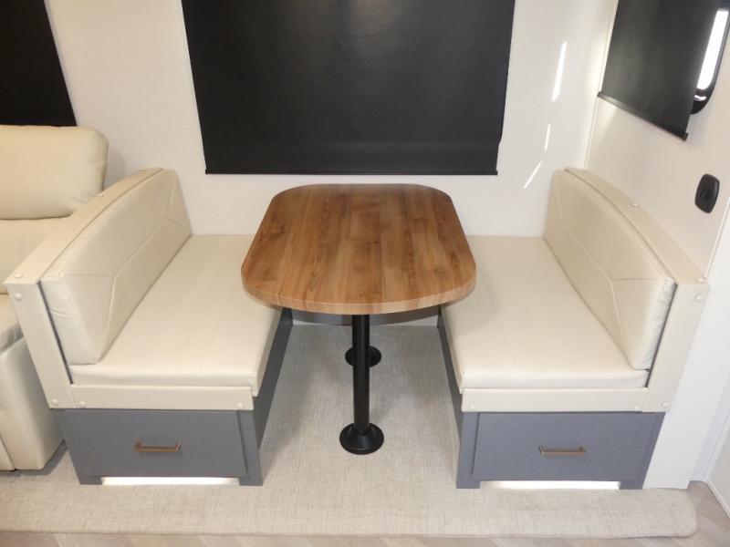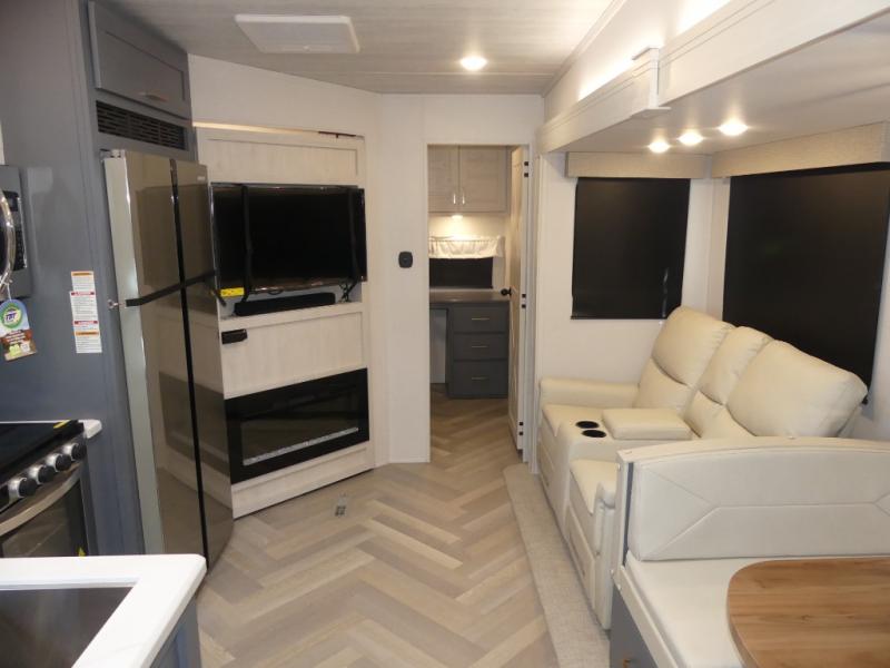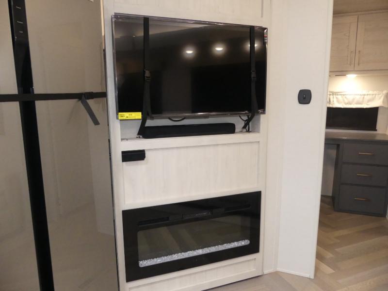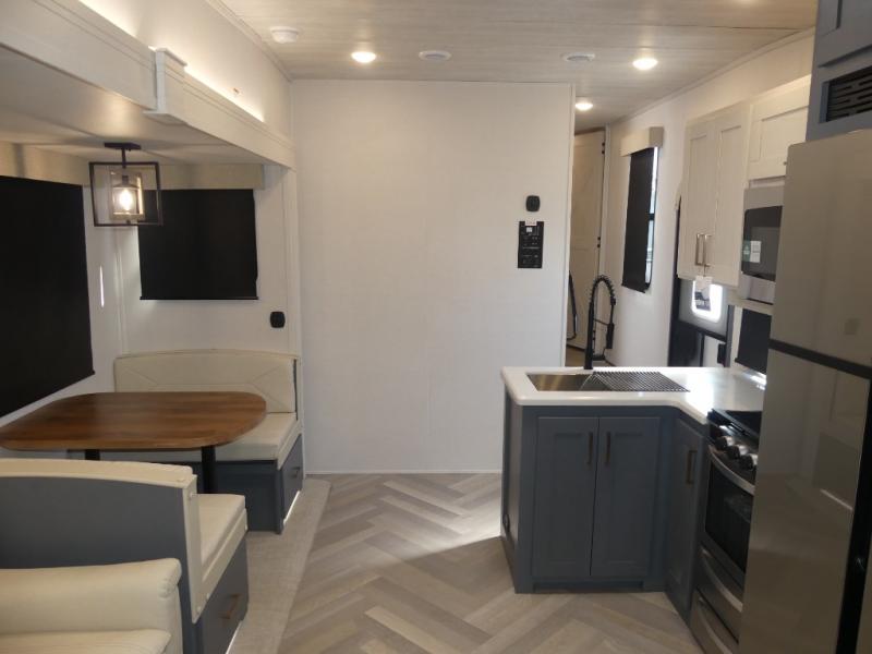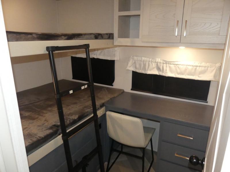 A rear private bunkhouse for your guests and a front private bedroom for you; it's the perfect fifth wheel to camp with a larger group! Four campers can sleep on the double-size bunks, and there is overhead storage plus a desk with drawers below if you need to get some work done. You'll find your own storage in the front private bedroom within the wardrobe slide, plus there are dual nightstands to keep your book, phone, and glasses nearby. Everyone can meet in the combined kitchen and living area in the morning as the cook makes breakfast on the three burner cooktop. You'll find seating spaces on the theater seating or the booth dinette. Some other stand-out features this model includes are the coat hooks and storage cubbies, the hidden pantry behind the entertainment center, and the outside kitchen!