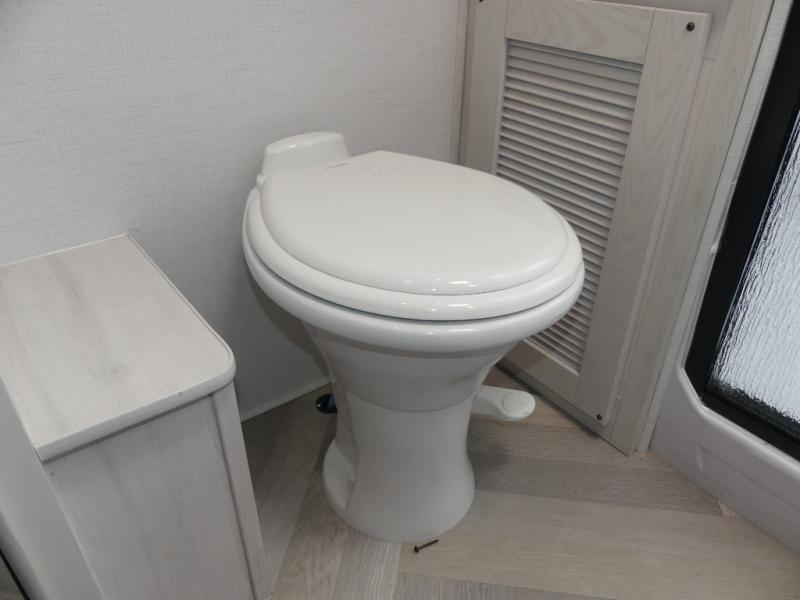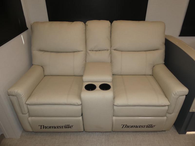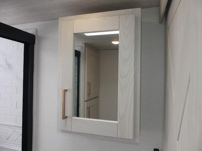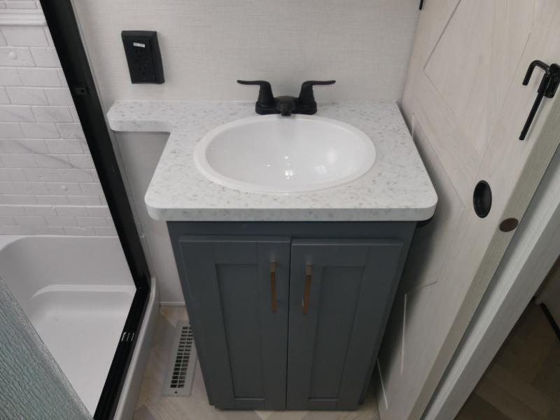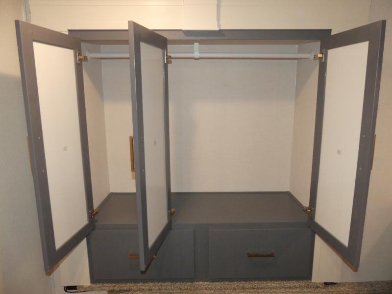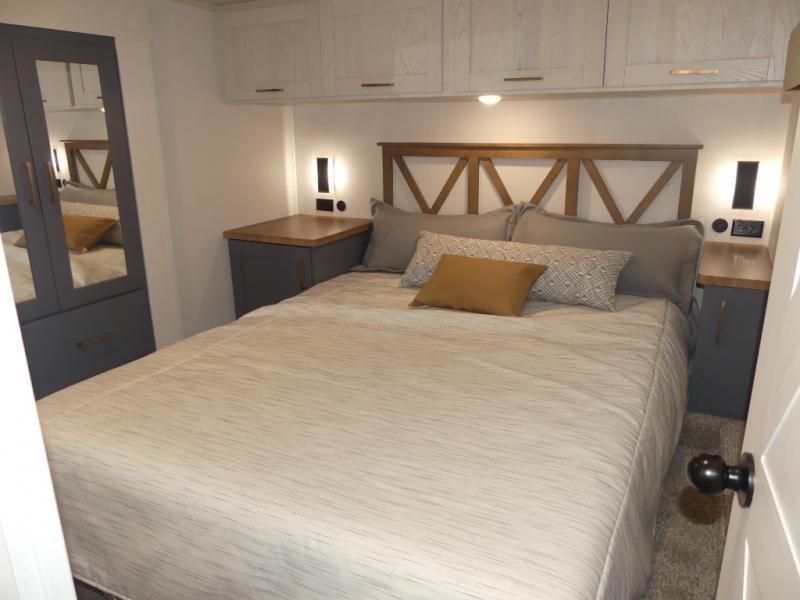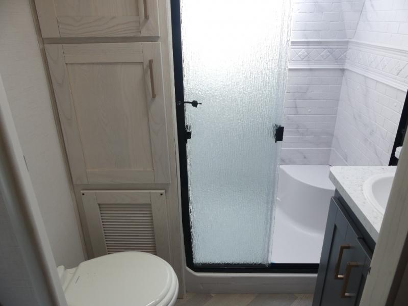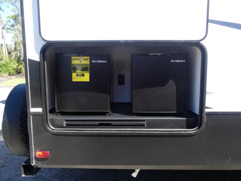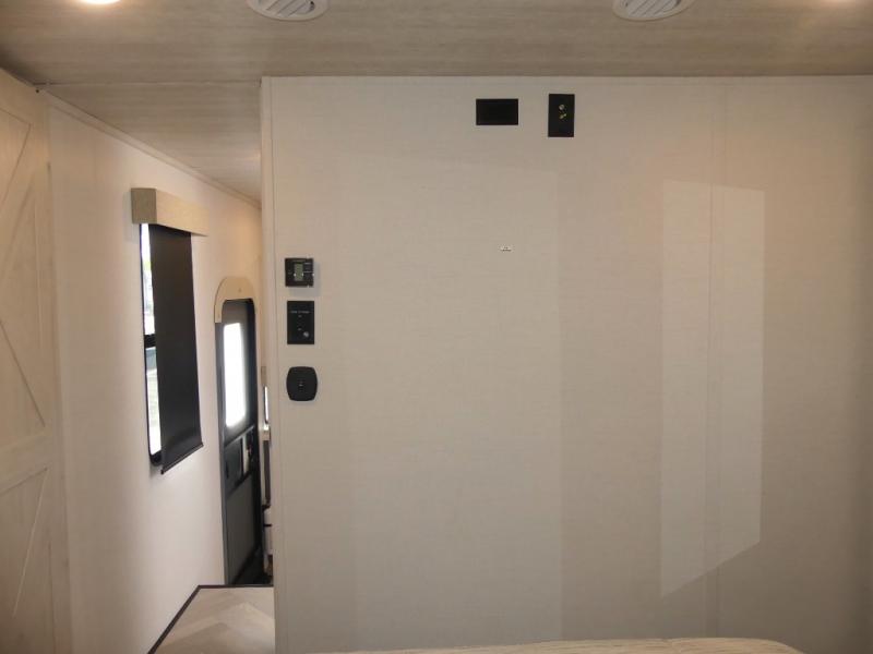 A rear private bunkhouse for your guests and a front private bedroom for you; it's the perfect fifth wheel to camp with a larger group! Four campers can sleep on the double-size bunks, and there is overhead storage plus a desk with drawers below if you need to get some work done. You'll find your own storage in the front private bedroom within the wardrobe slide, plus there are dual nightstands to keep your book, phone, and glasses nearby. Everyone can meet in the combined kitchen and living area in the morning as the cook makes breakfast on the three burner cooktop. You'll find seating spaces on the theater seating or the booth dinette. Some other stand-out features this model includes are the coat hooks and storage cubbies, the hidden pantry behind the entertainment center, and the outside kitchen!