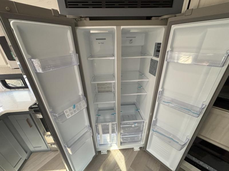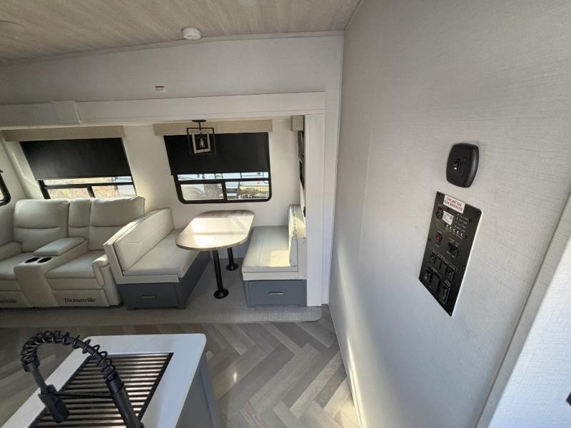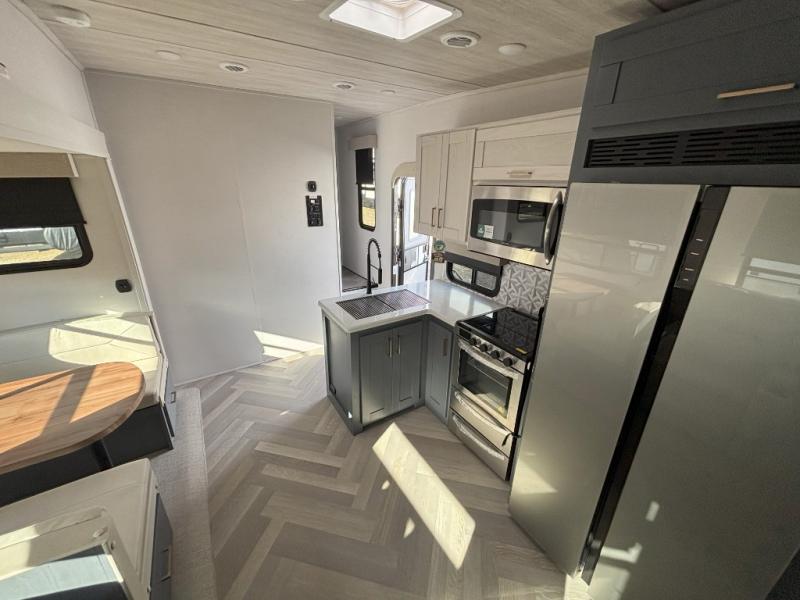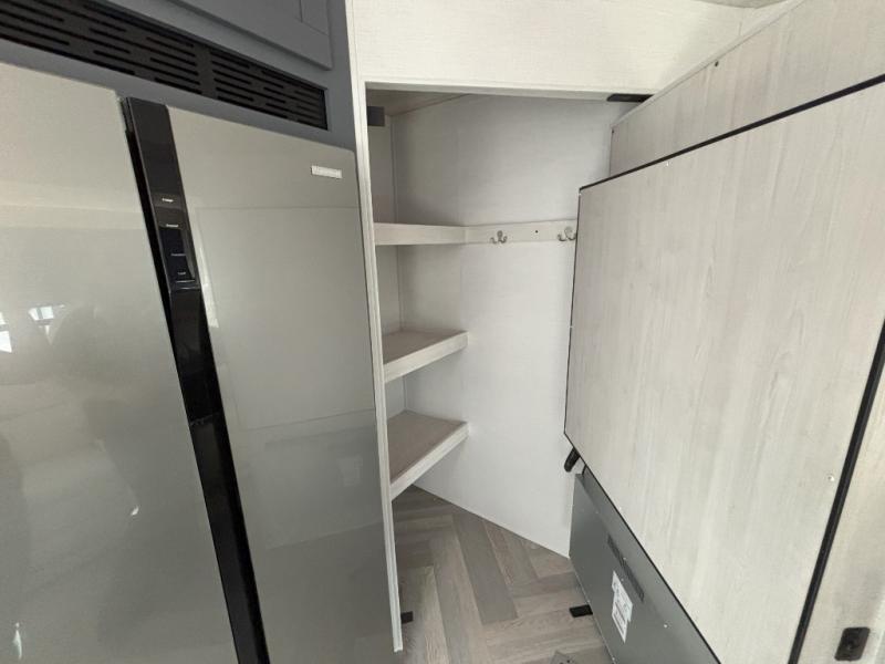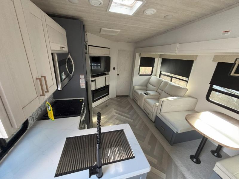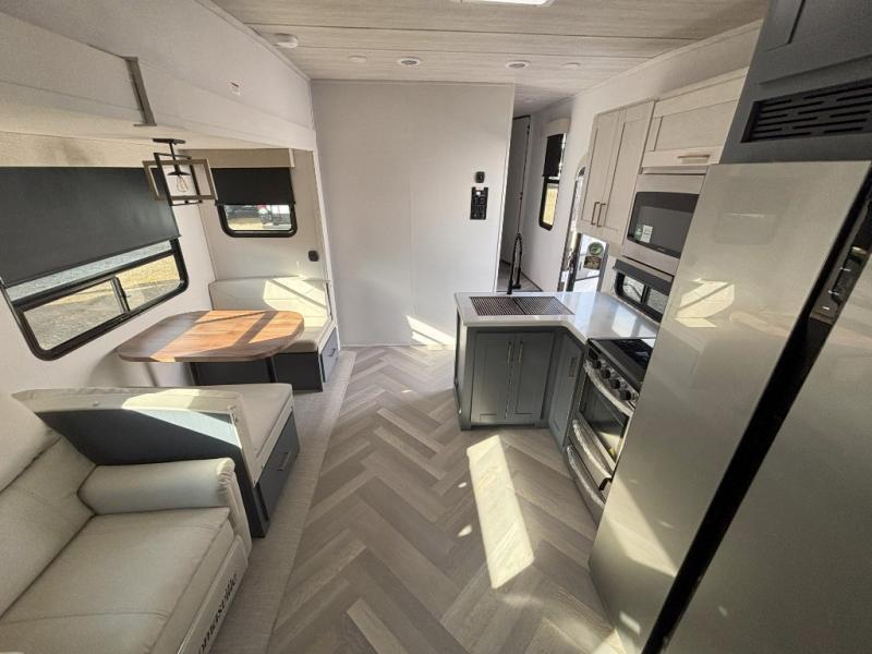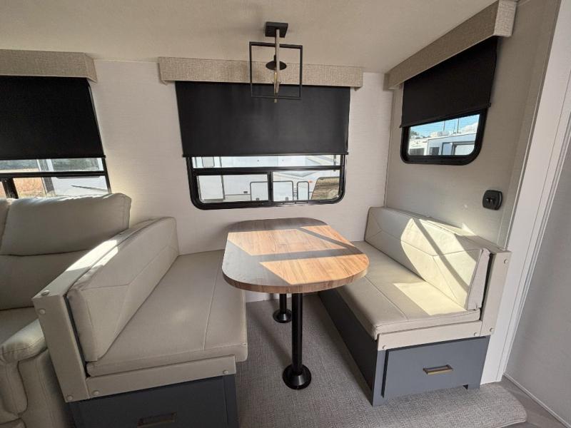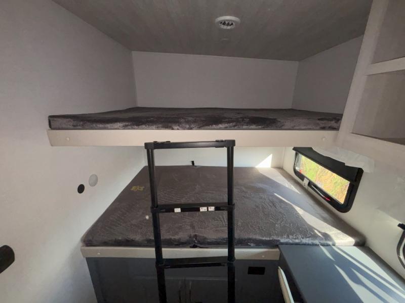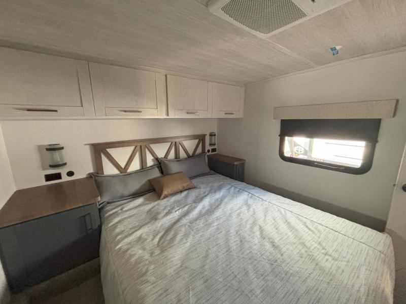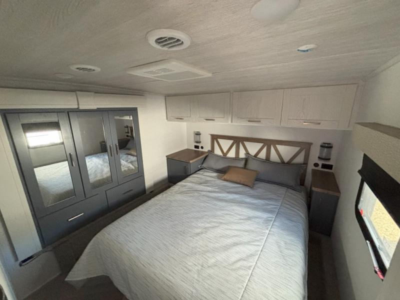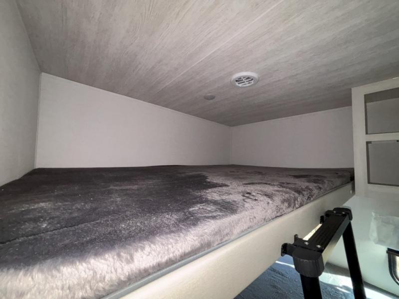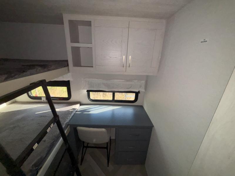 A rear private bunkhouse for your guests and a front private bedroom for you; it's the perfect fifth wheel to camp with a larger group! Four campers can sleep on the double-size bunks, and there is overhead storage plus a desk with drawers below if you need to get some work done. You'll find your own storage in the front private bedroom within the wardrobe slide, plus there are dual nightstands to keep your book, phone, and glasses nearby. Everyone can meet in the combined kitchen and living area in the morning as the cook makes breakfast on the three burner cooktop. You'll find seating spaces on the theater seating or the booth dinette that can be optioned out for a free-standing table with four chairs. Some other stand-out features this model includes are the coat hooks and storage cubbies, the hidden pantry behind the entertainment center, and the outside kitchen!