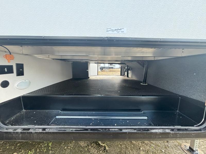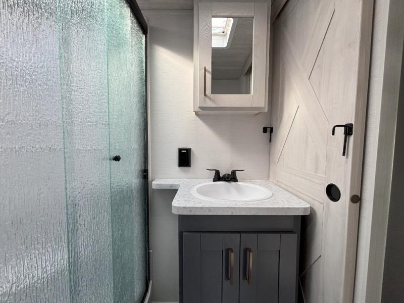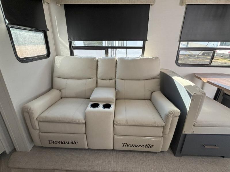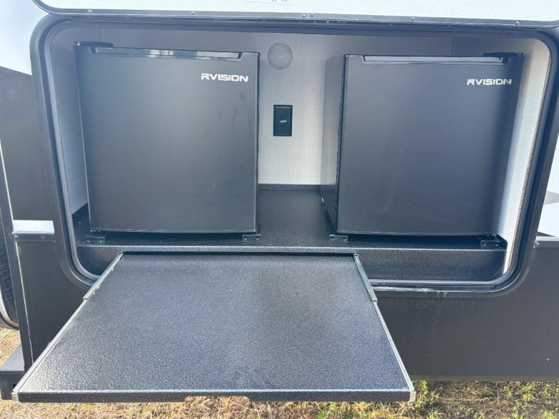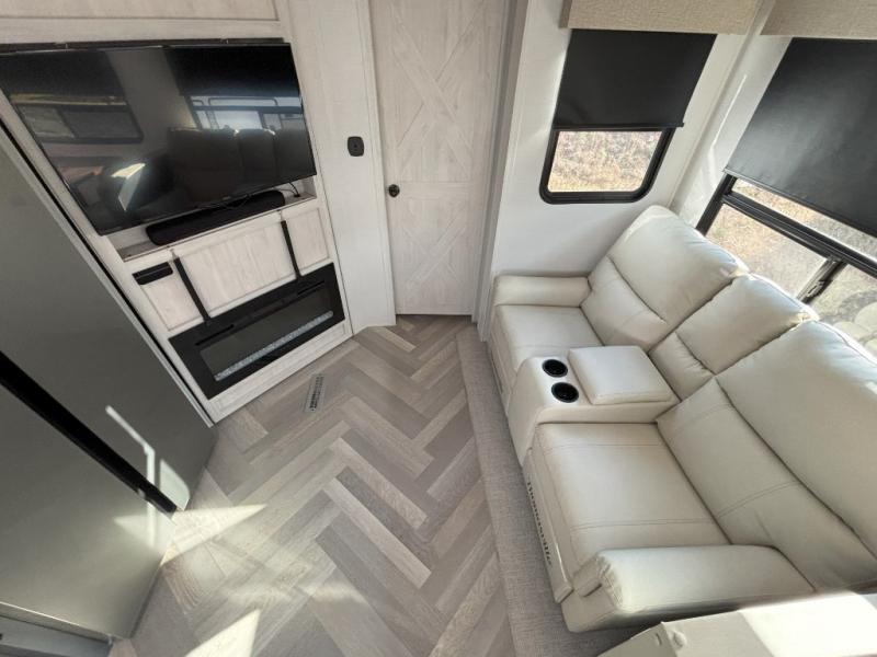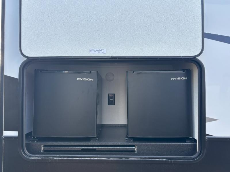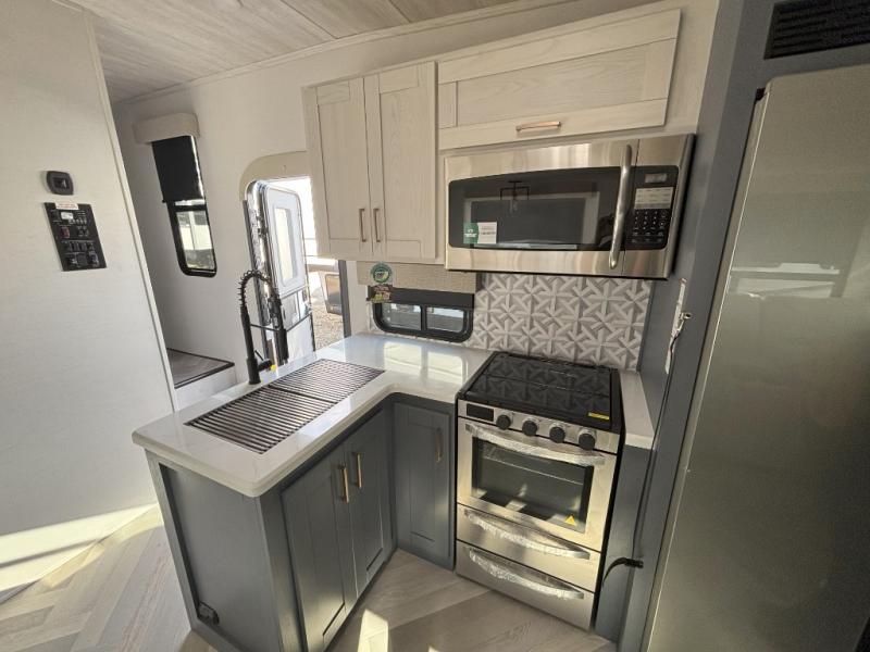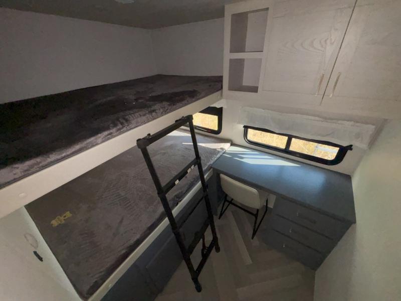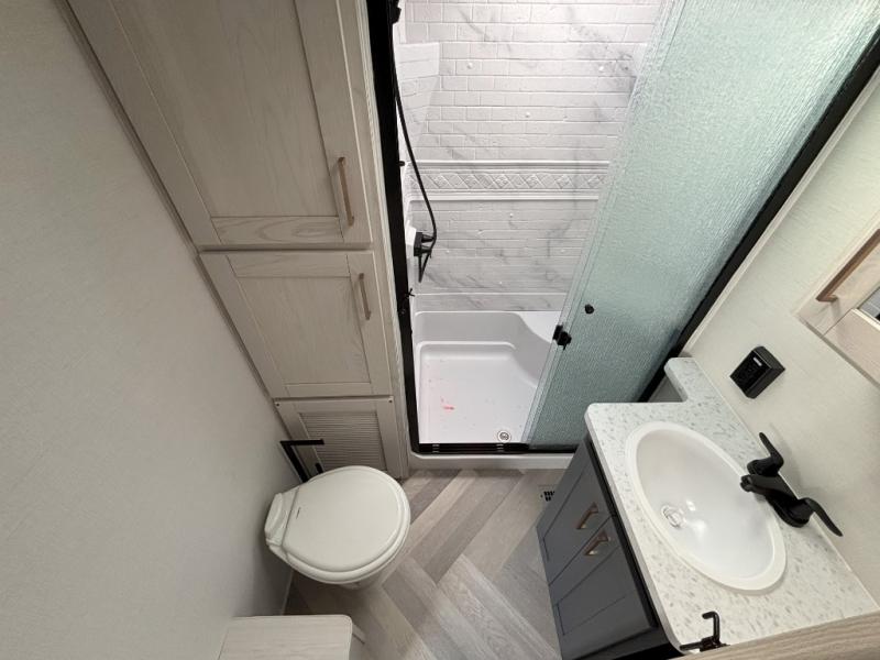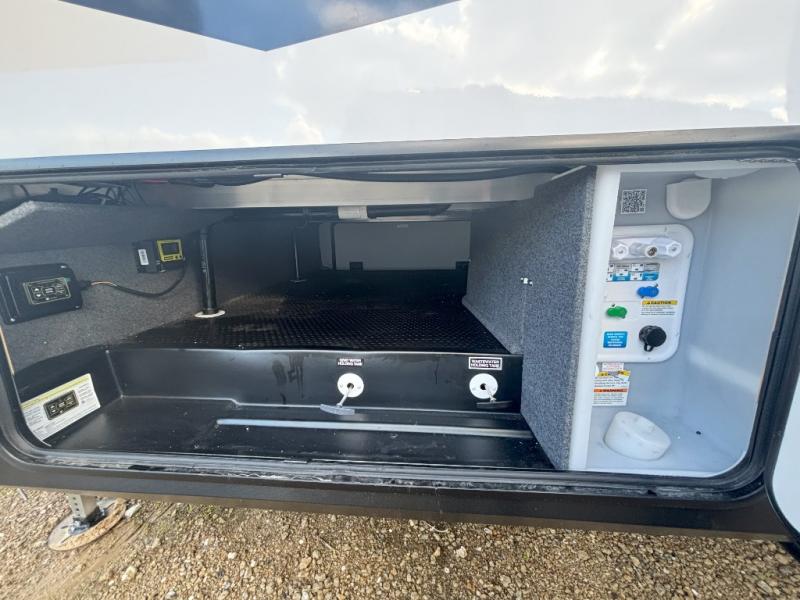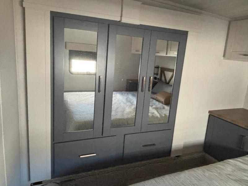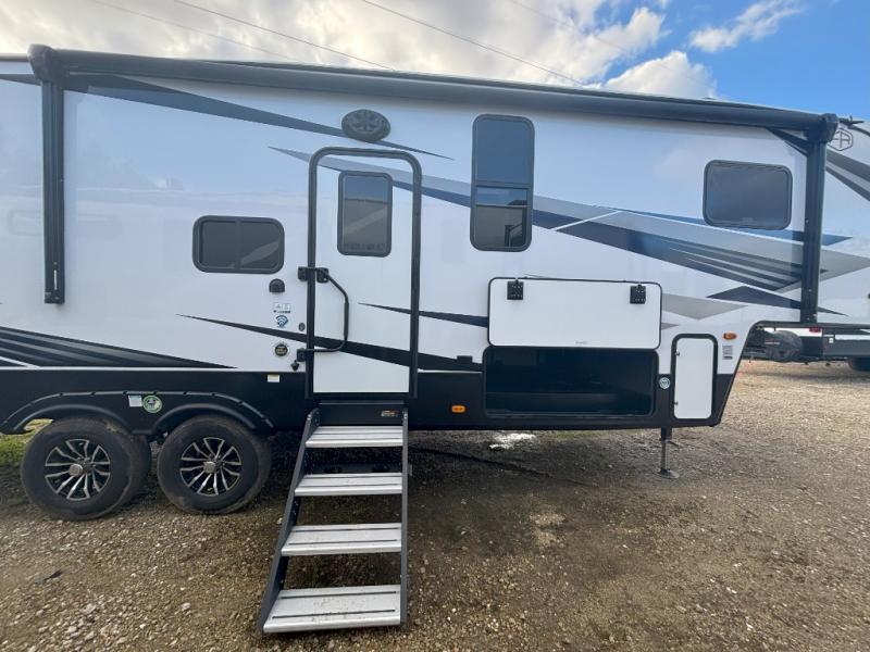 A rear private bunkhouse for your guests and a front private bedroom for you; it's the perfect fifth wheel to camp with a larger group! Four campers can sleep on the double-size bunks, and there is overhead storage plus a desk with drawers below if you need to get some work done. You'll find your own storage in the front private bedroom within the wardrobe slide, plus there are dual nightstands to keep your book, phone, and glasses nearby. Everyone can meet in the combined kitchen and living area in the morning as the cook makes breakfast on the three burner cooktop. You'll find seating spaces on the theater seating or the booth dinette that can be optioned out for a free-standing table with four chairs. Some other stand-out features this model includes are the coat hooks and storage cubbies, the hidden pantry behind the entertainment center, and the outside kitchen!
