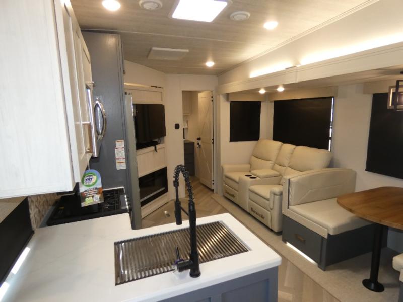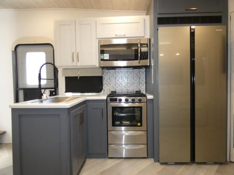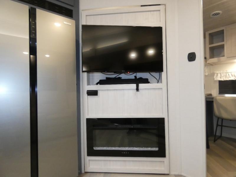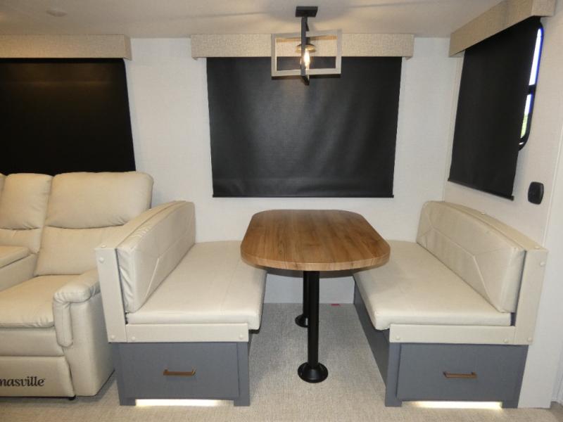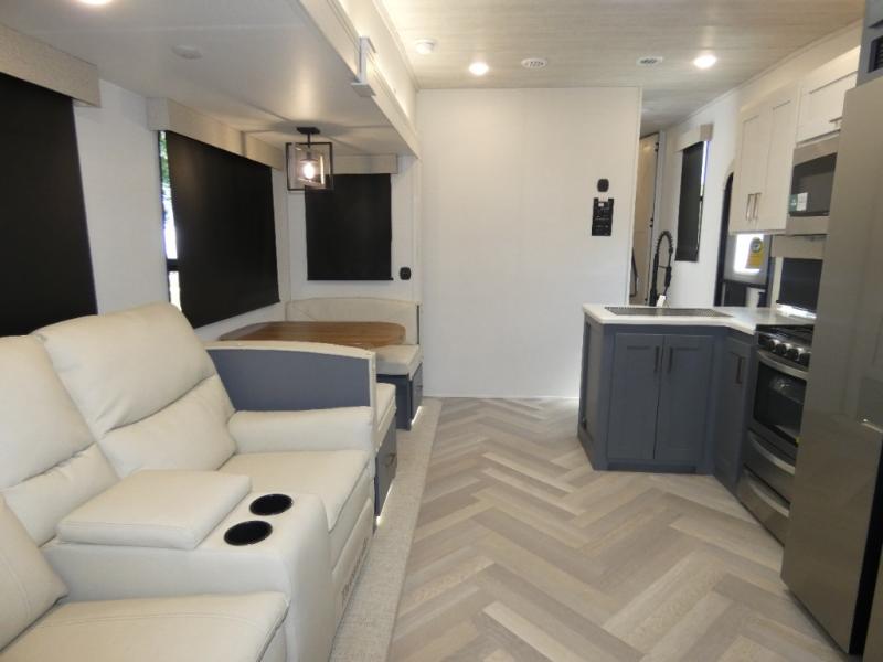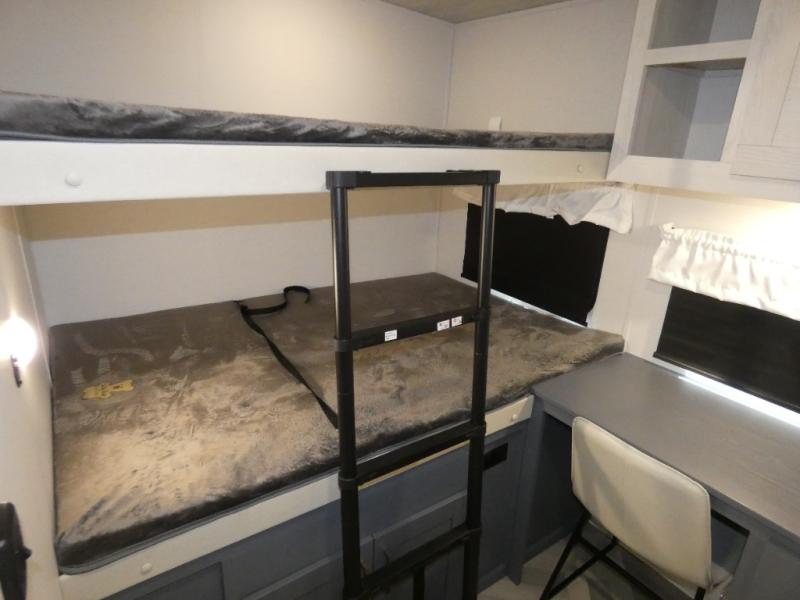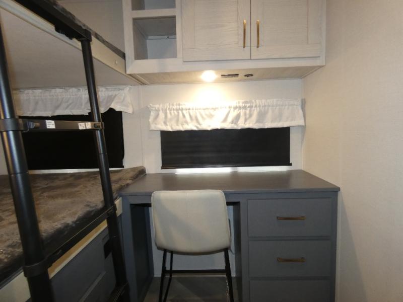 A rear private bunkhouse for your guests and a front private bedroom for you; it's the perfect fifth wheel to camp with a larger group! Four campers can sleep on the double-size bunks, and there is overhead storage plus a desk with drawers below if you need to get some work done. You'll find your own storage in the front private bedroom within the wardrobe slide, plus there are dual nightstands to keep your book, phone, and glasses nearby. Everyone can meet in the combined kitchen and living area in the morning as the cook makes breakfast on the three burner cooktop. You'll find seating spaces on the theater seating or the booth dinette that can be optioned out for a free-standing table with four chairs. Some other stand-out features this model includes are the coat hooks and storage cubbies, the hidden pantry behind the entertainment center, and the outside kitchen!