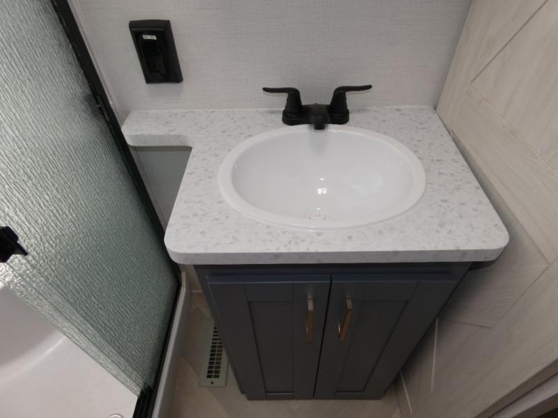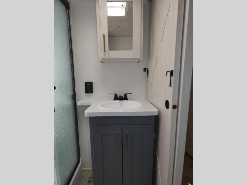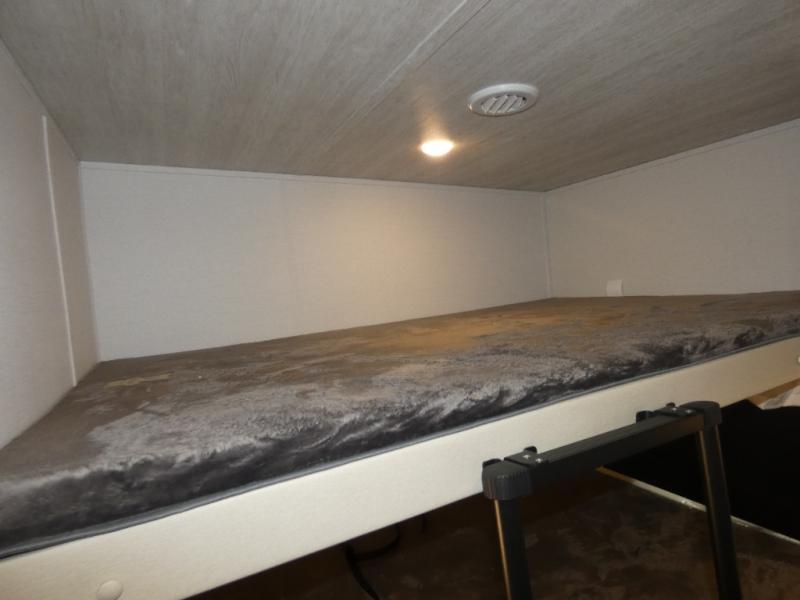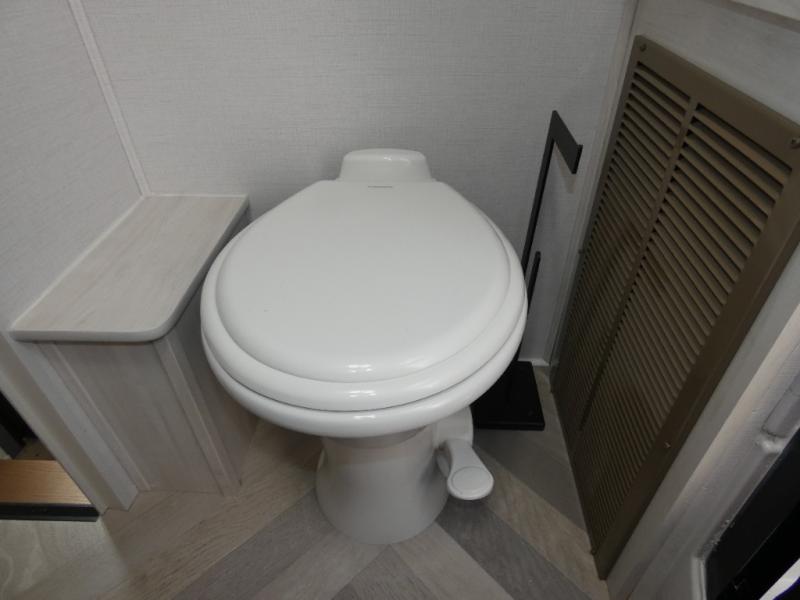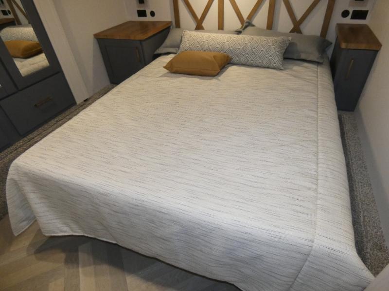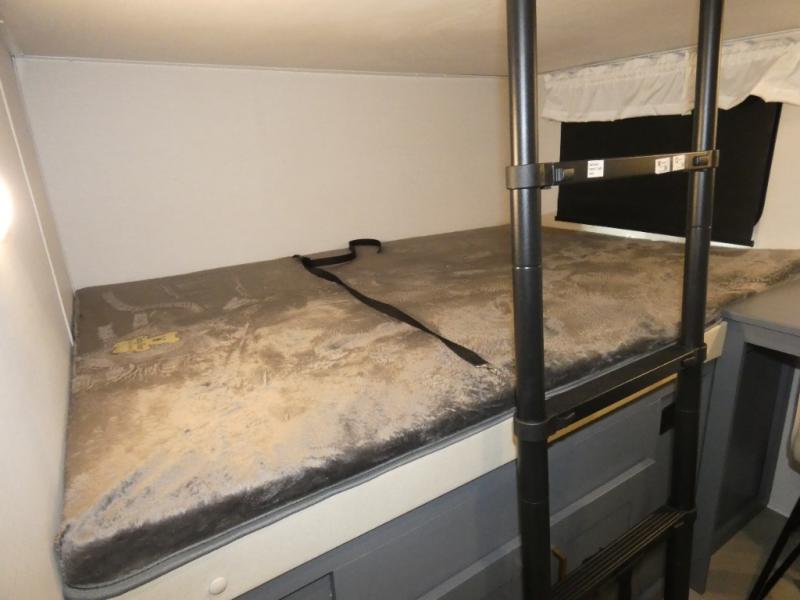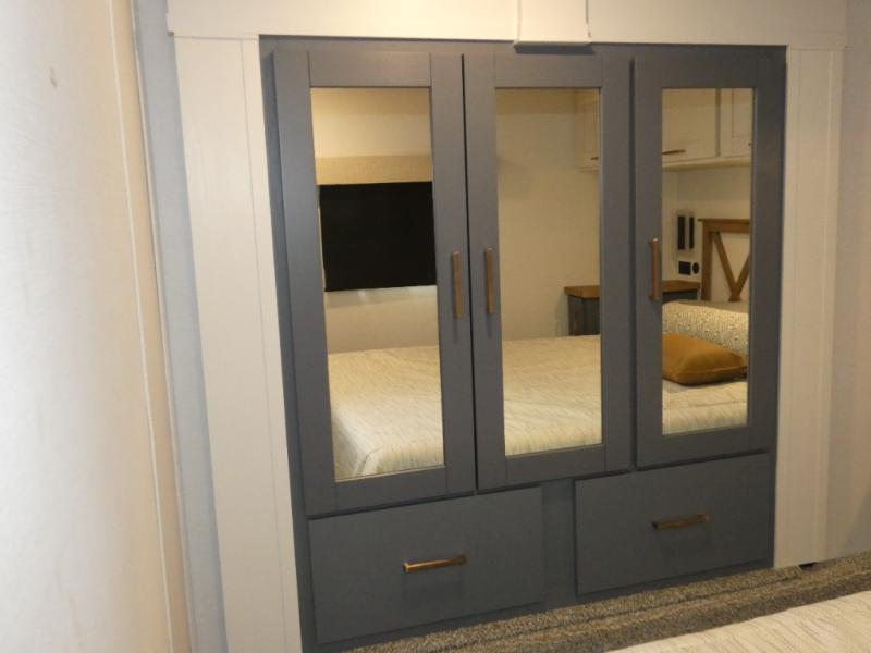 A rear private bunkhouse for your guests and a front private bedroom for you; it's the perfect fifth wheel to camp with a larger group! Four campers can sleep on the double-size bunks, and there is overhead storage plus a desk with drawers below if you need to get some work done. You'll find your own storage in the front private bedroom within the wardrobe slide, plus there are dual nightstands to keep your book, phone, and glasses nearby. Everyone can meet in the combined kitchen and living area in the morning as the cook makes breakfast on the three burner cooktop. You'll find seating spaces on the theater seating or the booth dinette that can be optioned out for a free-standing table with four chairs. Some other stand-out features this model includes are the coat hooks and storage cubbies, the hidden pantry behind the entertainment center, and the outside kitchen!
