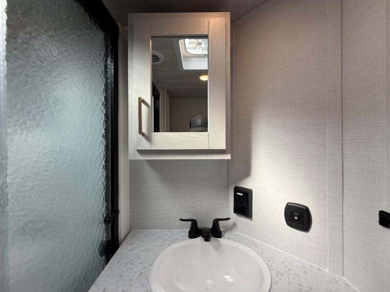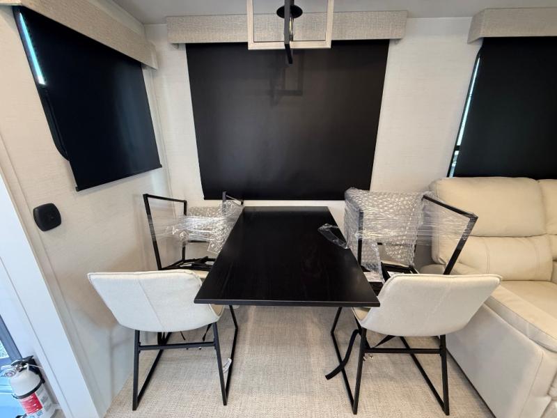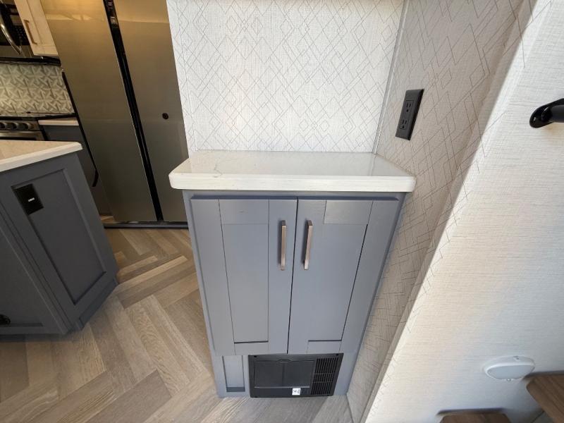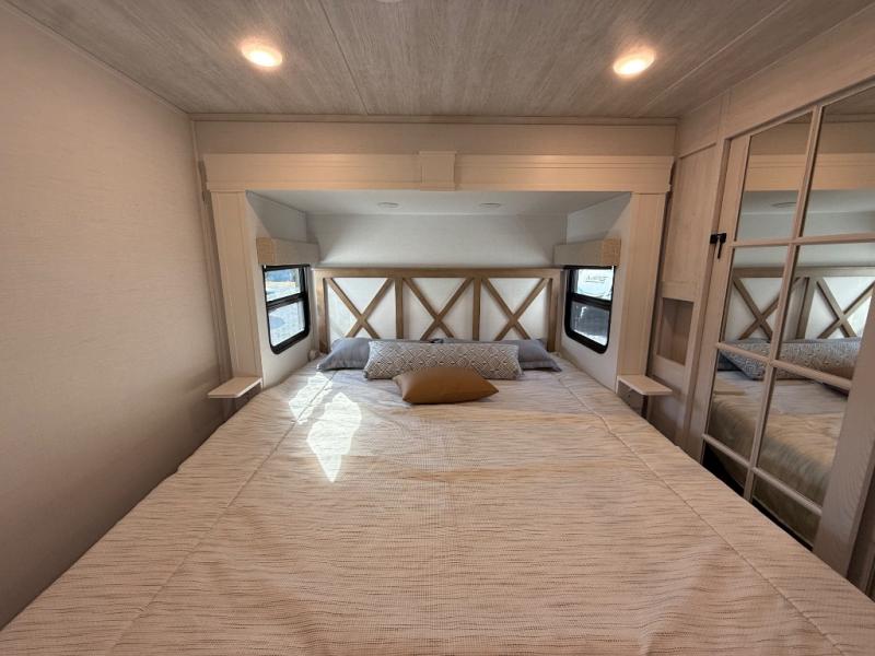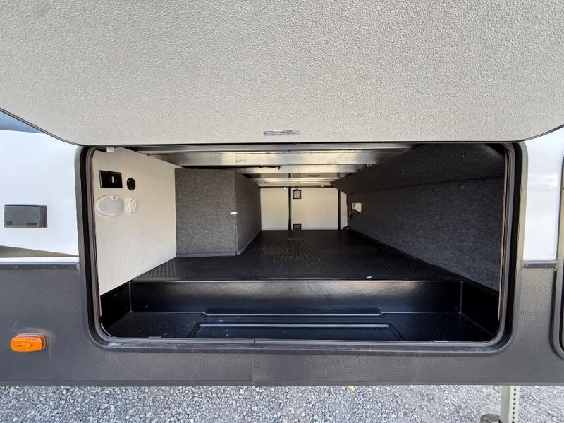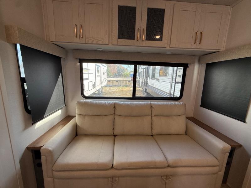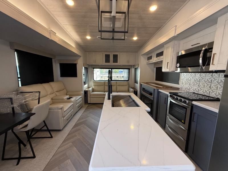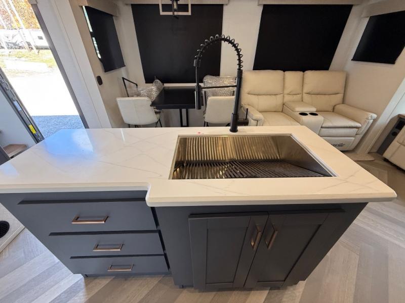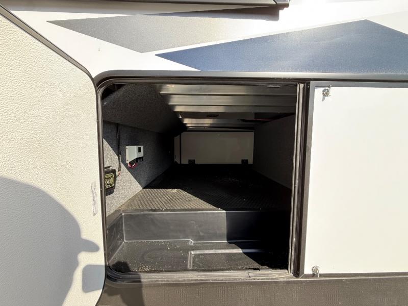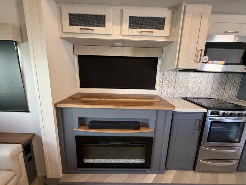 From the front private bedroom with a king bed slide out to the rear living area with theater seating and a fireplace, you'll love every minute spent in this fifth wheel. The dual opposing slides in the main living area provide tons of space to stretch out, and the kitchen island here will tie the whole room together. Your crew can spend the evenings watching a movie on the large LED Smart TV with a lift, or head outdoors to relax under the 15' electric awning with LED lights. The full bath features a shower, plus a Deluxe Skyview skylight for added natural lighting. You won't have to worry about sacrificing storage space thanks to the bedroom wardrobe with mirrored doors, the kitchen walk-in pantry, plus the exterior pass-through storage!