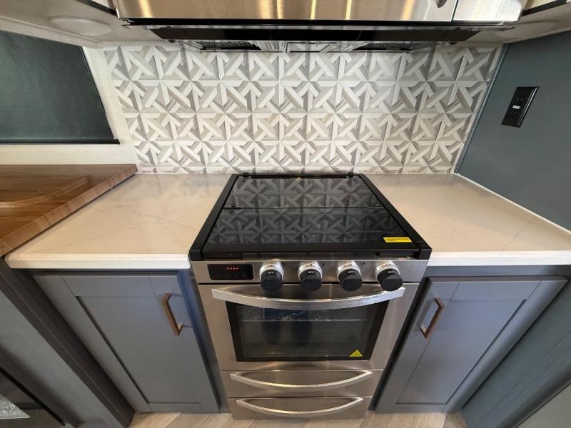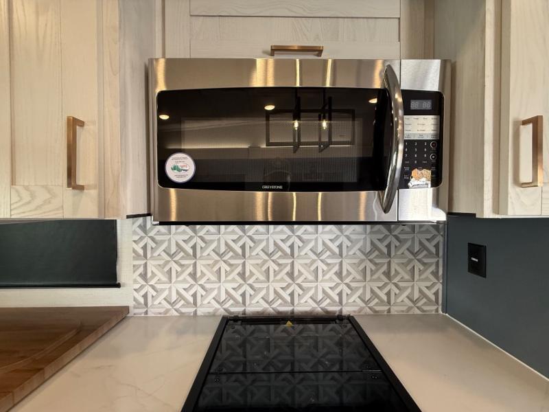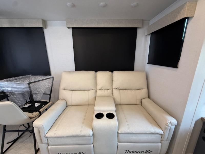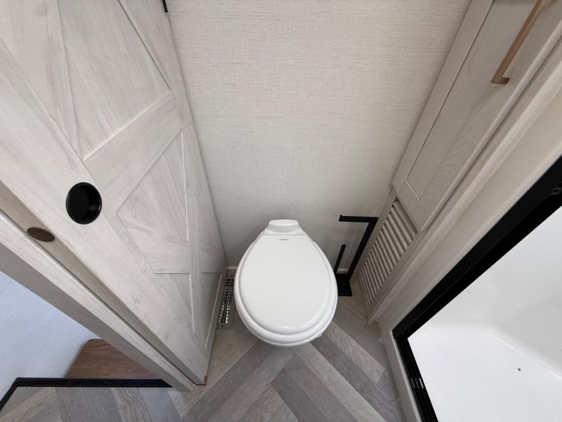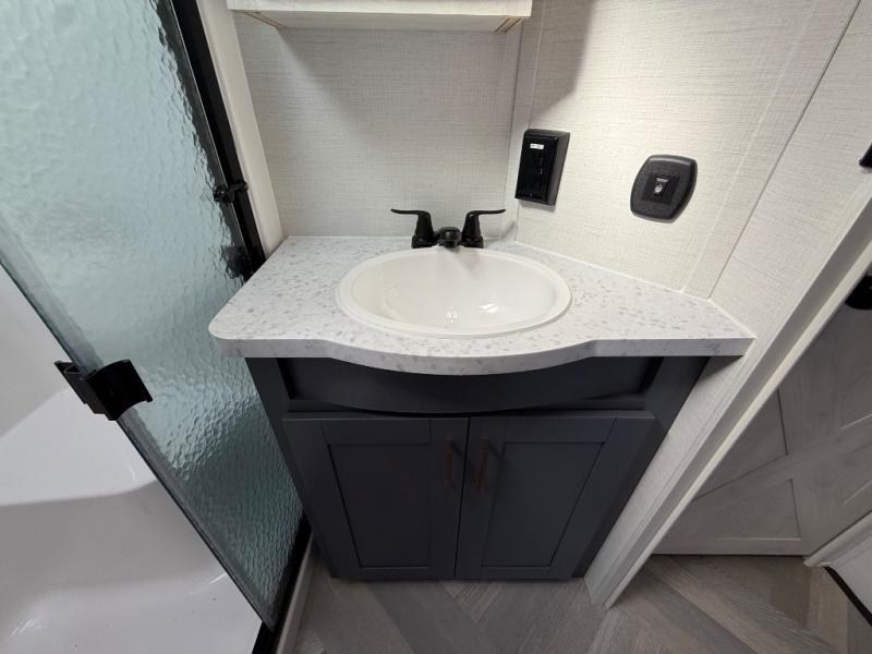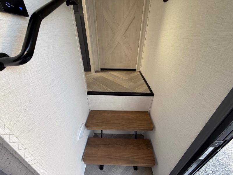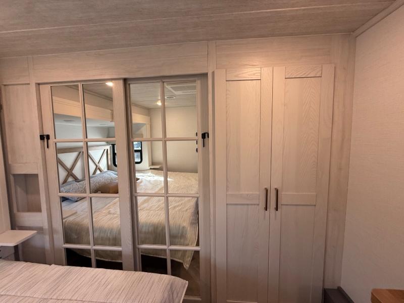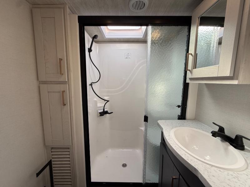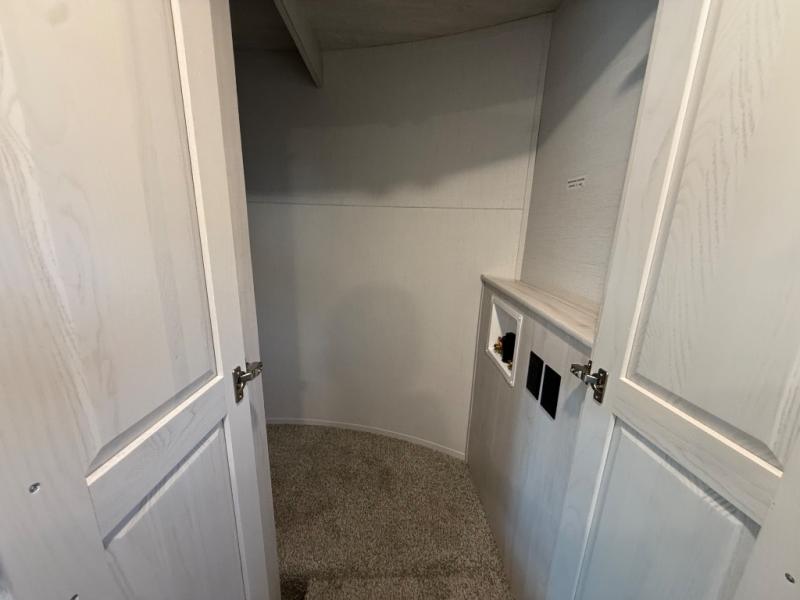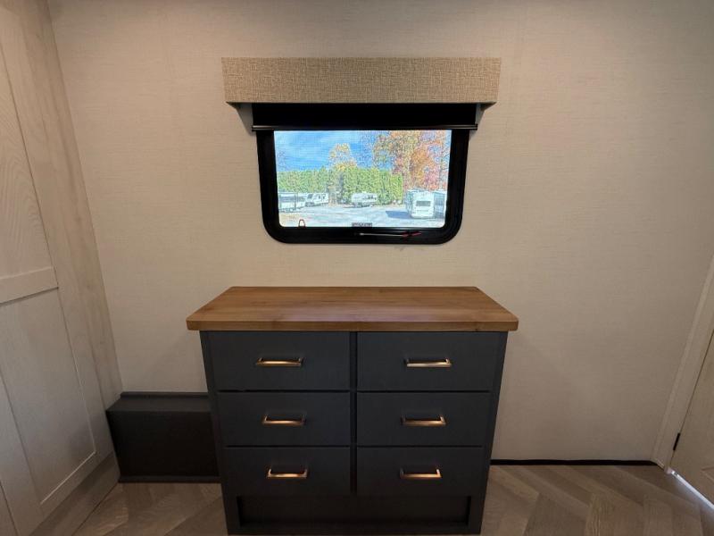 From the front private bedroom with a king bed slide out to the rear living area with theater seating and a fireplace, you'll love every minute spent in this fifth wheel. The dual opposing slides in the main living area provide tons of space to stretch out, and the kitchen island here will tie the whole room together. Your crew can spend the evenings watching a movie on the large LED Smart TV with a lift, or head outdoors to relax under the 15' electric awning with LED lights. The full bath features a shower, plus a Deluxe Skyview skylight for added natural lighting. You won't have to worry about sacrificing storage space thanks to the bedroom wardrobe with mirrored doors, the kitchen walk-in pantry, plus the exterior pass-through storage!