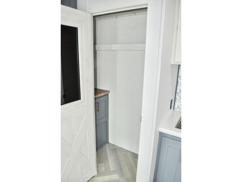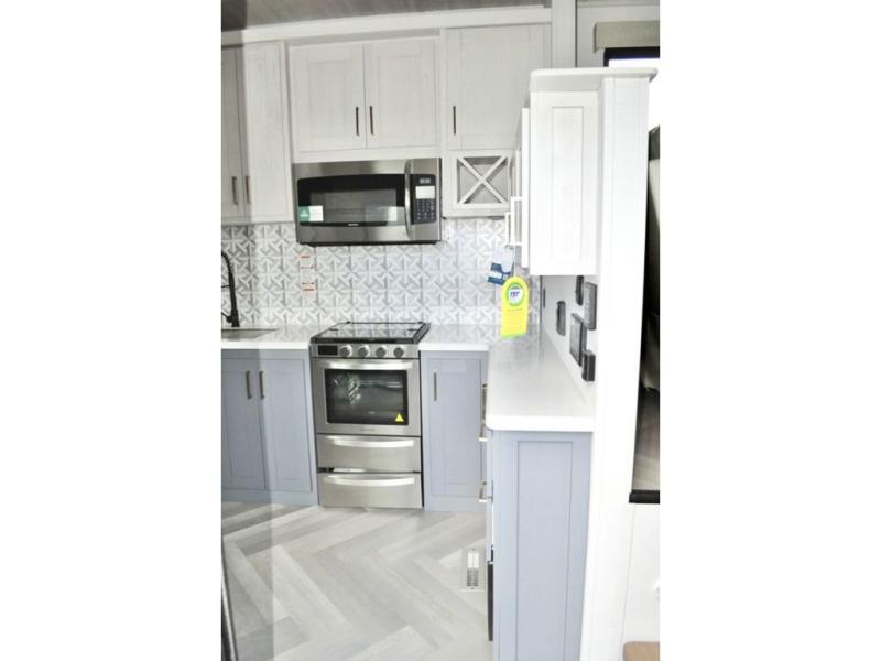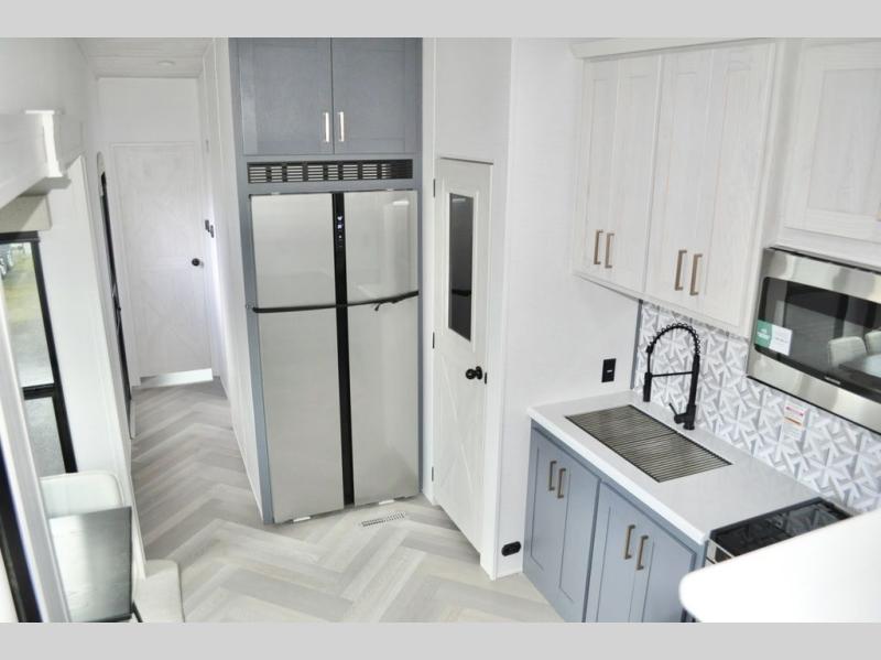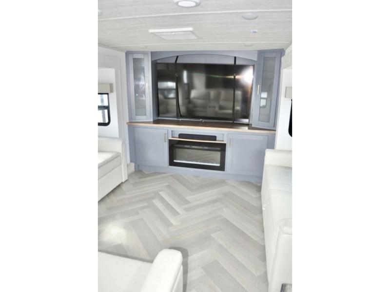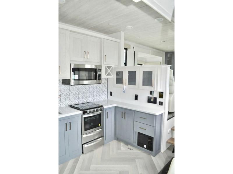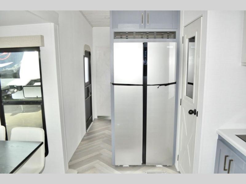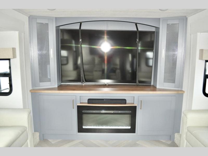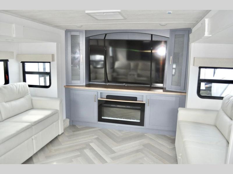 This dual entry fifth wheel is packed with at-home comforts for you and your crew! The front living area includes an entertainment center with a massive 70" LED Smart TV, a cozy fireplace, and two cabinets to keep movies organized. The EZ sofas here within dual opposing slides will make this room open, and the theater seating is right across from the TV for easy viewing. If you have guests staying over, this room will be perfect for them at night! The middle kitchen includes a walk-in pantry, a 21" stainless steel Greystone oven/cooktop, and a 16 cu. ft. French door refrigerator to keep food stocked. The full bath will be waiting for you each day when you come back from exploring, and the rear bedroom with a king bed slide out is sure to make you feel at home. There is also a closet here with washer and dryer prep to make going full-time easier!