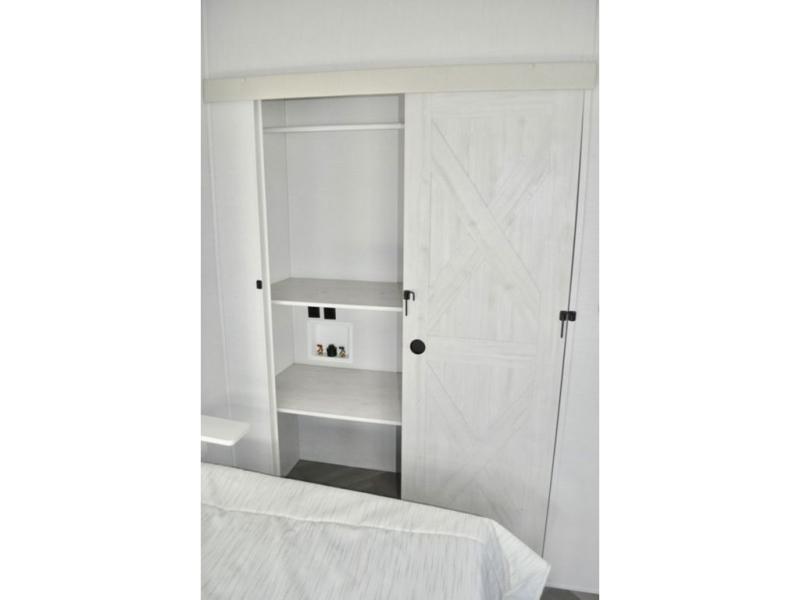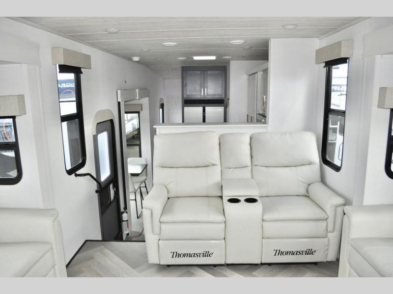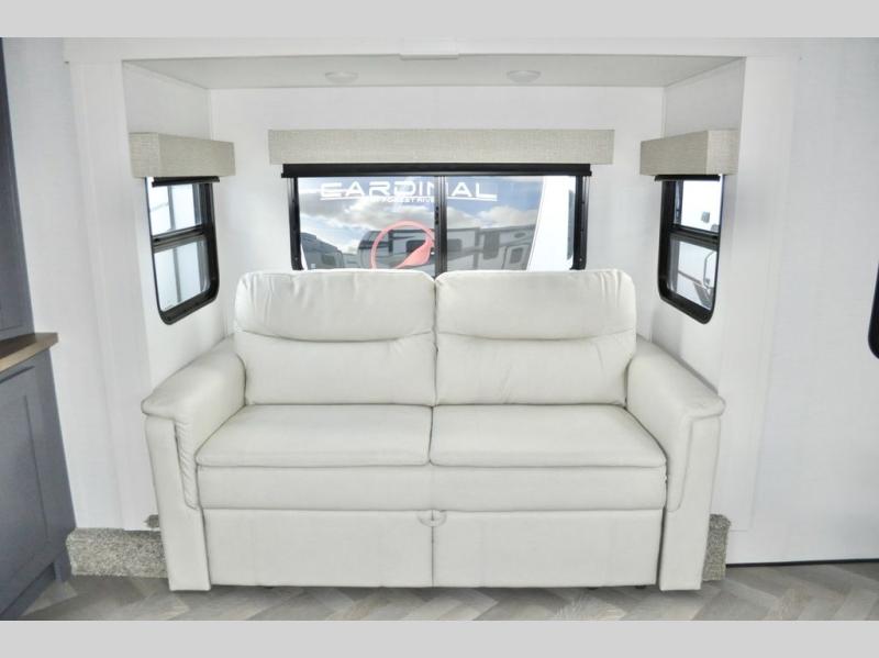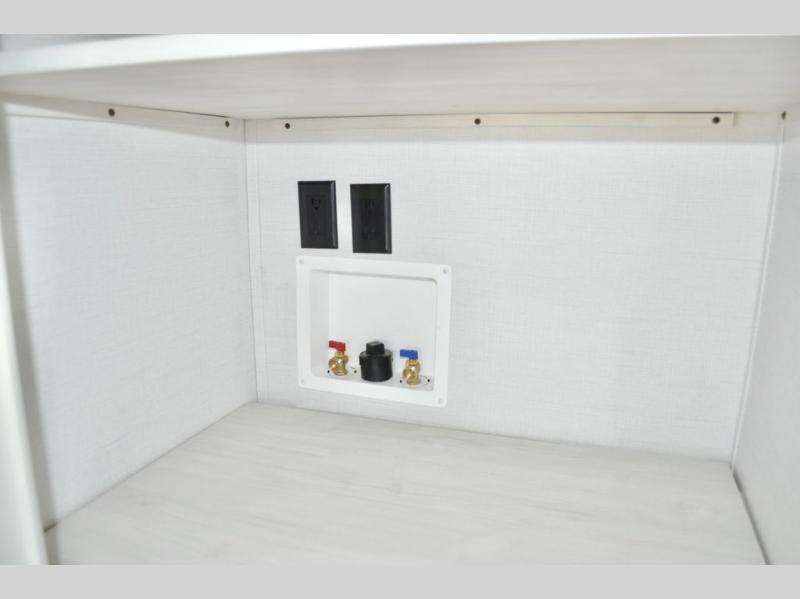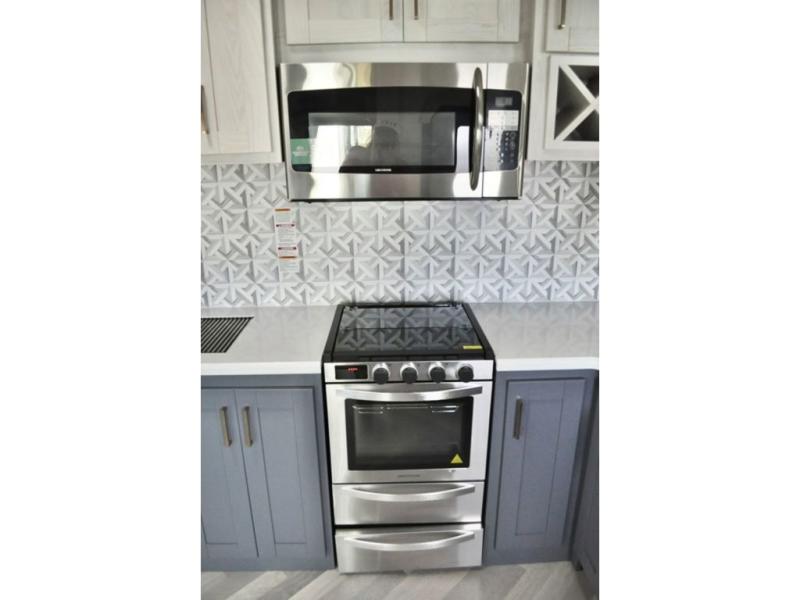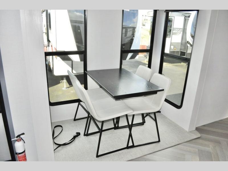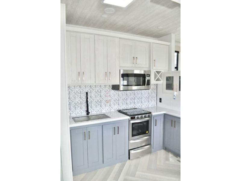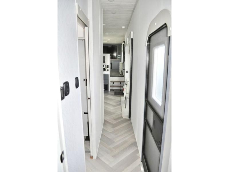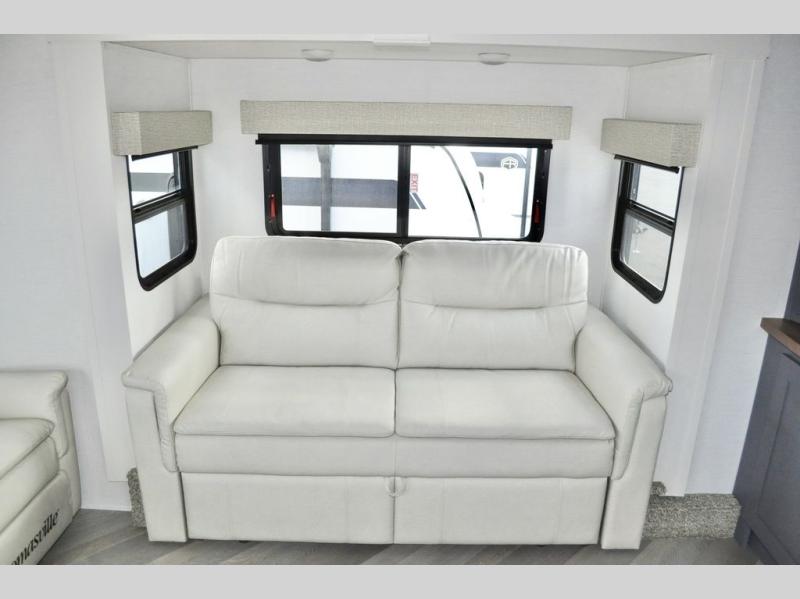 This dual entry fifth wheel is packed with at-home comforts for you and your crew! The front living area includes an entertainment center with a massive 70" LED Smart TV, a cozy fireplace, and two cabinets to keep movies organized. The EZ sofas here within dual opposing slides will make this room open, and the theater seating is right across from the TV for easy viewing. If you have guests staying over, this room will be perfect for them at night! The middle kitchen includes a walk-in pantry, a 21" stainless steel Greystone oven/cooktop, and a 16 cu. ft. French door refrigerator to keep food stocked. The full bath will be waiting for you each day when you come back from exploring, and the rear bedroom with a king bed slide out is sure to make you feel at home. There is also a closet here with washer and dryer prep to make going full-time easier!