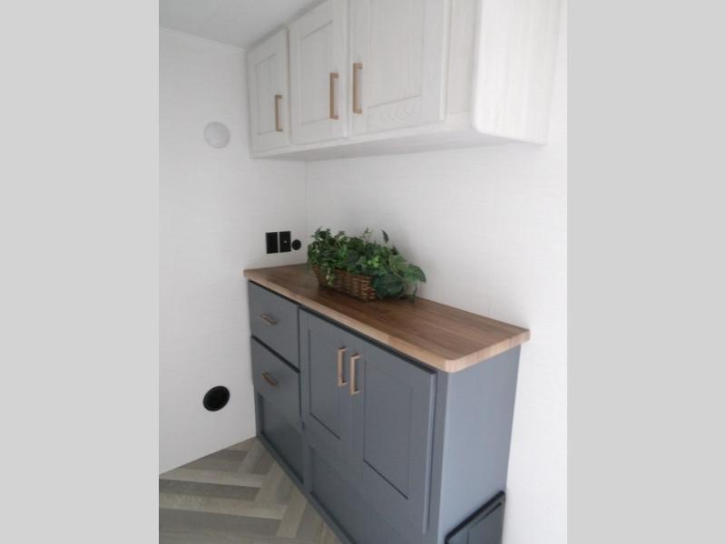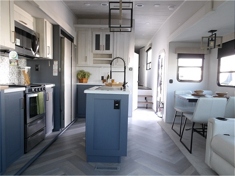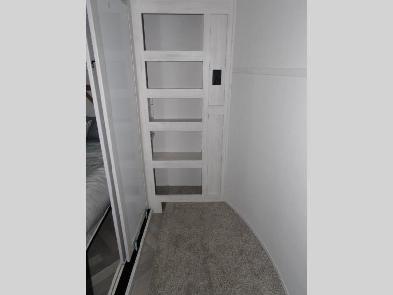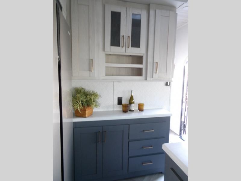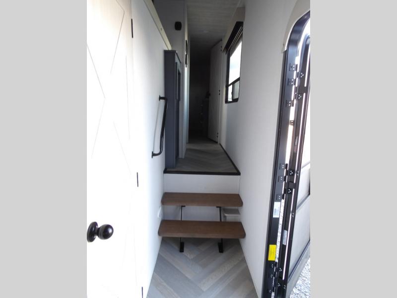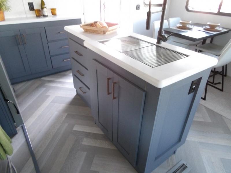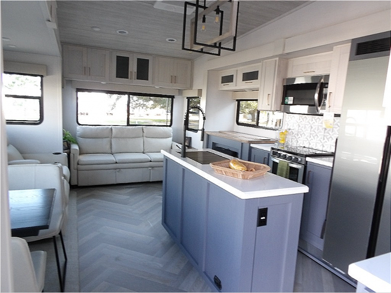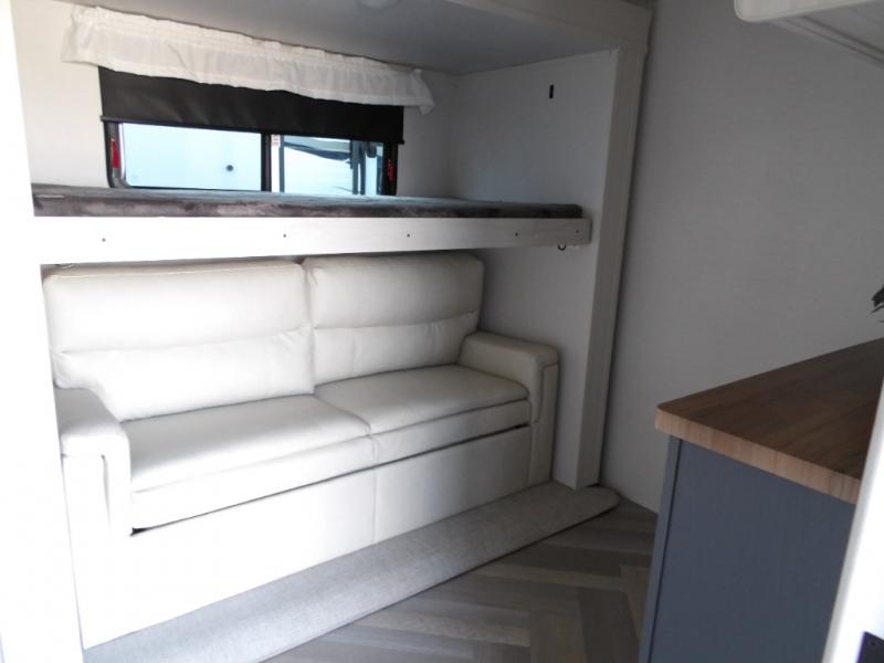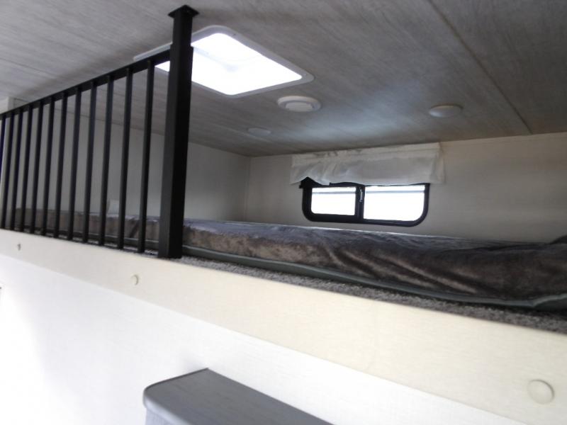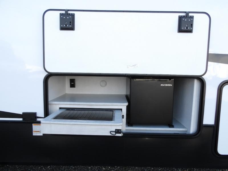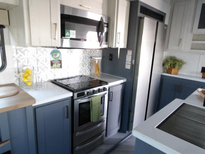 This fifth wheel is one your whole crew will love thanks to the middle bunkroom with a "Sleep & Play" sofa, an upper bunk, a dresser for storage, plus a loft above this room! You will enjoy the front private bedroom all to yourselves with a king bed slide out, a large wardrobe with washer and dryer prep, plus a dresser for more storage. When you're not outdoors relaxing under the 19' electric awning with LED lights, head to the rear living area to sit back on the theater seating or the EZ glide sofa. You'll also find an LED Smart TV here and a booth dinette for game night, or you can choose the free-standing chairs option. The chef will love the outside kitchen just as much as the indoor kitchen with an island, two pantries, and a 16 cu. ft. French door refrigerator!