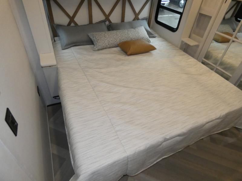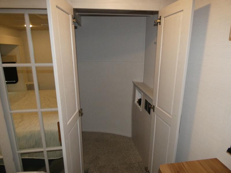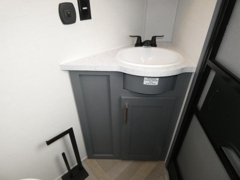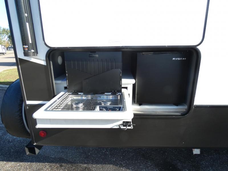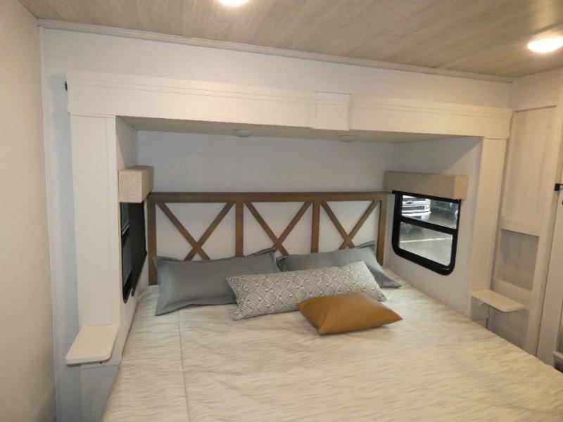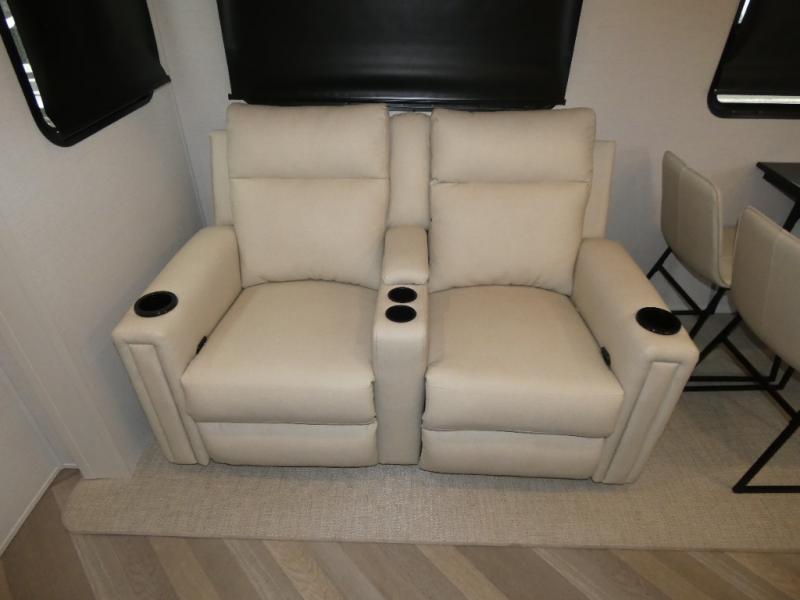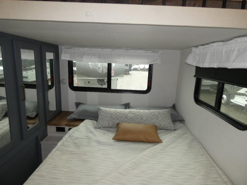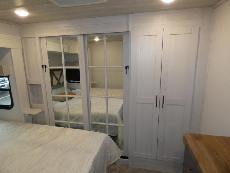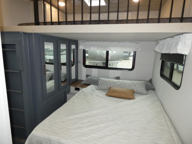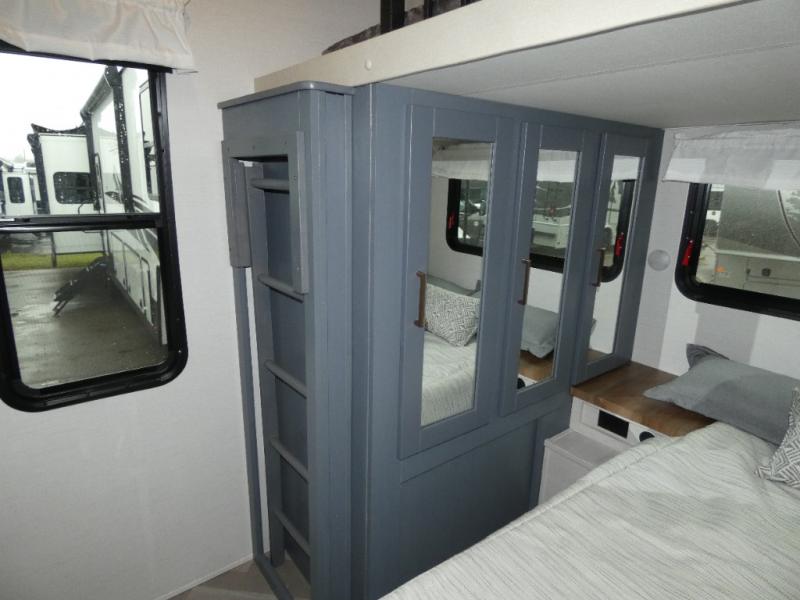 Friends and family will love to tag along to the campground in this dual entry, bath and a half, two-bedroom fifth wheel! A king bed comes standard in the front bedroom, along with a front wardrobe and a dresser for clothes storage. Your guests can take the rear bedroom with a 54" x 75" bed with a loft bed above, plus a half bath with its own exterior entry door. Meet in the central living area on the theater seating and across from the LED Smart TV, or head outdoors to relax under the 15' awning. The chef will love the interior kitchen since it has a kitchen island, but they may decide to cook outdoors on the outside kitchen if they're frying bacon or fish!
