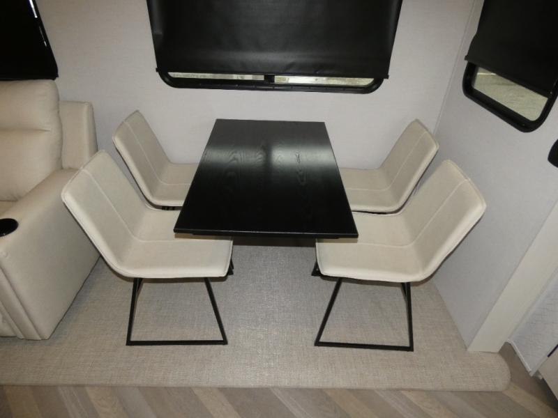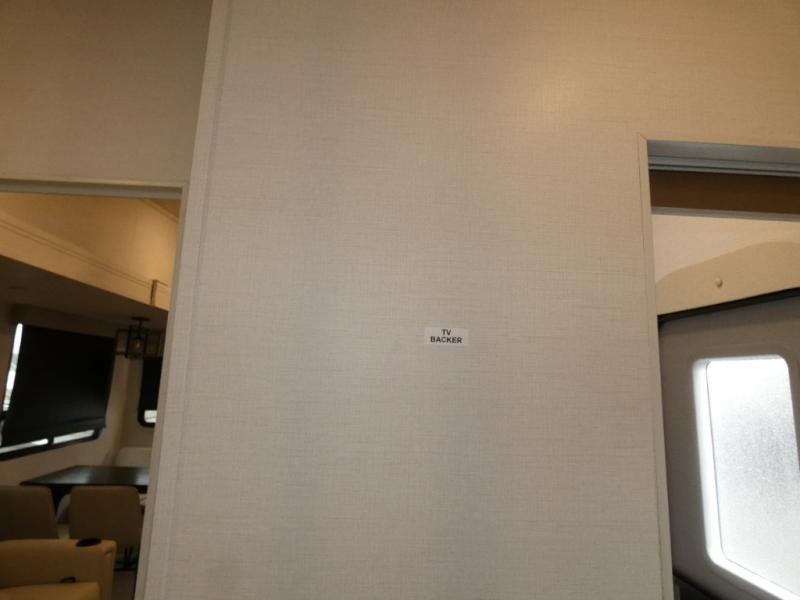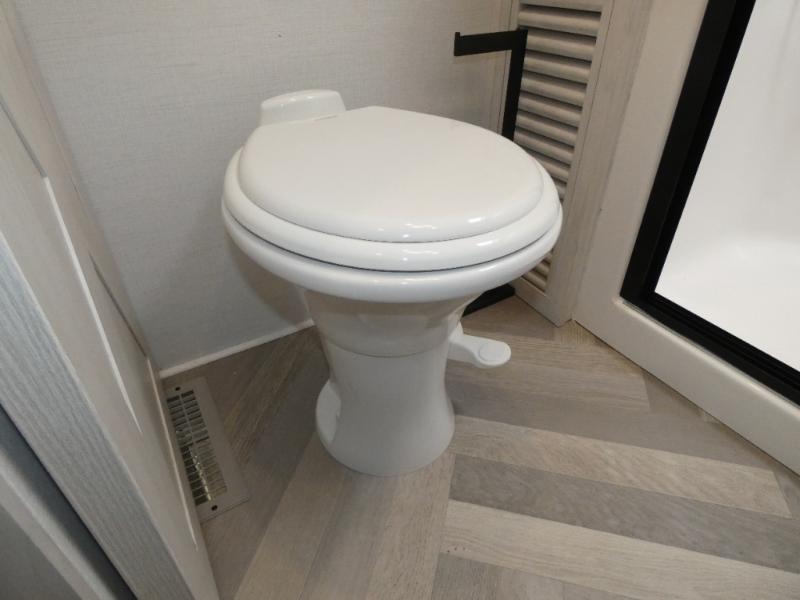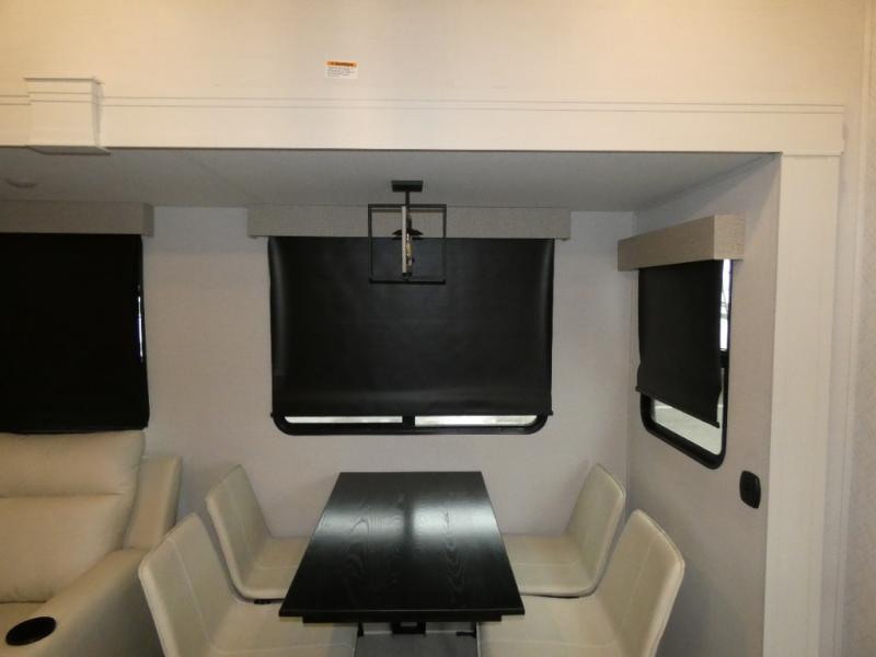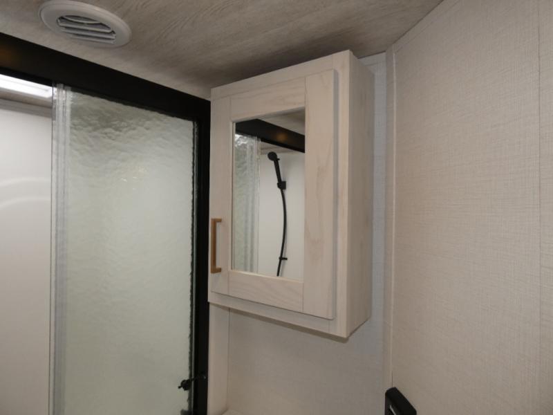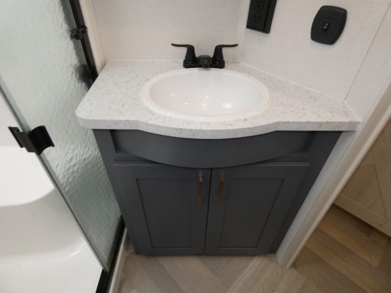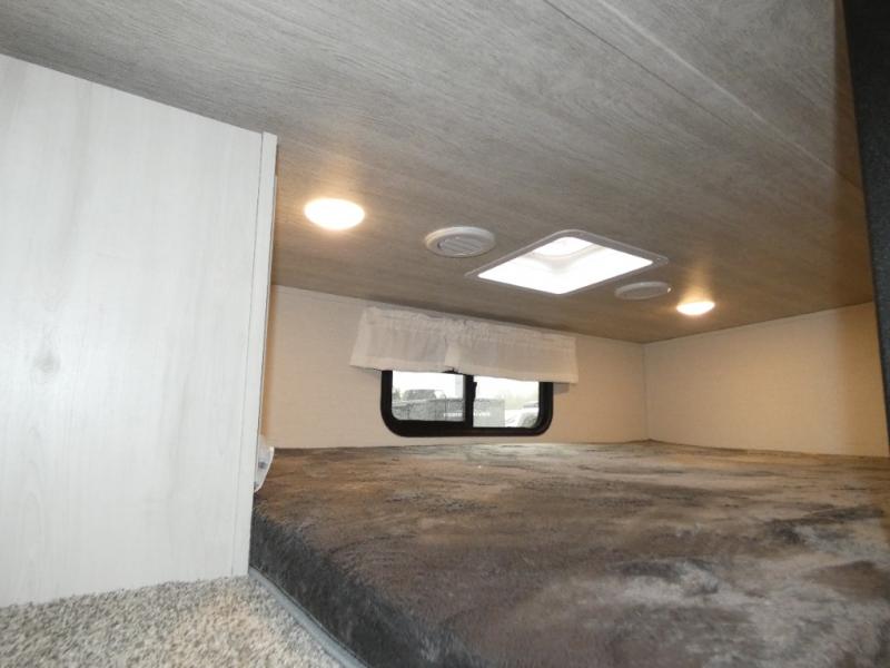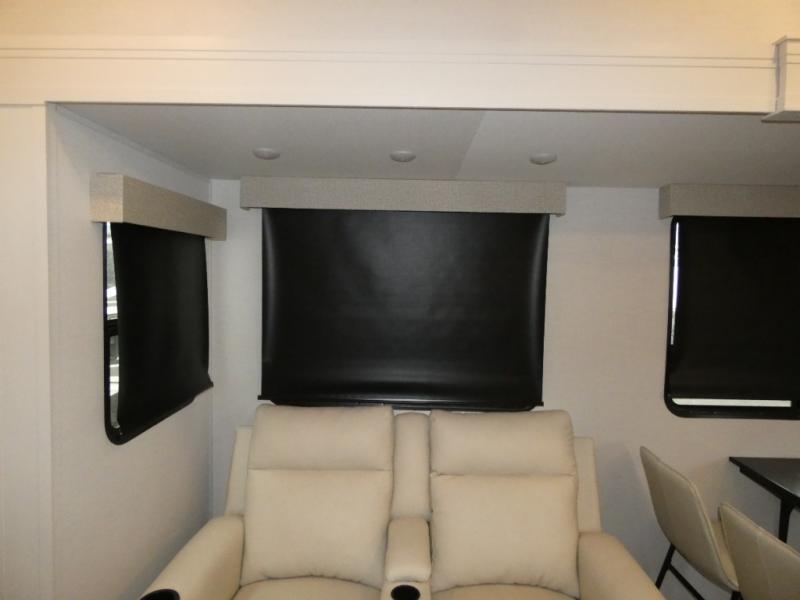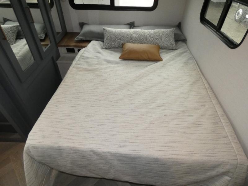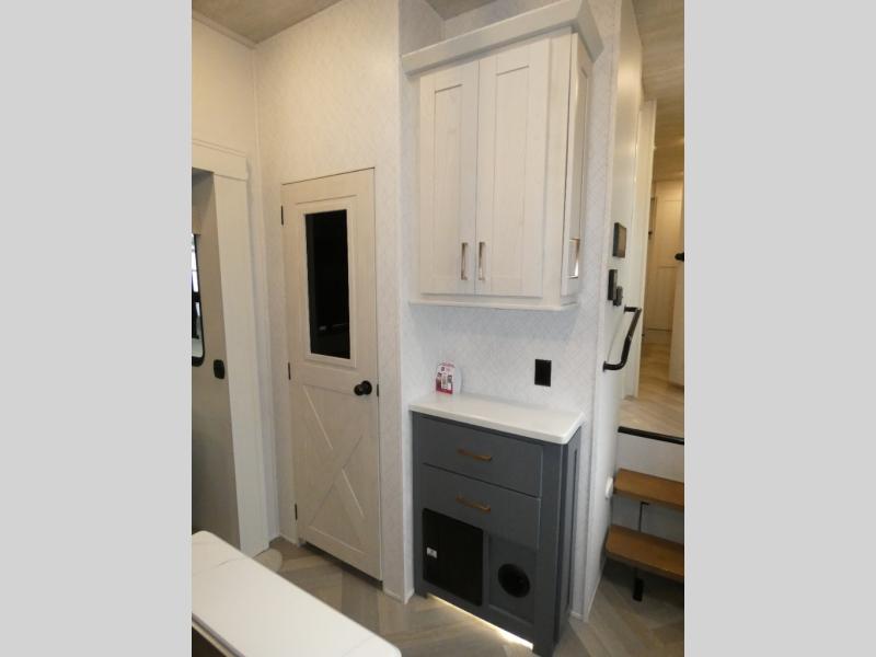 Friends and family will love to tag along to the campground in this dual entry, bath and a half, two-bedroom fifth wheel! A king bed comes standard in the front bedroom, along with a front wardrobe and a dresser for clothes storage. Your guests can take the rear bedroom with a 54" x 75" bed with a loft bed above, plus a half bath with its own exterior entry door. Meet in the central living area on the theater seating and across from the LED Smart TV, or head outdoors to relax under the 15' awning. The chef will love the interior kitchen since it has a kitchen island, but they may decide to cook outdoors on the outside kitchen if they're frying bacon or fish!