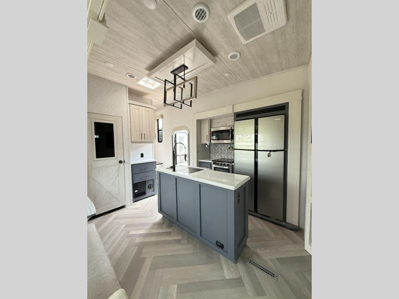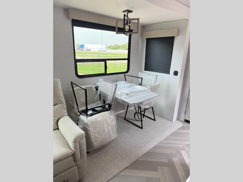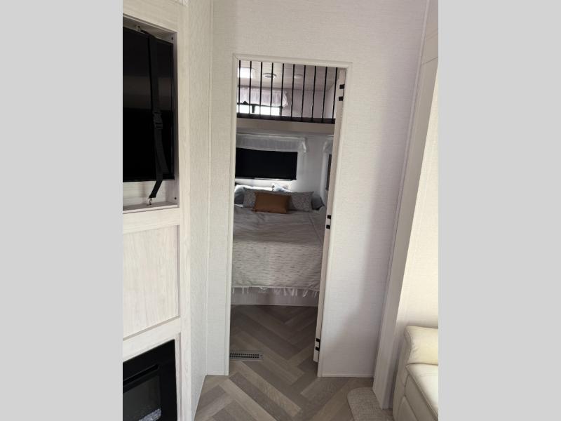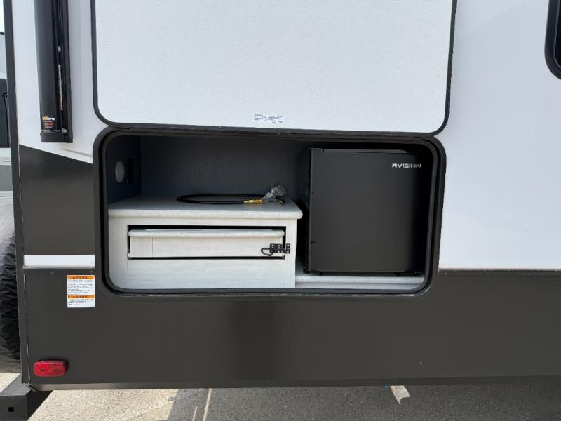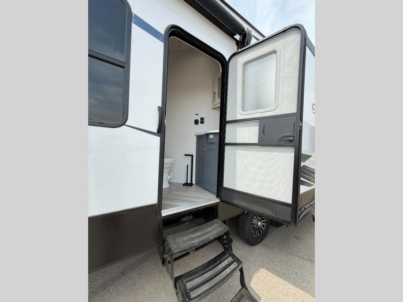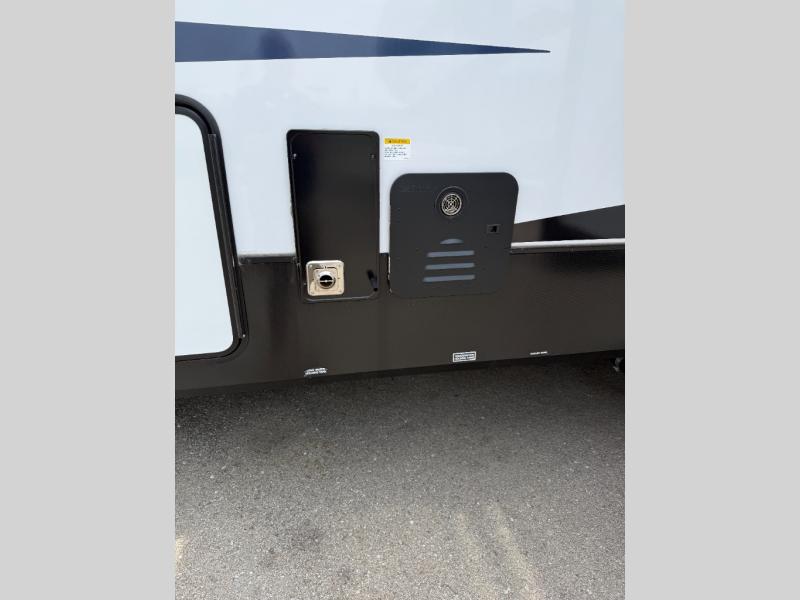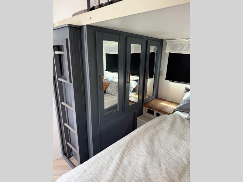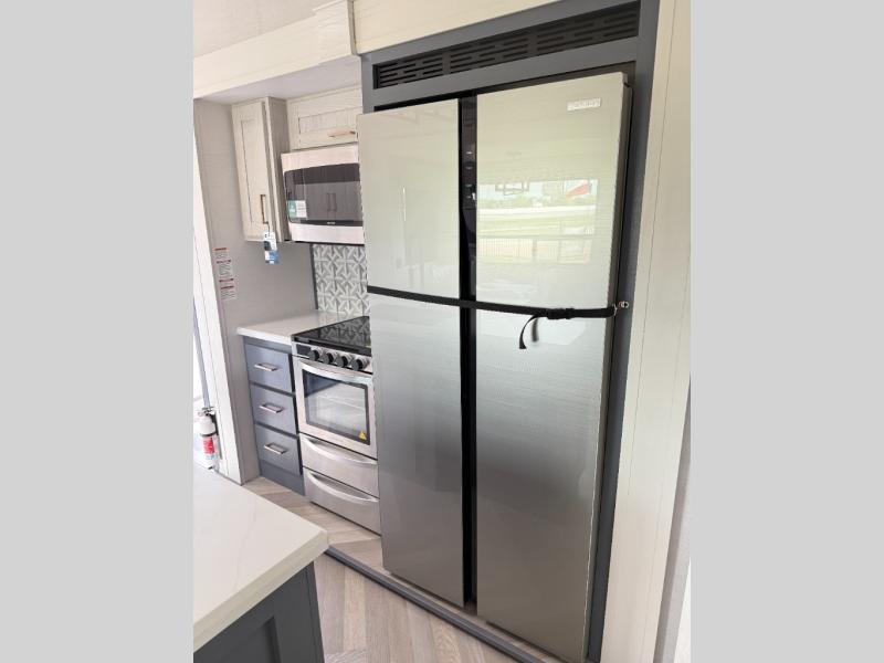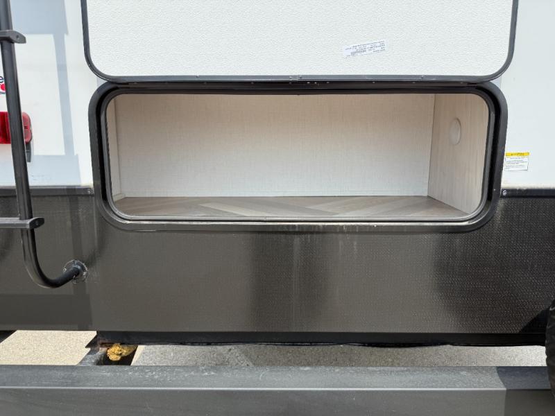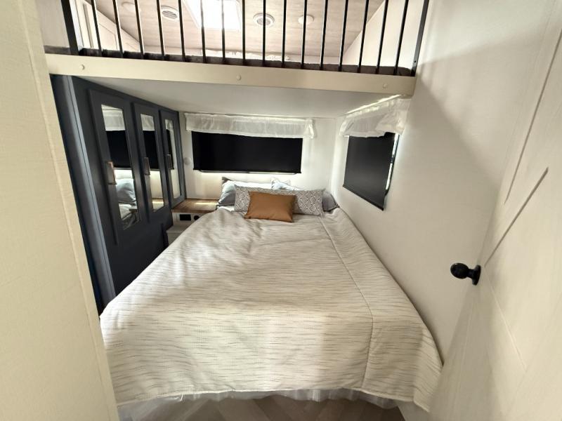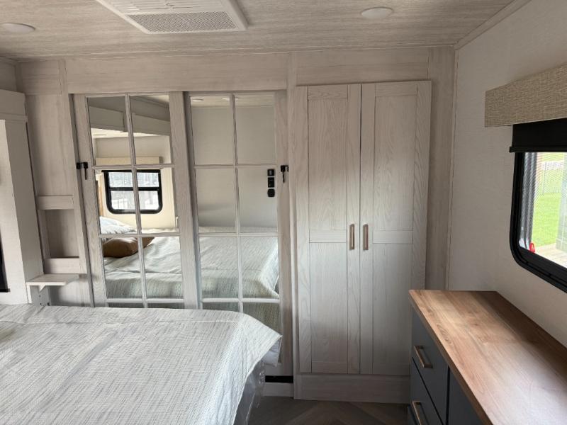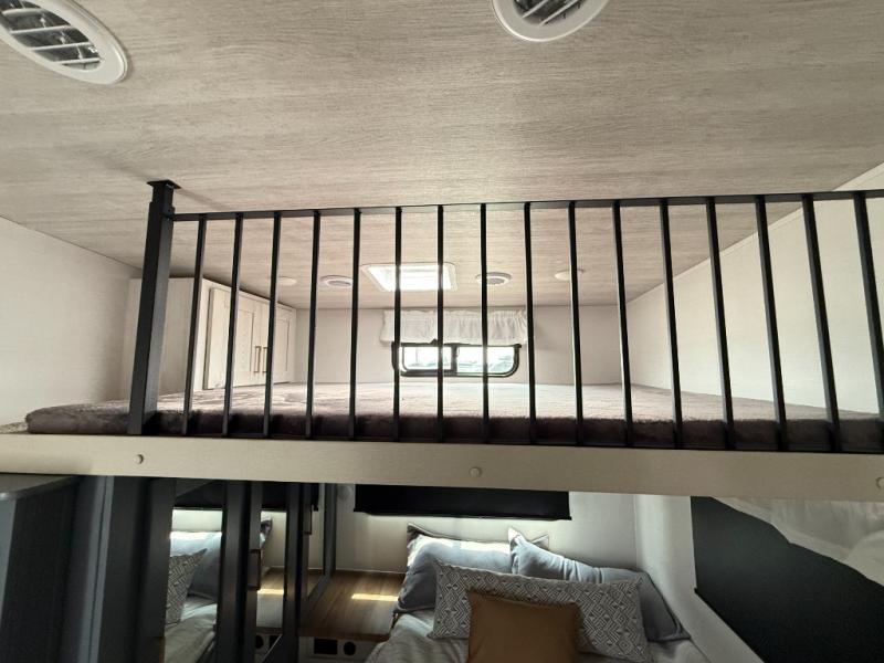Friends and family will love to tag along to the campground in this dual entry, bath and a half, two-bedroom fifth wheel! A king bed comes standard in the front bedroom, along with a front wardrobe and a dresser for clothes storage. Your guests can take the rear bedroom with a 54" x 75" bed with a loft bed above, plus a half bath with its own exterior entry door. Meet in the central living area on the theater seating and across from the LED Smart TV, or head outdoors to relax under the 15' awning. The chef will love the interior kitchen since it has a kitchen island, but they may decide to cook outdoors on the outside kitchen if they're frying bacon or fish!