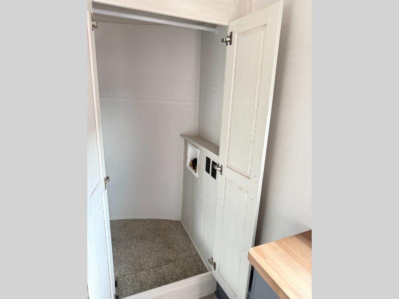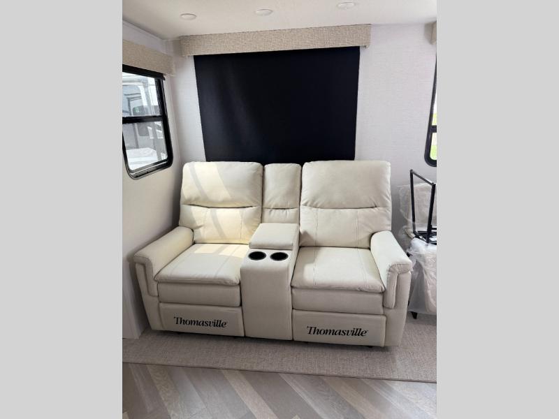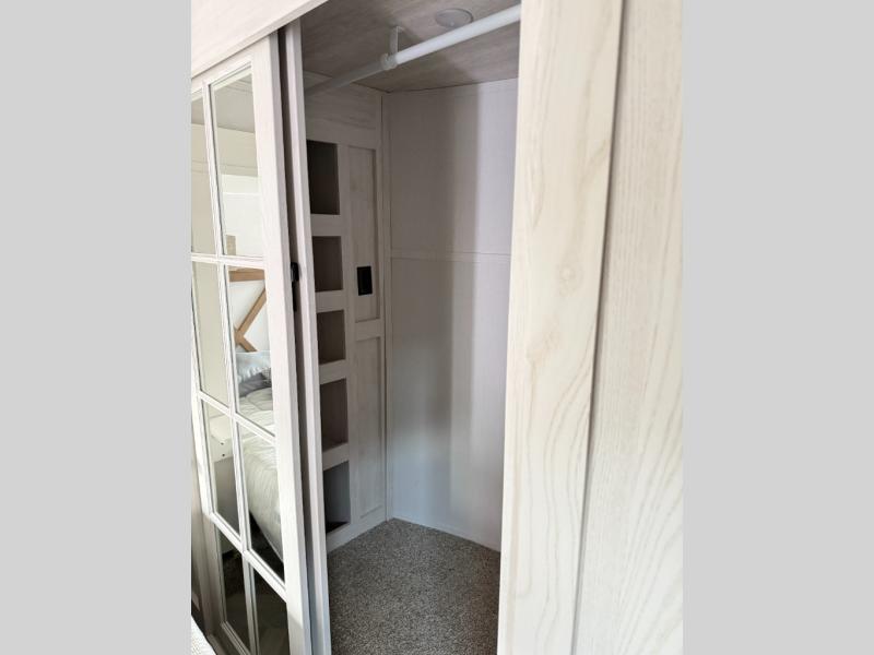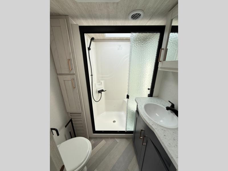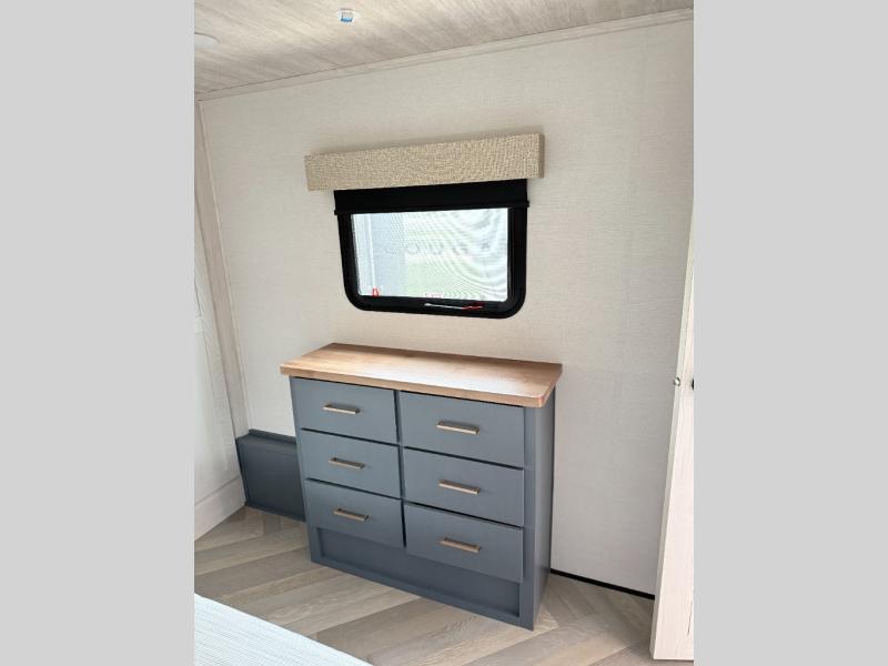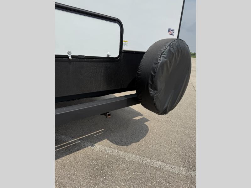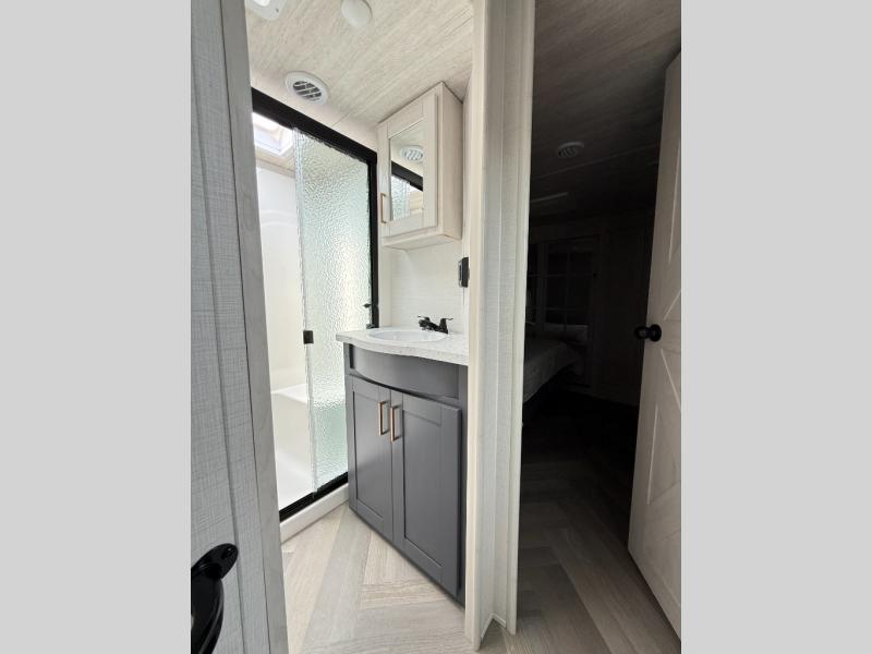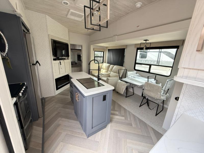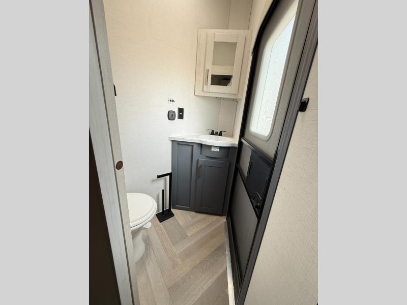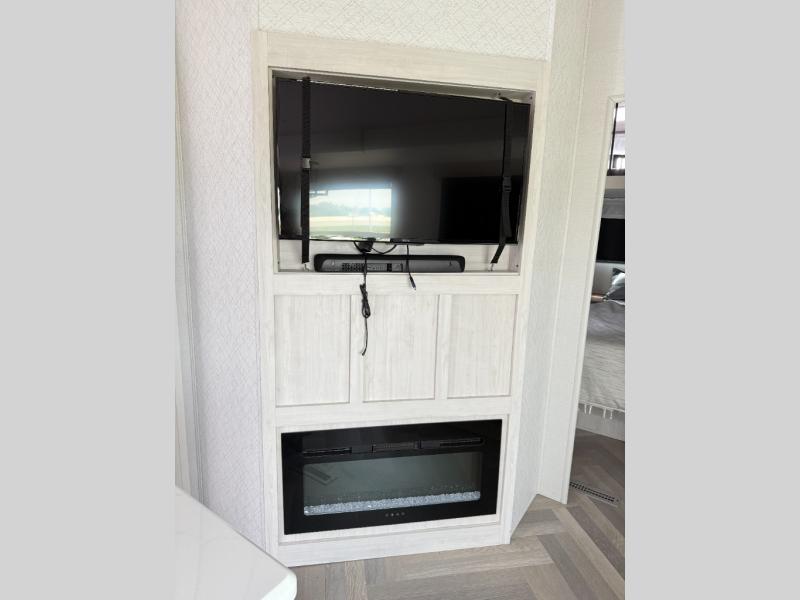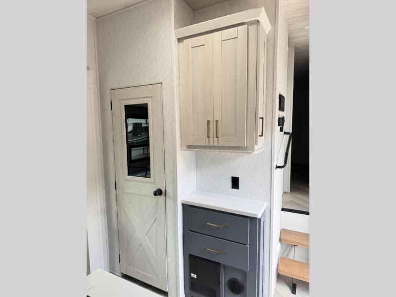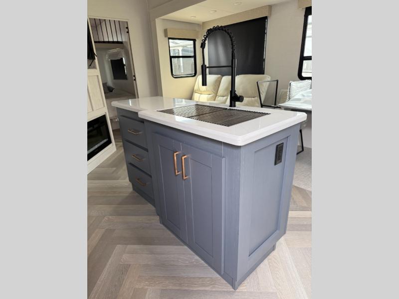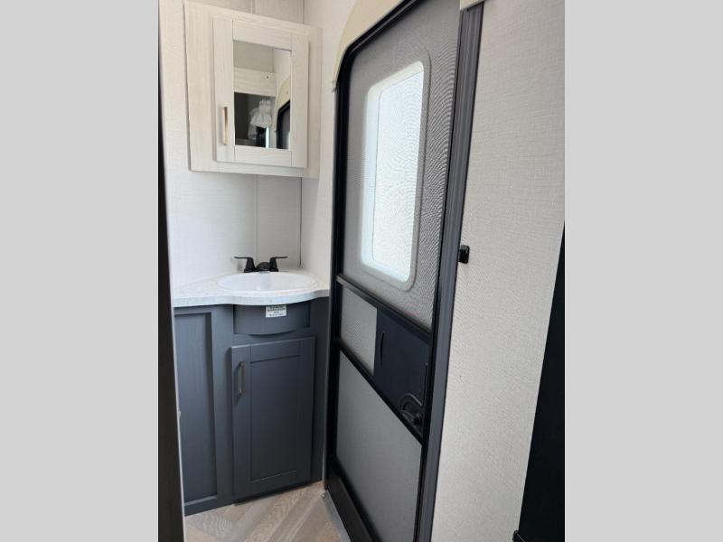Friends and family will love to tag along to the campground in this dual entry, bath and a half, two-bedroom fifth wheel! A king bed comes standard in the front bedroom, along with a front wardrobe and a dresser for clothes storage. Your guests can take the rear bedroom with a 54" x 75" bed with a loft bed above, plus a half bath with its own exterior entry door. Meet in the central living area on the theater seating and across from the LED Smart TV, or head outdoors to relax under the 15' awning. The chef will love the interior kitchen since it has a kitchen island, but they may decide to cook outdoors on the outside kitchen if they're frying bacon or fish!