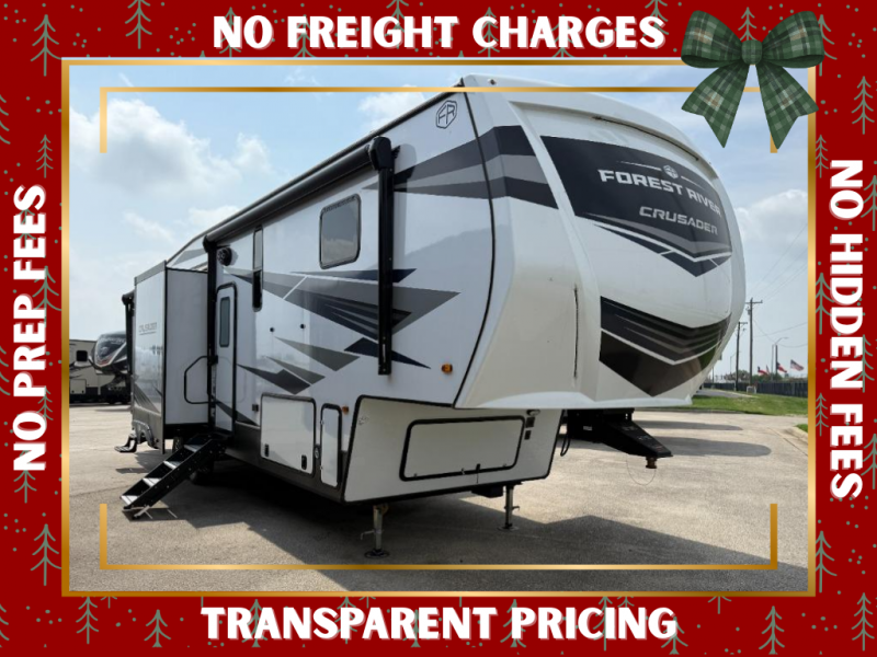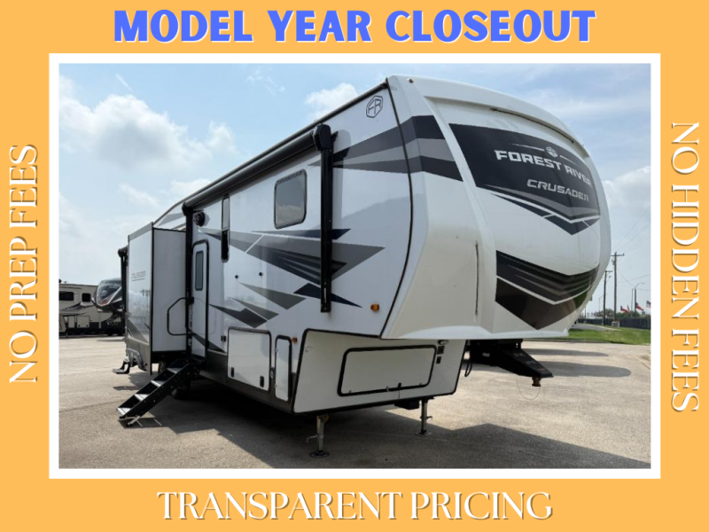 The Crusader fifth wheels by Prime Time RV are a step above the rest and it's not hard to see why. Each model has been constructed to last with its Eternabond construction, a one-piece PVC roof, and high gloss gel coat fiberglass exterior. The auto leveling system and the comprehensive universal docking center will have you set up to camp in no-time, and there is a convenient bottle opener and Doggy D-ring for your furry companions. You will fall in love with the interior that includes heat rated solid surface countertops, designer Carefree linoleum with Scotchgard technology, hardwood cabinet doors, and many more residential comforts. The Crusader also comes standard with dual 15,000 BTU A/C units, a 35,000 BTU high capacity gas furnace, a tankless on-demand water heater, and the Extreme Thermal Package Plus, making your camping season year-around!
