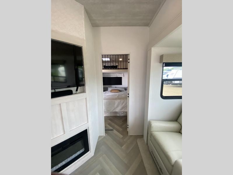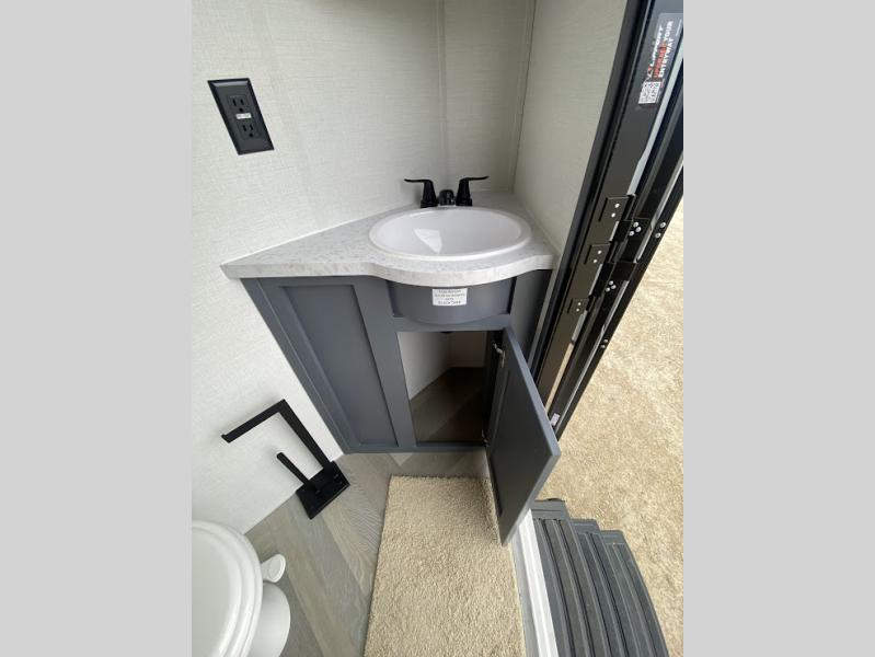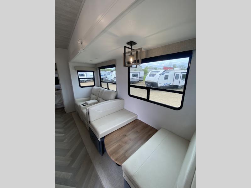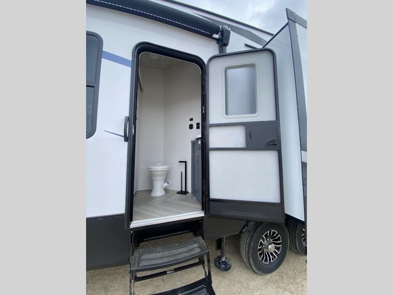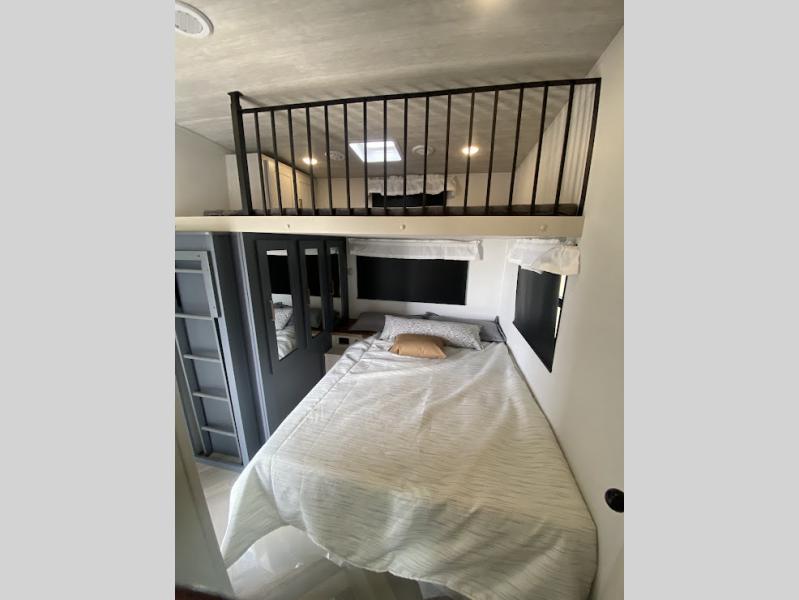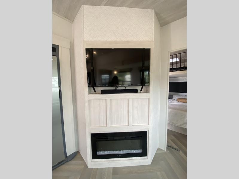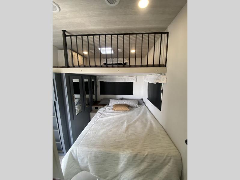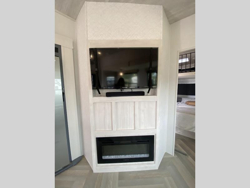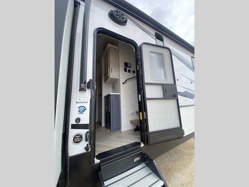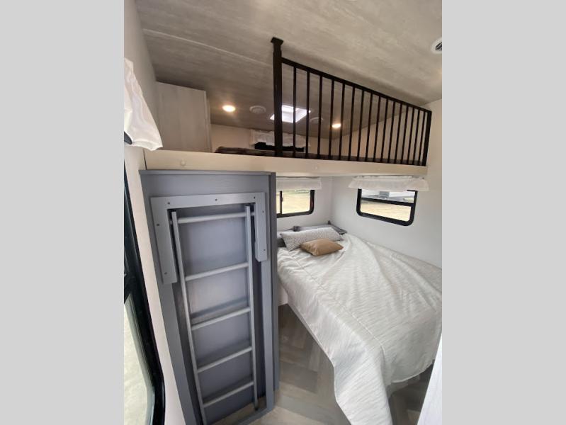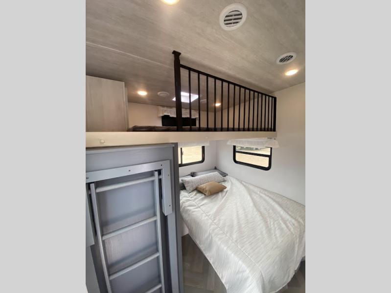Friends and family will love to tag along to the campground in this dual entry, bath and a half, two-bedroom fifth wheel! A king bed comes standard in the front bedroom, along with a front wardrobe and a dresser for clothes storage. Your guests can take the rear bedroom with a 54" x 75" bed with a loft bed above, plus a half bath with its own exterior entry door. Meet in the central living area on the theater seating and across from the LED Smart TV, or head outdoors to relax under the 15' awning. The chef will love the interior kitchen since it has a kitchen island, but they may decide to cook outdoors on the outside kitchen if they're frying bacon or fish!