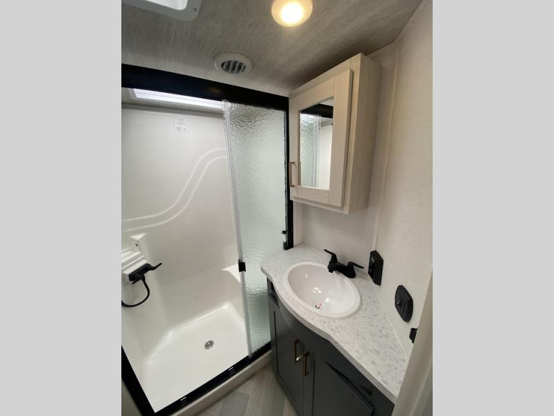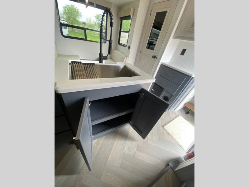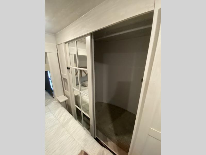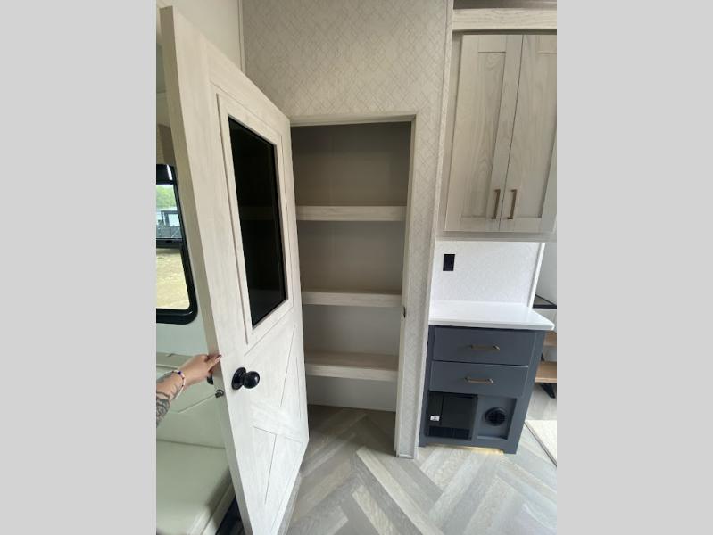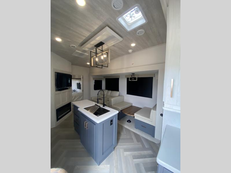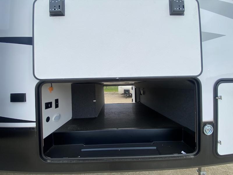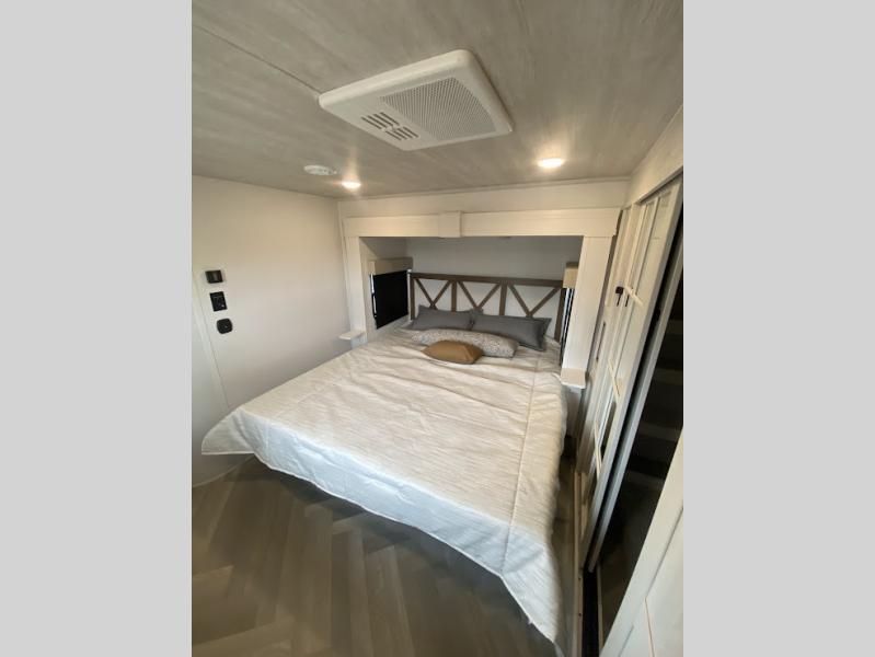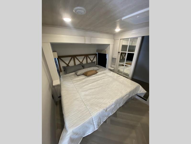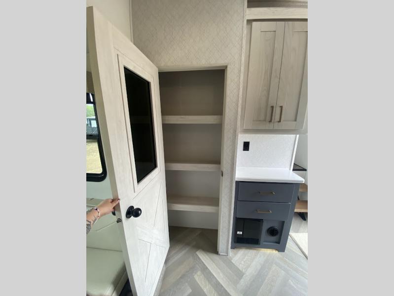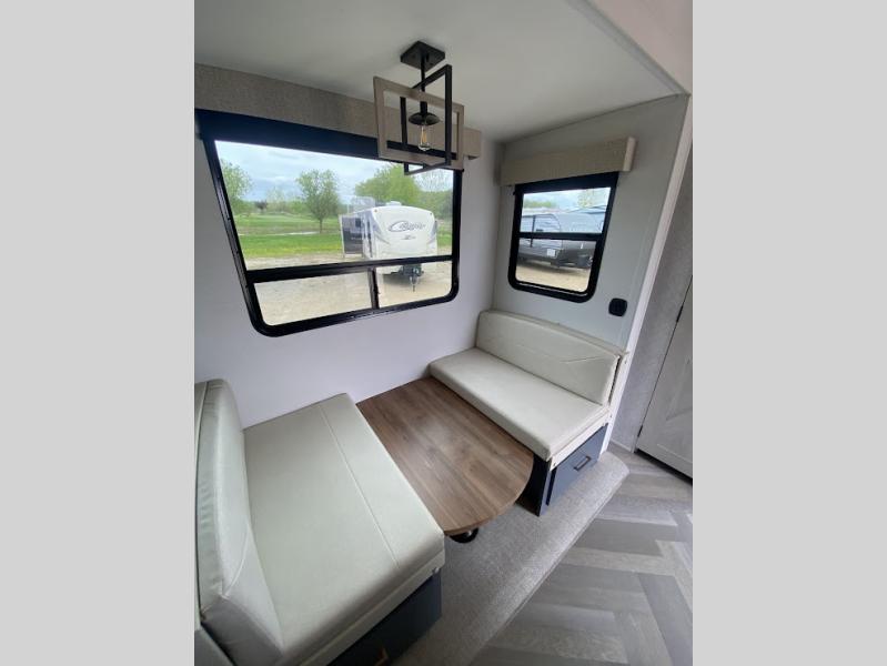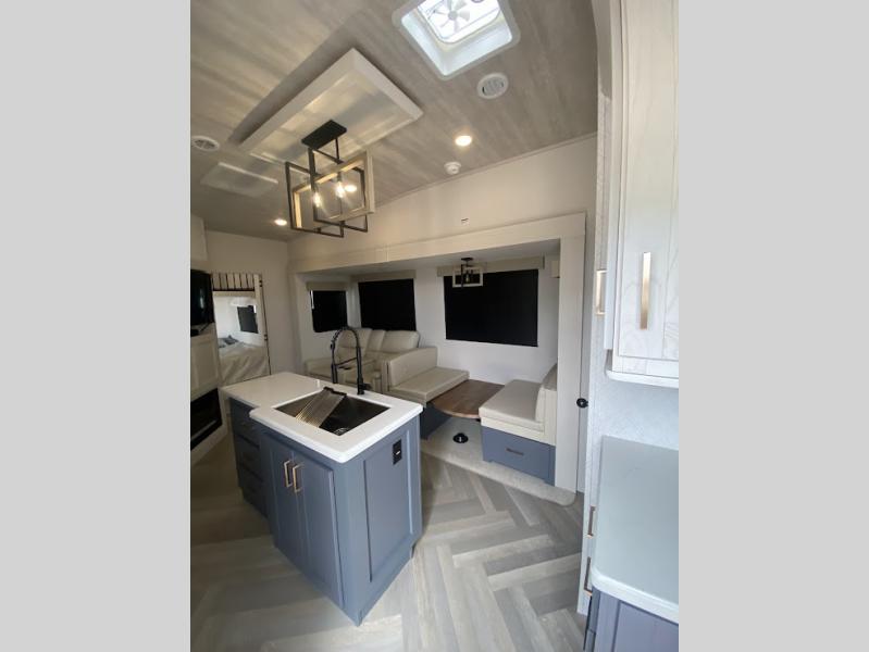 Friends and family will love to tag along to the campground in this dual entry, bath and a half, two-bedroom fifth wheel! A king bed comes standard in the front bedroom, along with a front wardrobe and a dresser for clothes storage. Your guests can take the rear bedroom with a 54" x 75" bed with a loft bed above, plus a half bath with its own exterior entry door. Meet in the central living area on the theater seating and across from the LED Smart TV, or head outdoors to relax under the 15' awning. The chef will love the interior kitchen since it has a kitchen island, but they may decide to cook outdoors on the outside kitchen if they're frying bacon or fish!