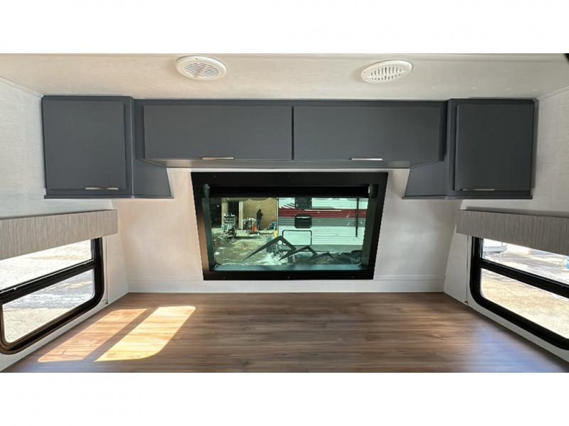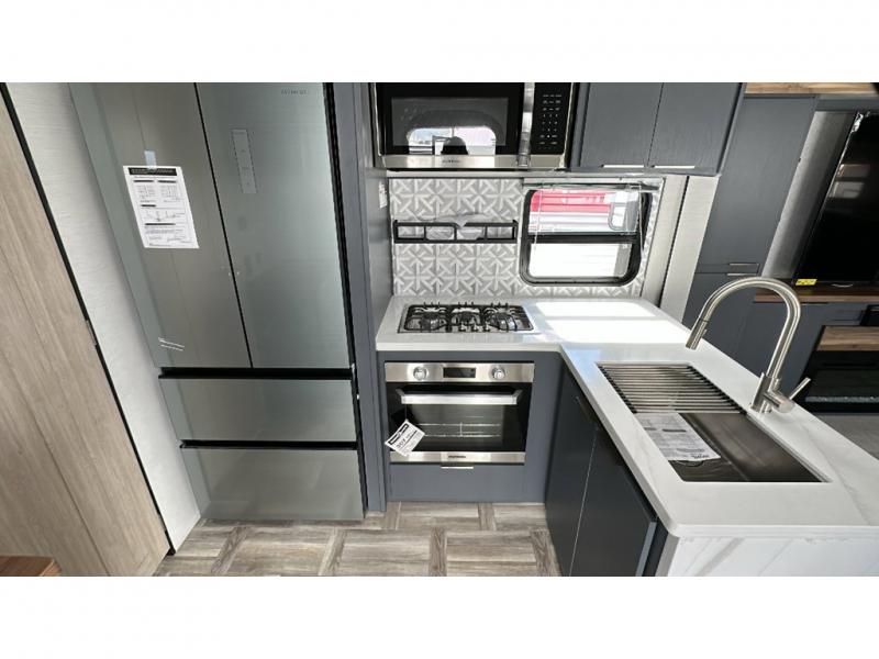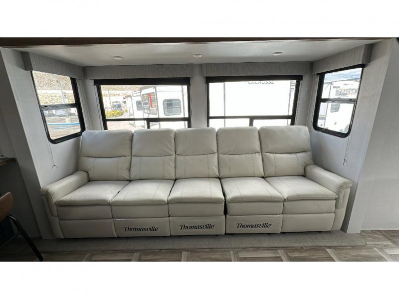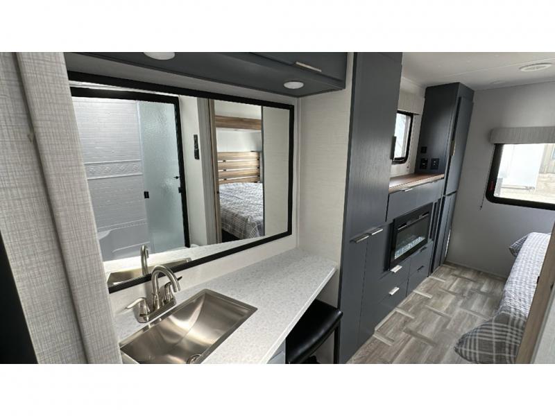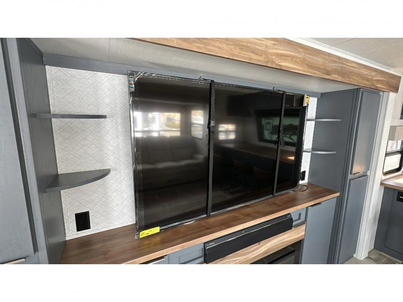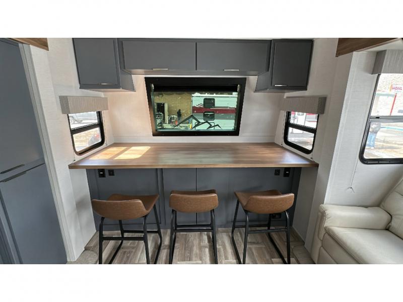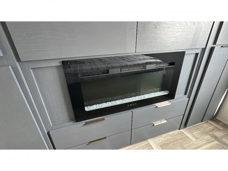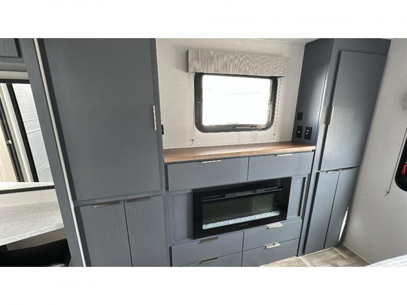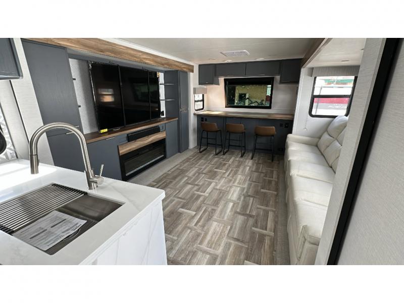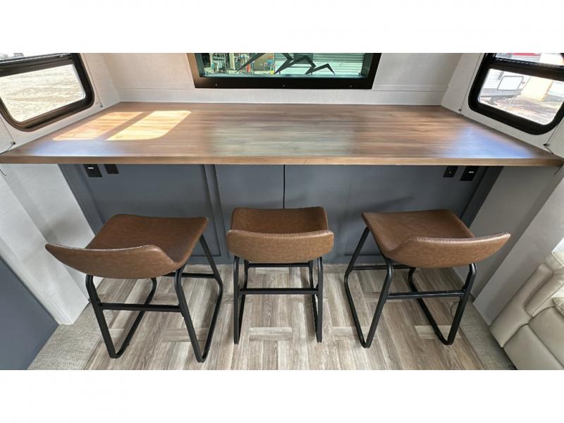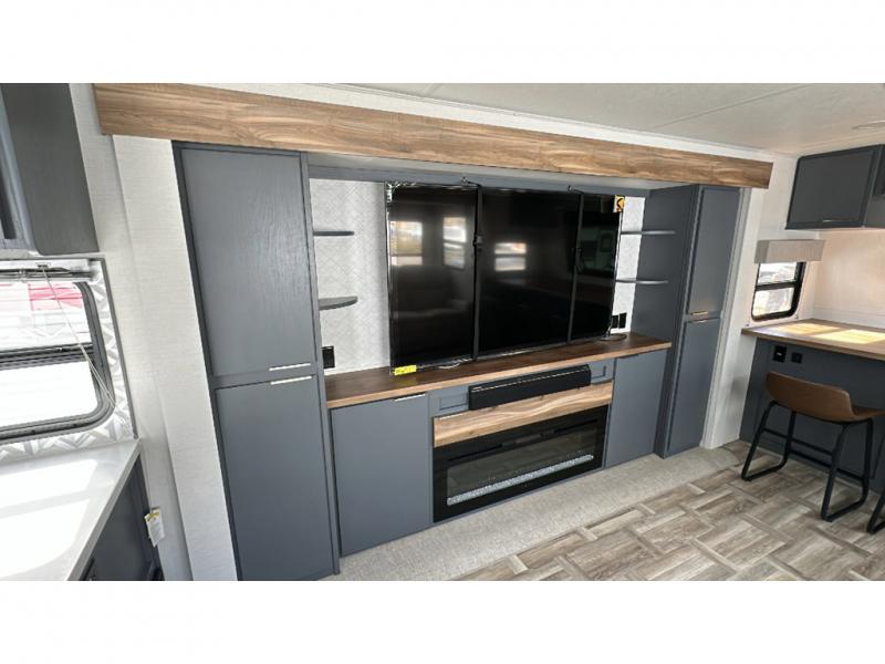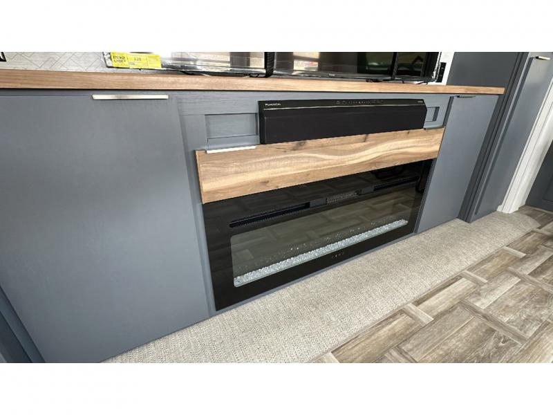 This Lacrosse travel trailer is made for entertaining! The living room is a standout with its unique bar seating at the large front window. This is perfect for eating and drinking, or use it as desk space to work from the road. The sofa sits in its own slide out for extra comfort, and has a great view of the enormous entertainment center with fireplace and 70" TV. A second fireplace warms up the rear bedroom, which also features a king bed slide for maximum floor space. There's a full bath, a well-equipped kitchen, and plenty of storage space. Invite your friends along for a great time!