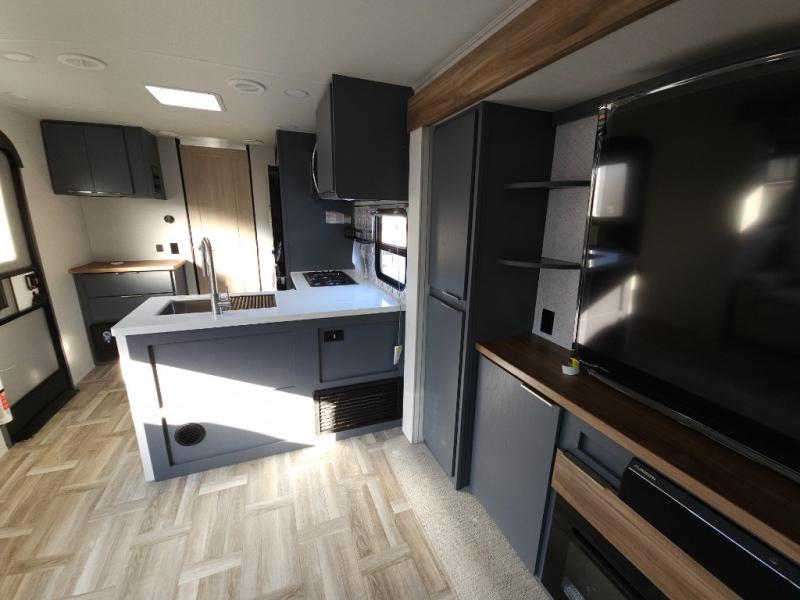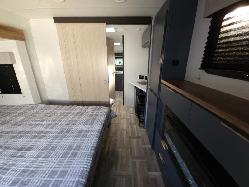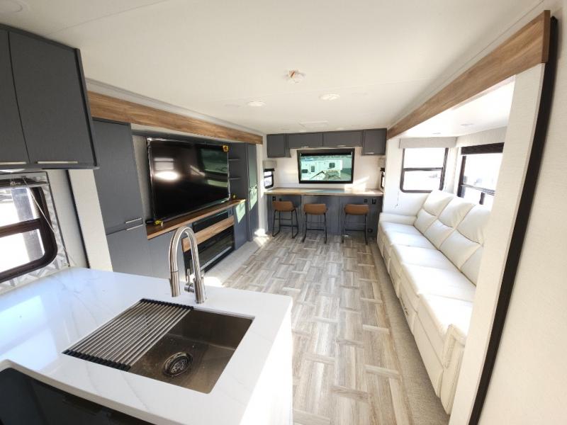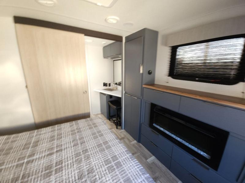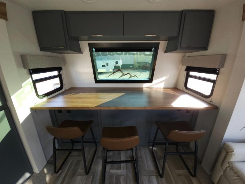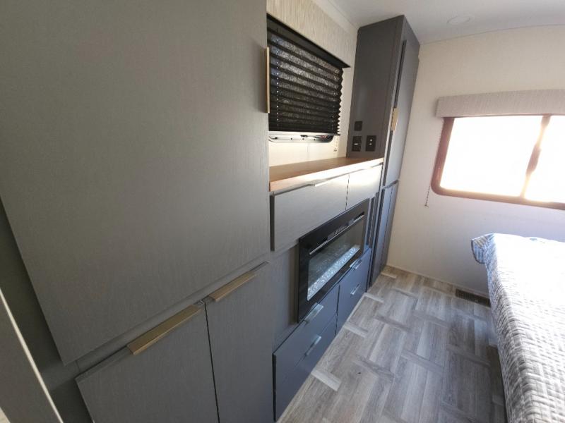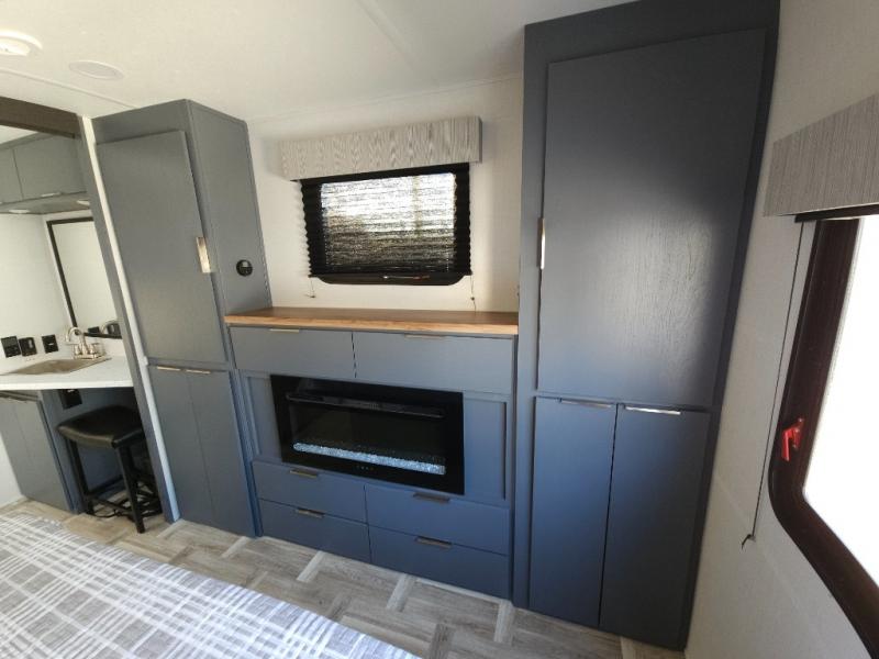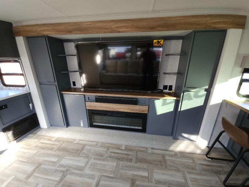 This Lacrosse travel trailer is made for entertaining! The living room is a standout with its unique bar seating at the large front window. This is perfect for eating and drinking, or use it as desk space to work from the road. The sofa sits in its own slide out for extra comfort, and has a great view of the enormous entertainment center with fireplace and 70" TV. A second fireplace warms up the rear bedroom, which also features a king bed slide for maximum floor space. There's a full bath, a well-equipped kitchen, and plenty of storage space. Invite your friends along for a great time!