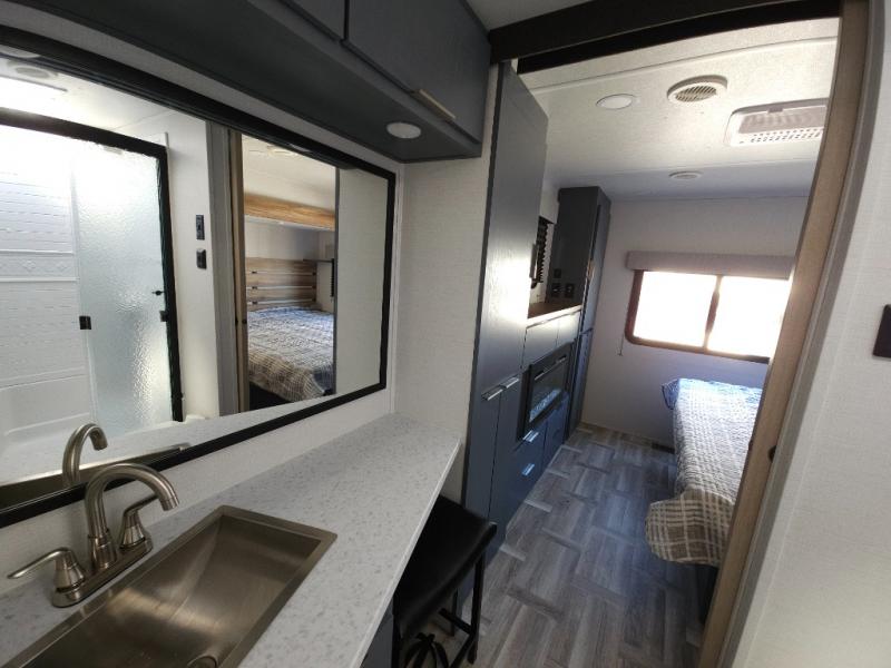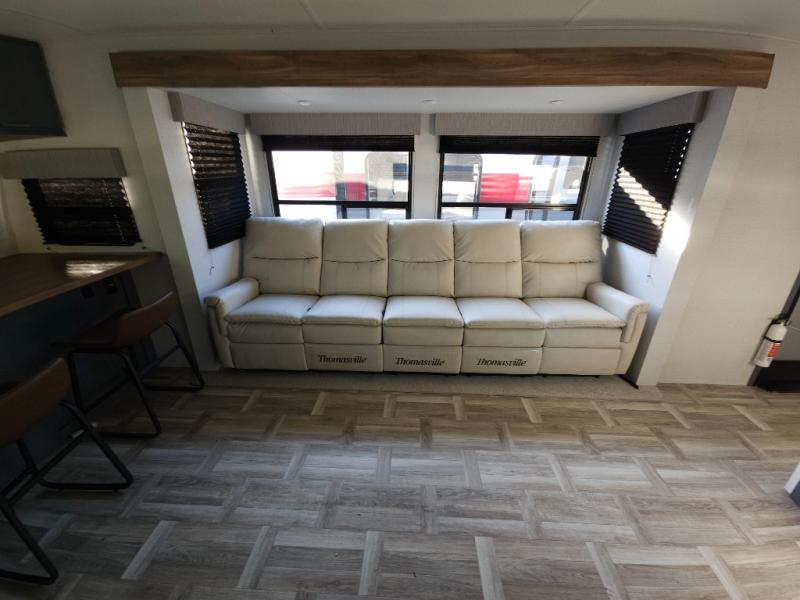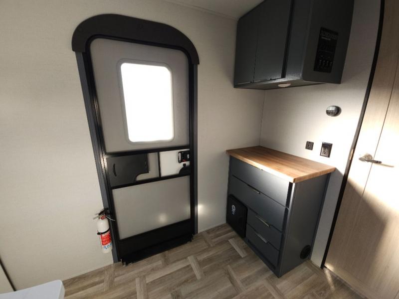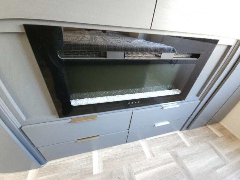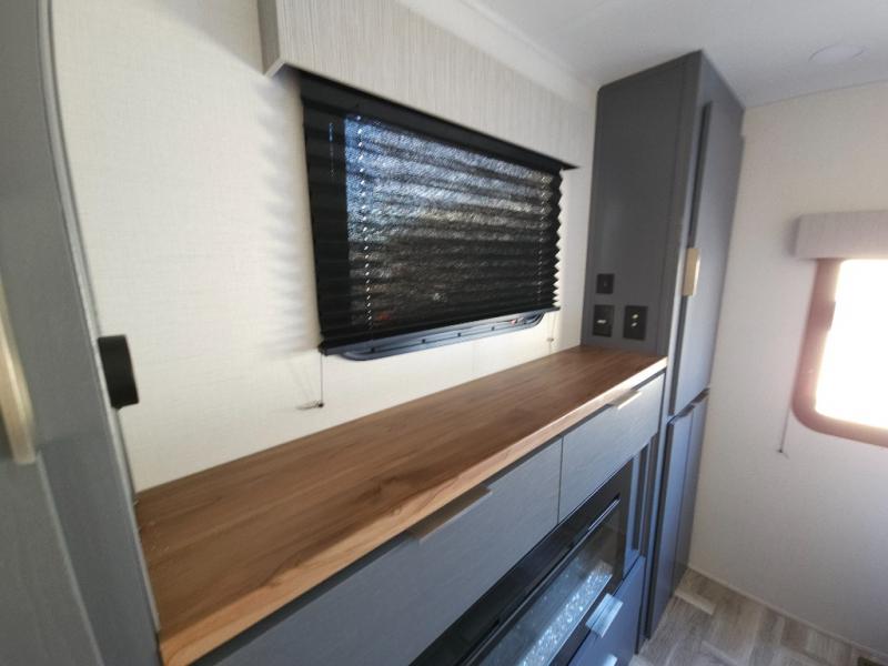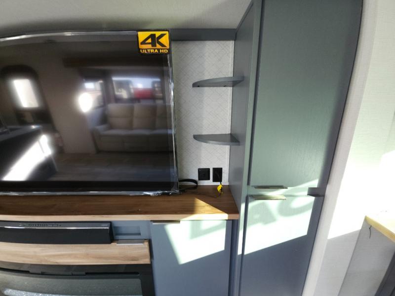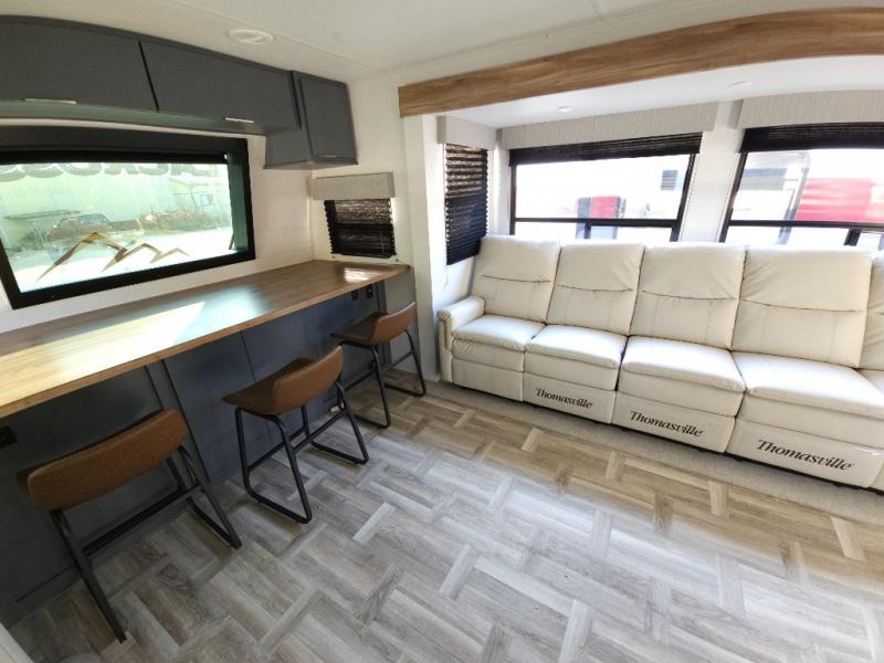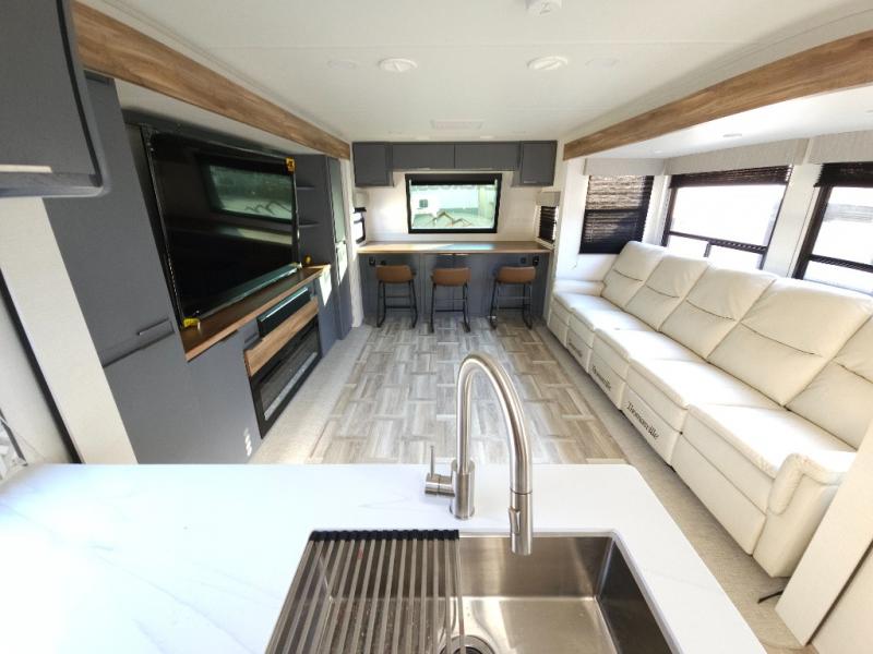 This Lacrosse travel trailer is made for entertaining! The living room is a standout with its unique bar seating at the large front window. This is perfect for eating and drinking, or use it as desk space to work from the road. The sofa sits in its own slide out for extra comfort, and has a great view of the enormous entertainment center with fireplace and 70" TV. A second fireplace warms up the rear bedroom, which also features a king bed slide for maximum floor space. There's a full bath, a well-equipped kitchen, and plenty of storage space. Invite your friends along for a great time!