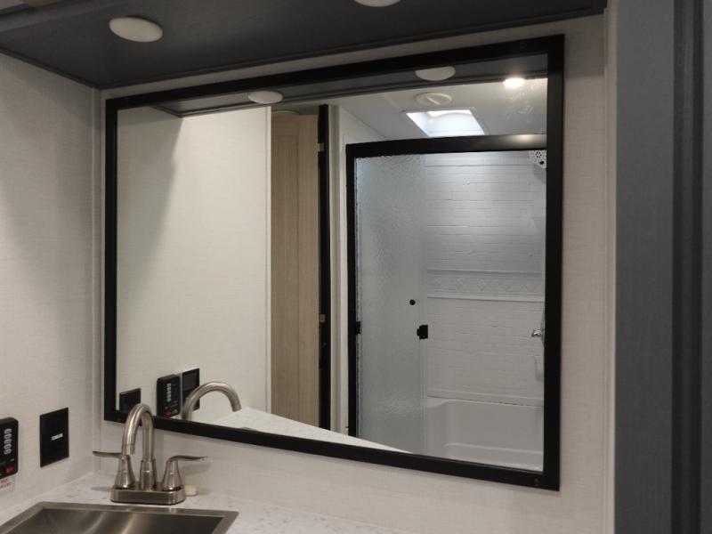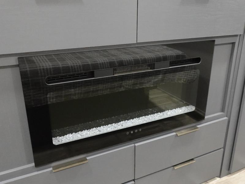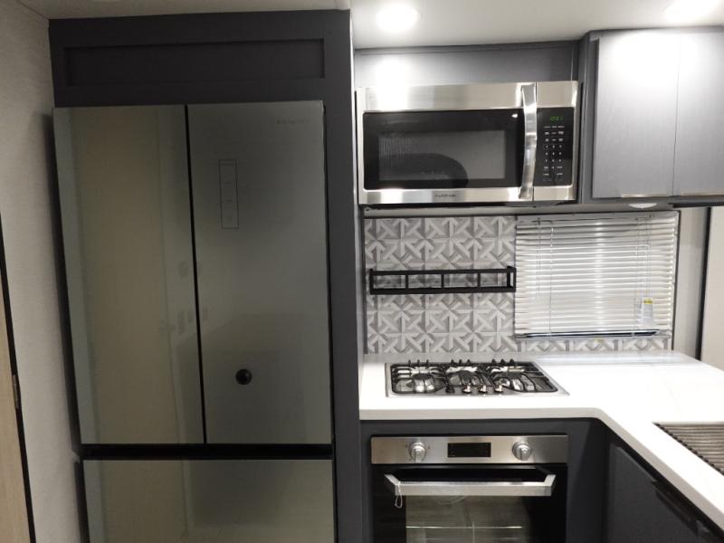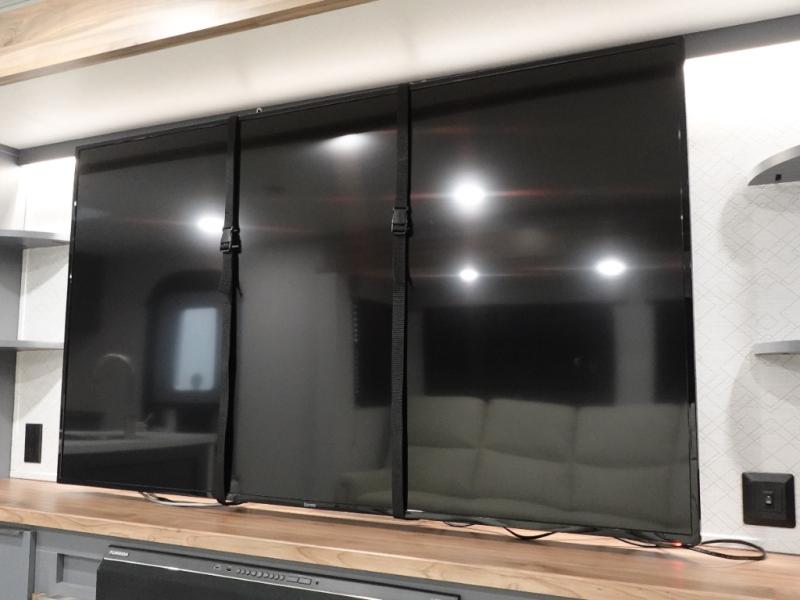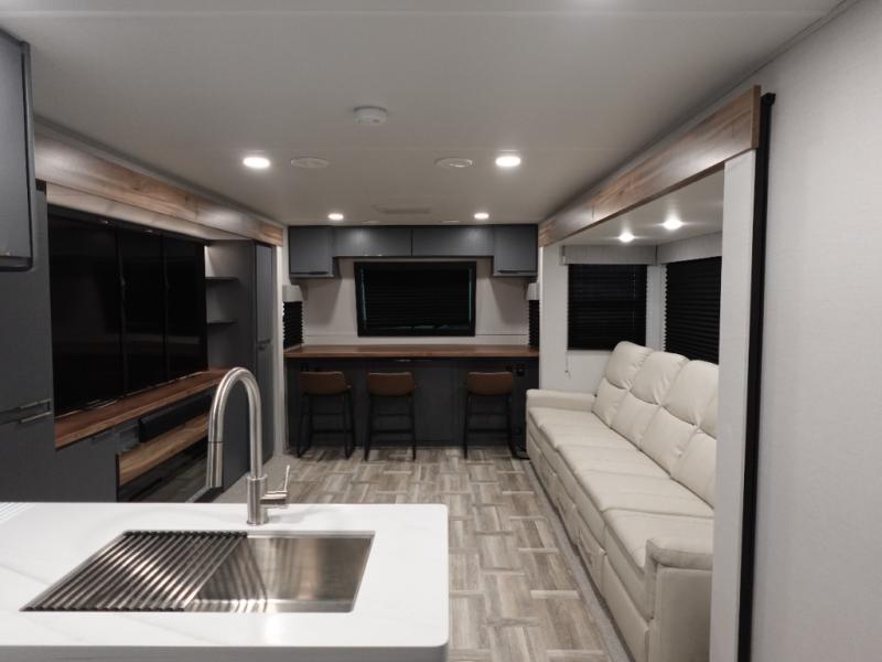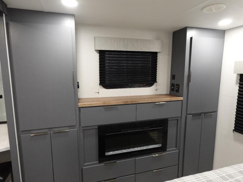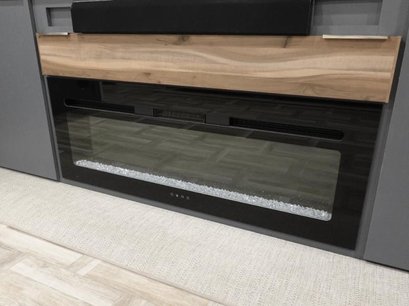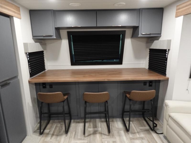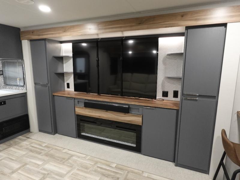 This Lacrosse travel trailer is made for entertaining! The living room is a standout with its unique bar seating at the large front window. This is perfect for eating and drinking, or use it as desk space to work from the road. The sofa sits in its own slide out for extra comfort, and has a great view of the enormous entertainment center with fireplace and 70" TV. A second fireplace warms up the rear bedroom, which also features a king bed slide for maximum floor space. There's a full bath, a well-equipped kitchen, and plenty of storage space. Invite your friends along for a great time!
