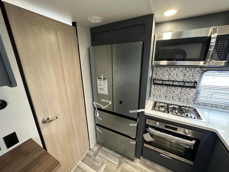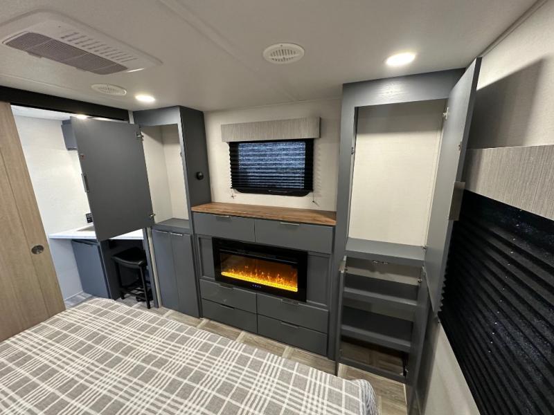 This Lacrosse travel trailer is made for entertaining! The living room is a standout with its unique bar seating at the large front window. This is perfect for eating and drinking, or use it as desk space to work from the road. The sofa sits in its own slide out for extra comfort, and has a great view of the enormous entertainment center with fireplace and 70" TV. A second fireplace warms up the rear bedroom, which also features a king bed slide for maximum floor space. There's a full bath, a well-equipped kitchen, and plenty of storage space. Invite your friends along for a great time!