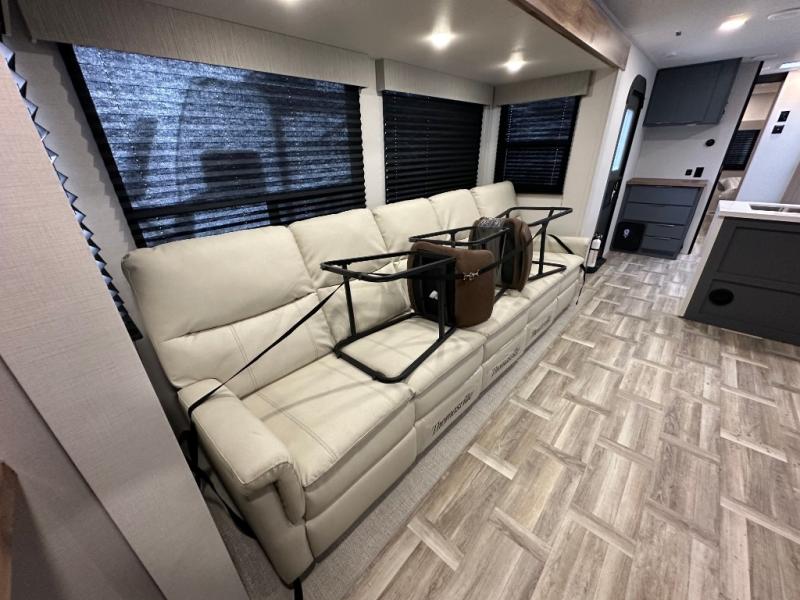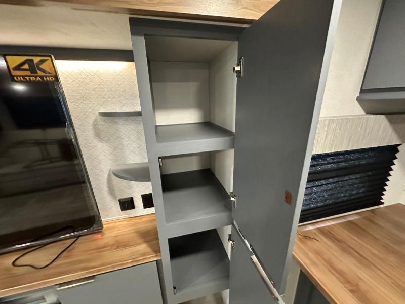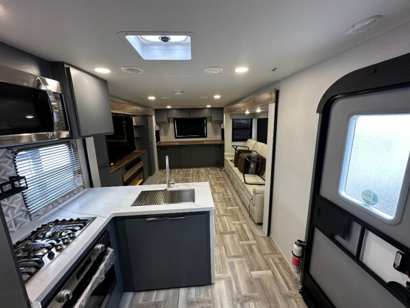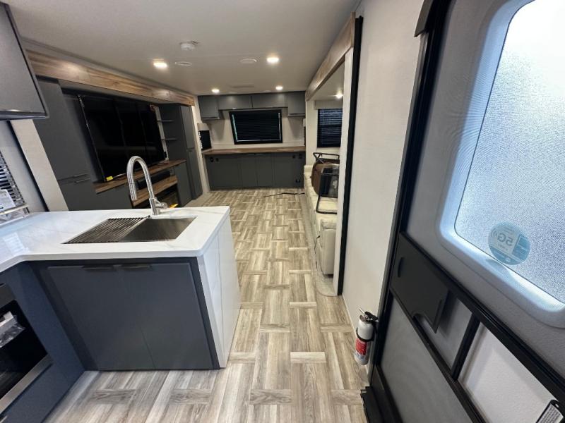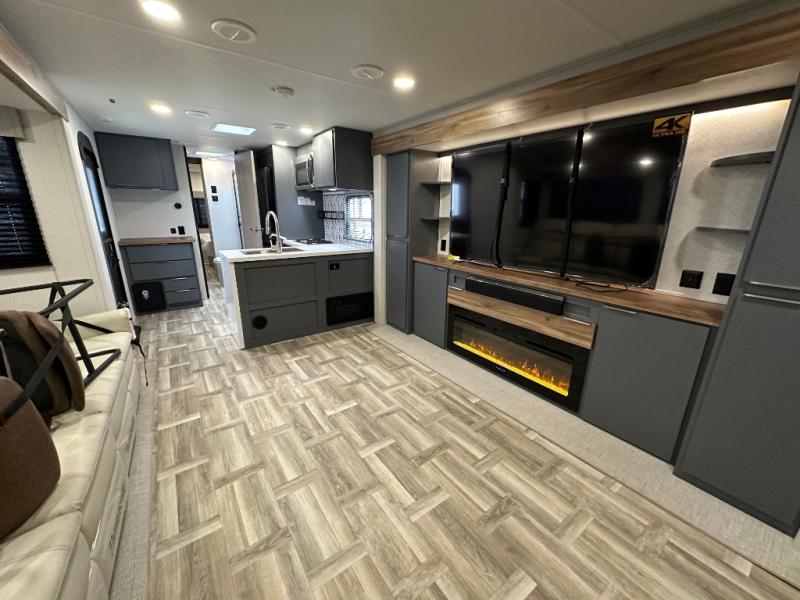 This Lacrosse travel trailer is made for entertaining! The living room is a standout with its unique bar seating at the large front window. This is perfect for eating and drinking, or use it as desk space to work from the road. The sofa sits in its own slide out for extra comfort, and has a great view of the enormous entertainment center with fireplace and 70" TV. A second fireplace warms up the rear bedroom, which also features a king bed slide for maximum floor space. There's a full bath, a well-equipped kitchen, and plenty of storage space. Invite your friends along for a great time!